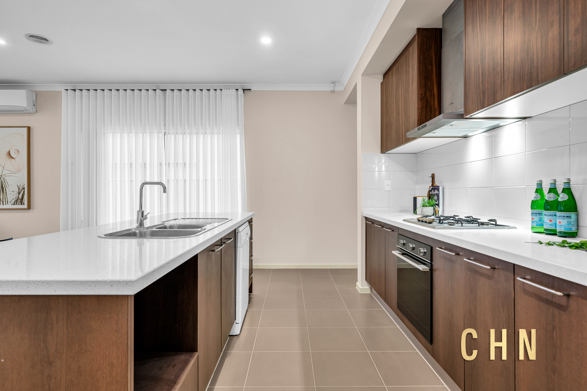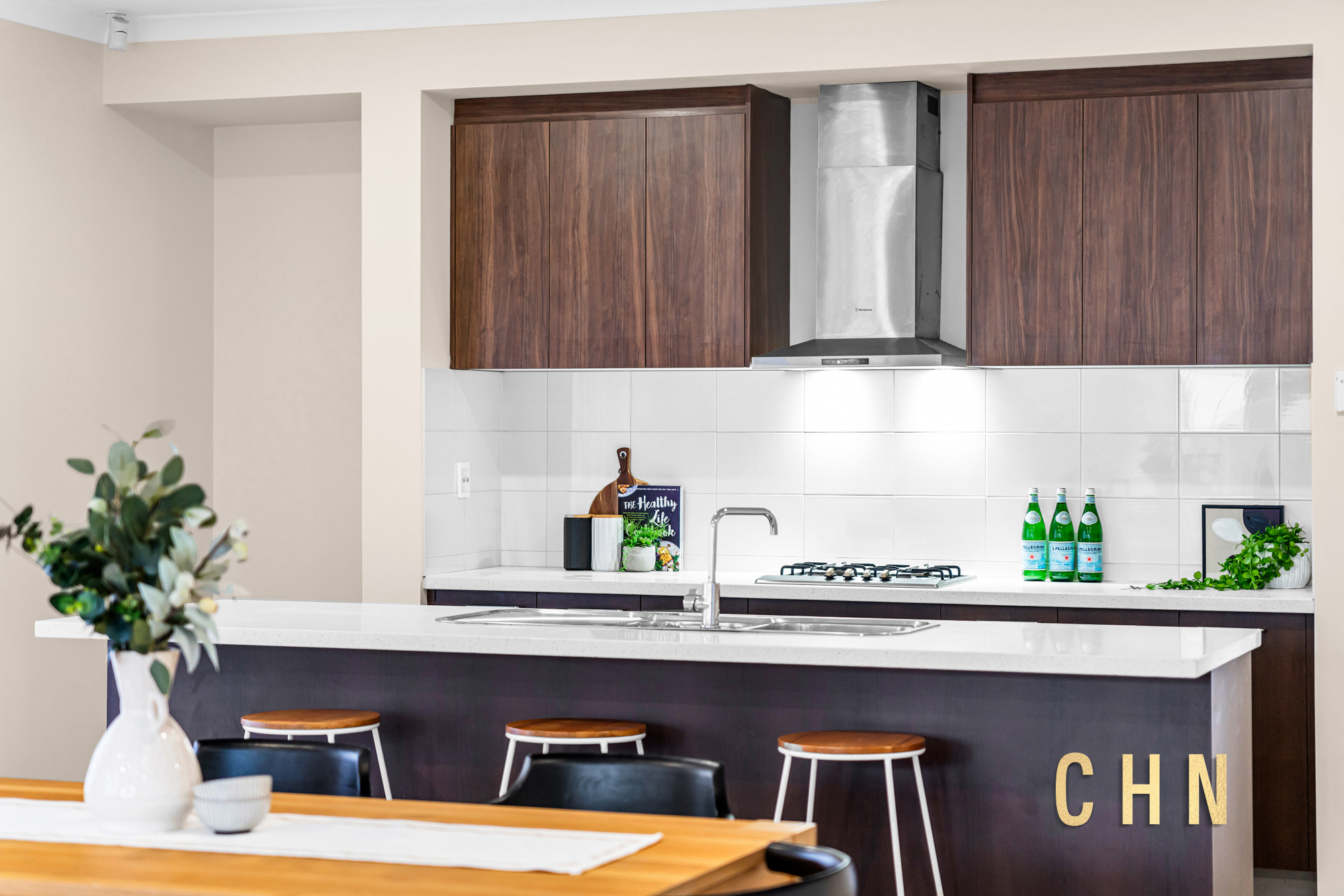 A well-appointed kitchen serves as the heart of the home — complete with thick stone benchtops, a large island breakfast bar, gas cooktop, dishwasher, tiled splashback, and built-in pantry for ample storage.