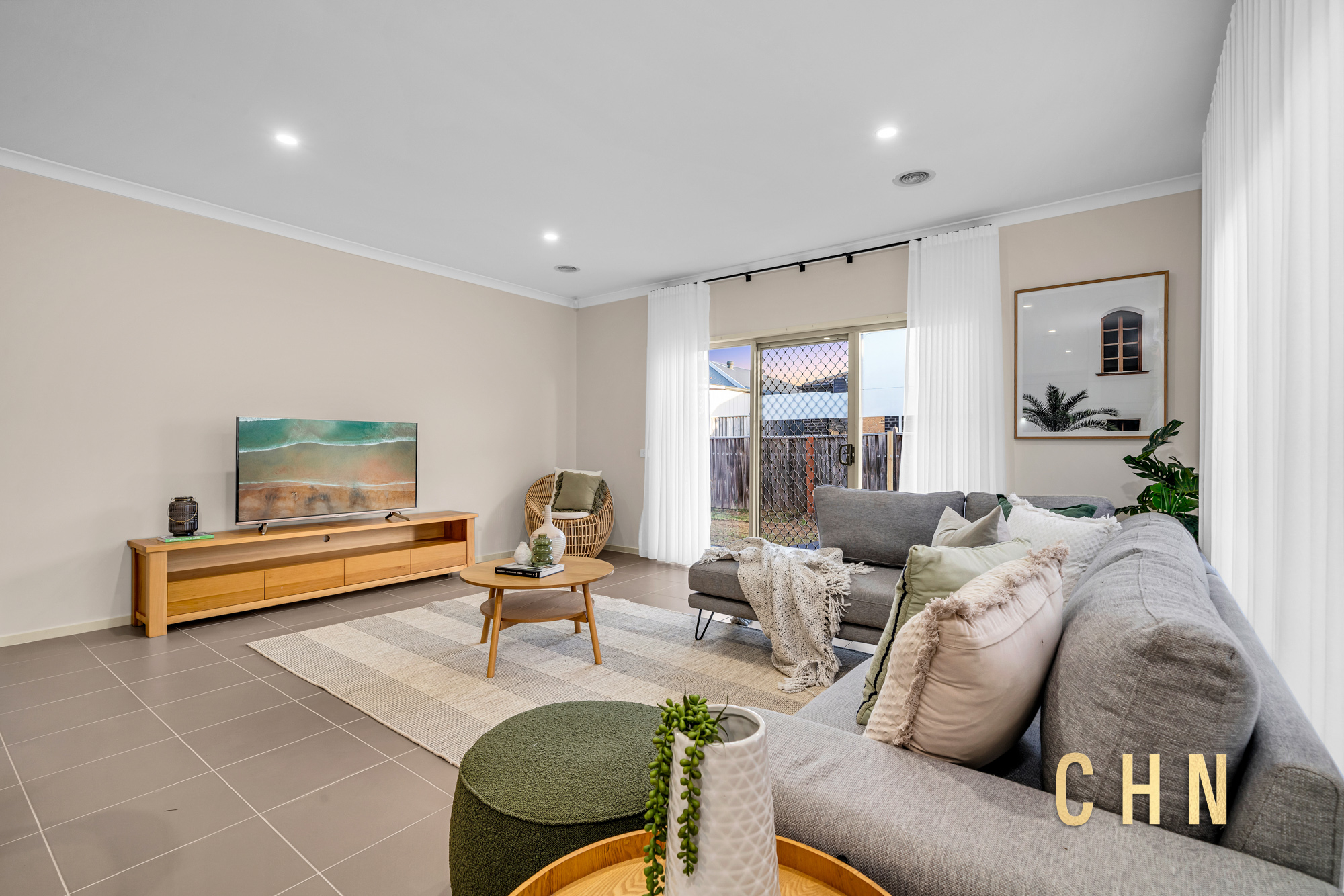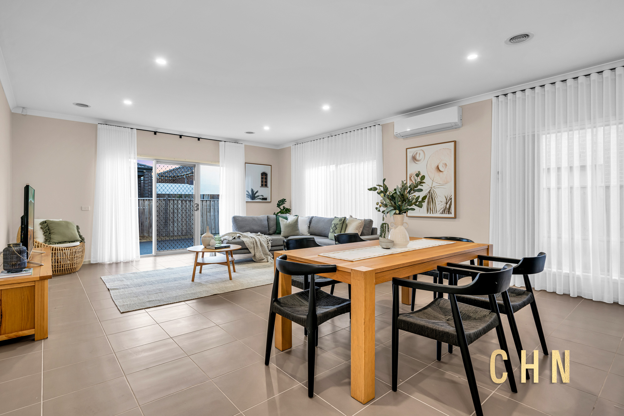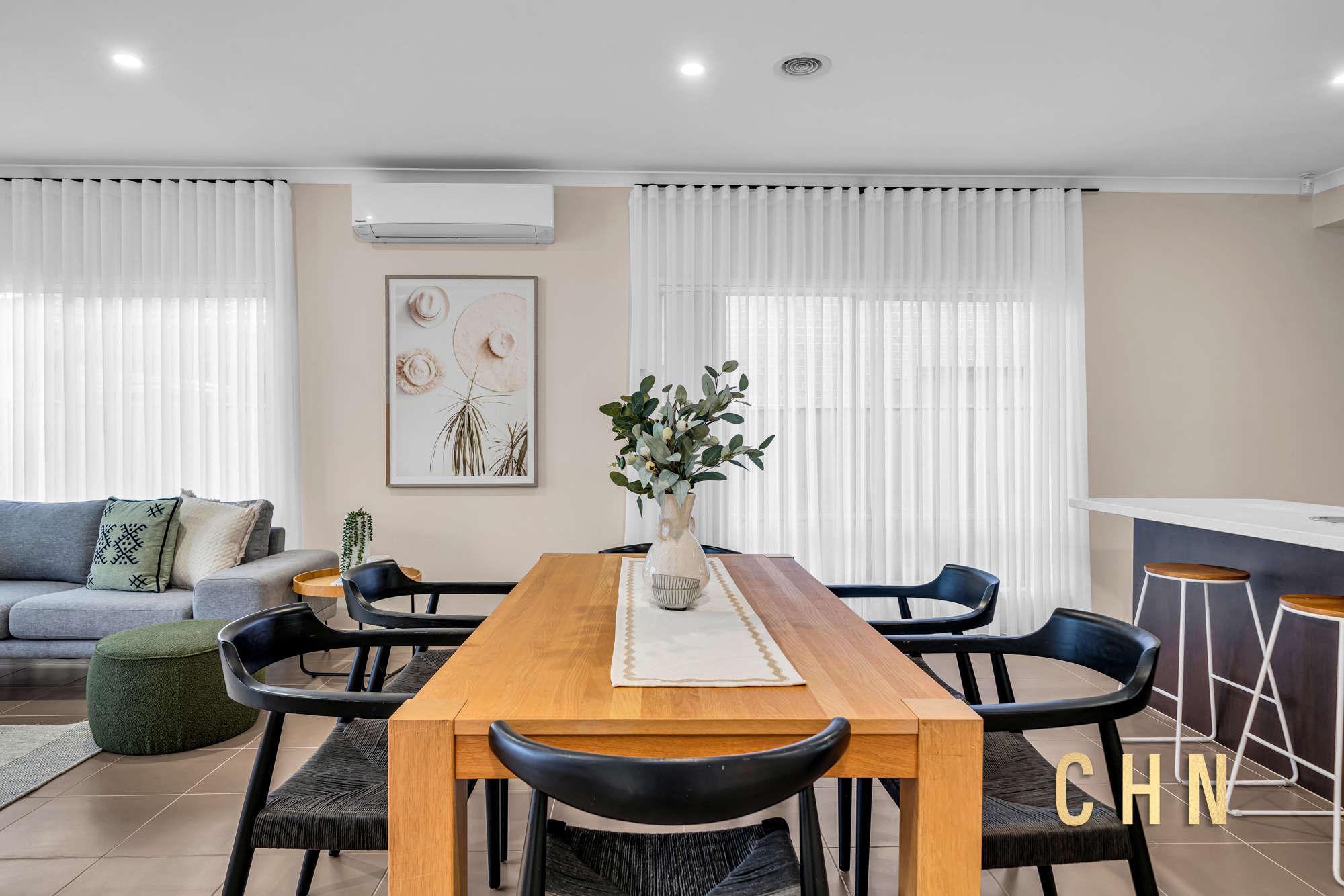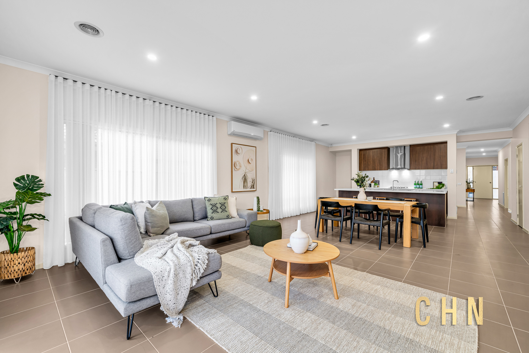 The light-filled central lounge or theatre room provides an additional living zone, while the spacious open-plan living and dining area is surrounded by tall windows dressed with sheer curtains, creating an inviting atmosphere.