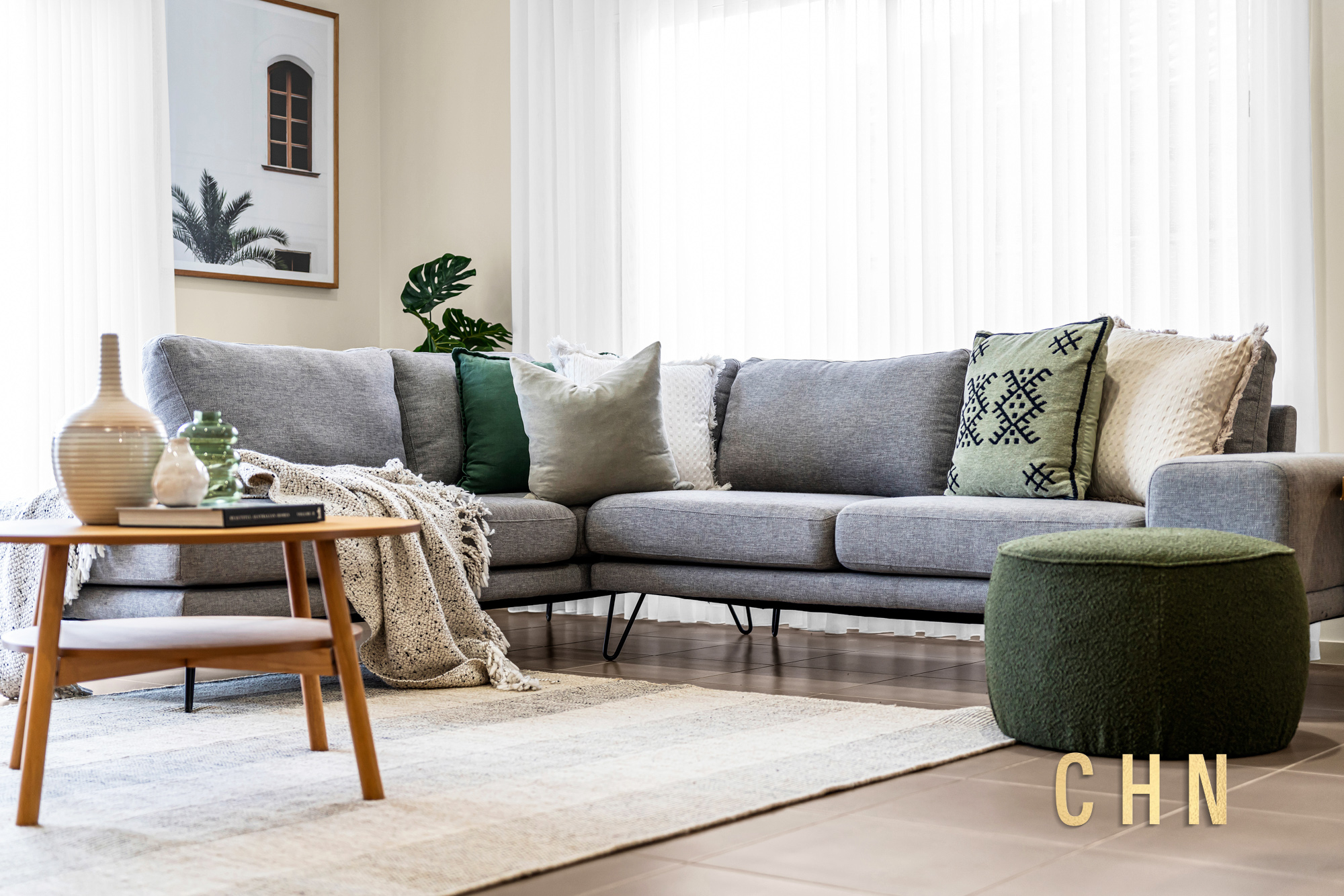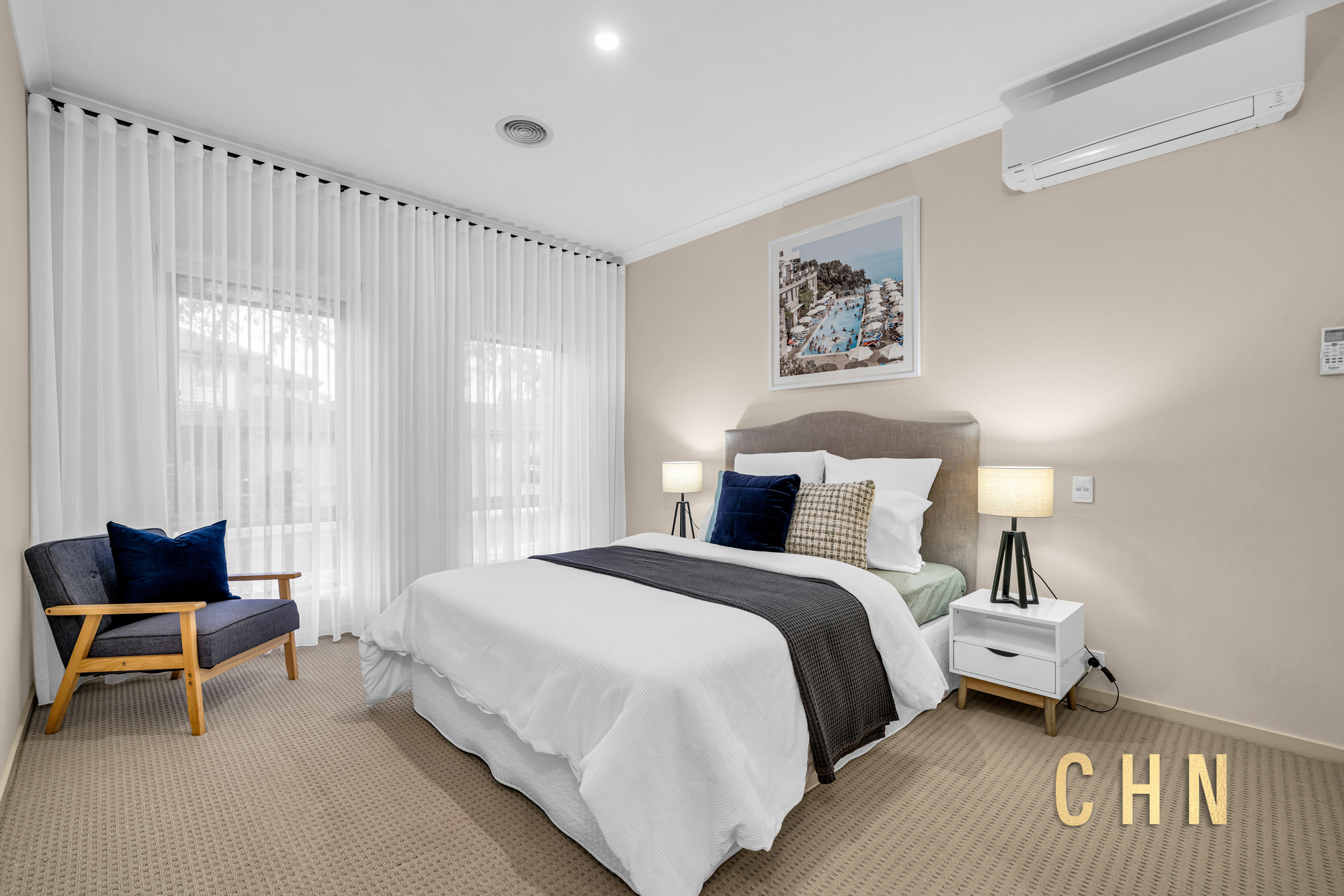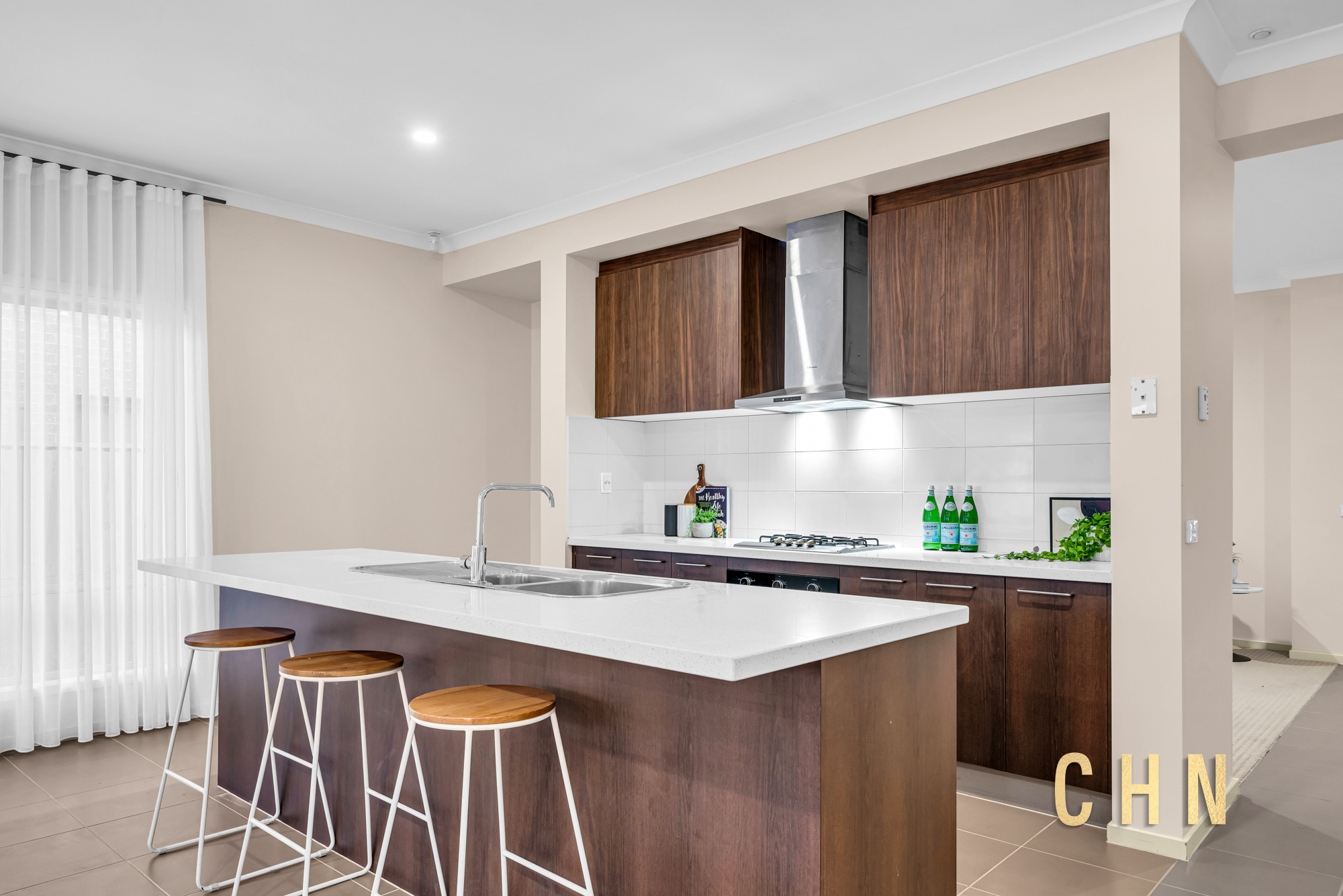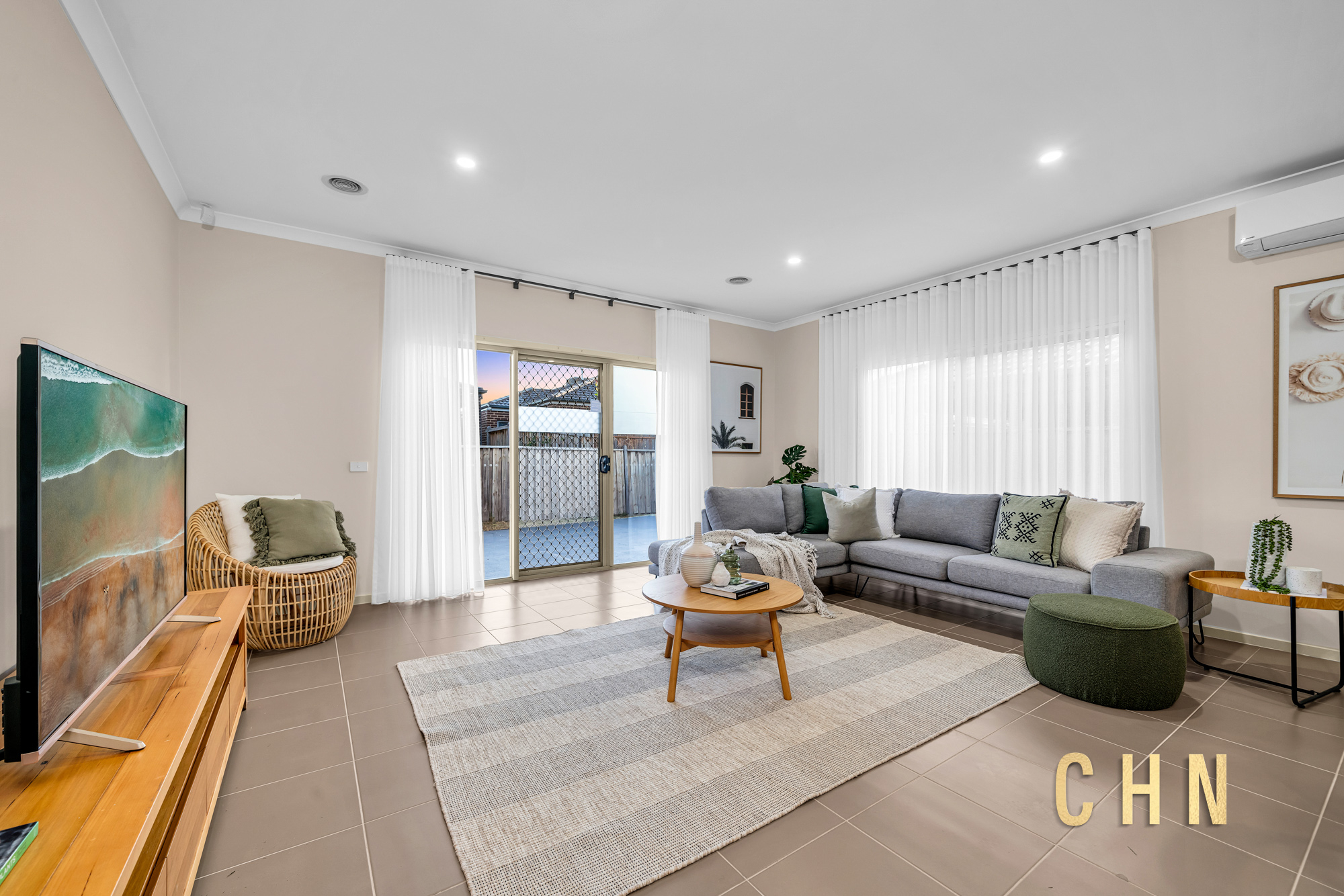 The light-filled central lounge or theatre room provides an additional living zone, while the spacious open-plan living and dining area is surrounded by tall windows dressed with sheer curtains, creating an inviting atmosphere.