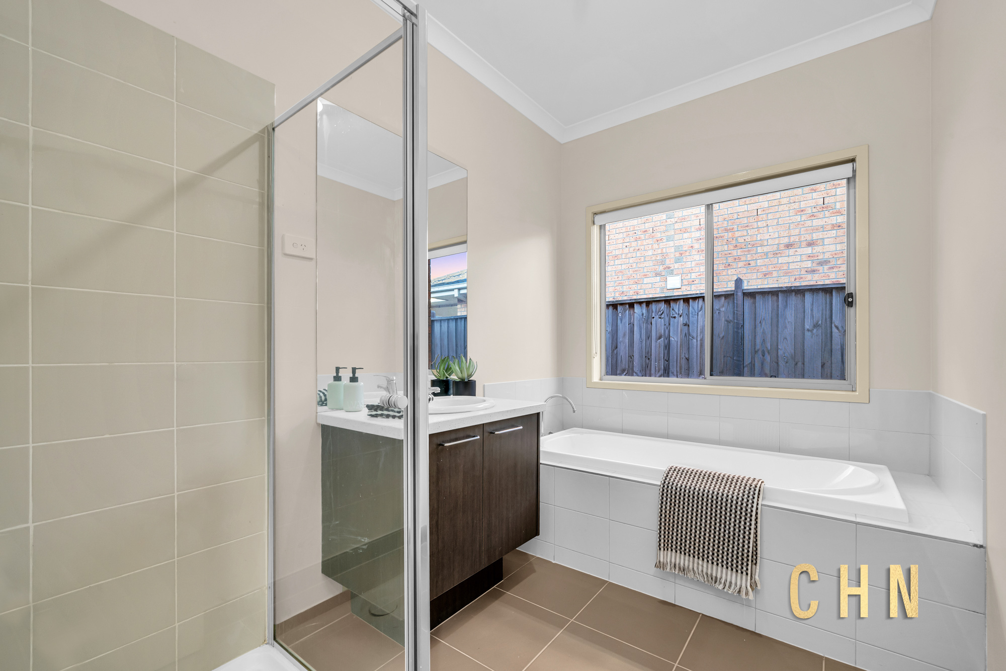 Additional bedrooms are generously sized with built-in robes, serviced by a sparkling central bathroom featuring a bathtub, walk-in shower, and stone benchtop vanity.