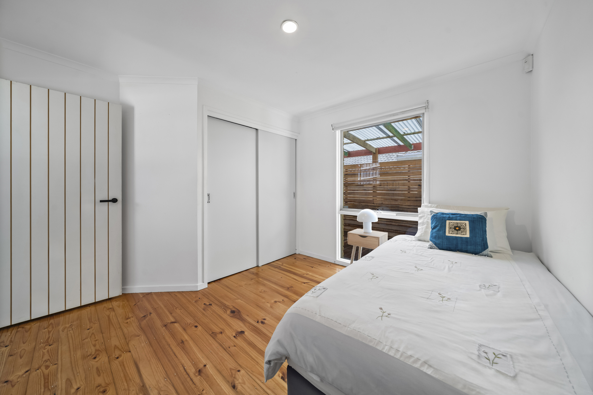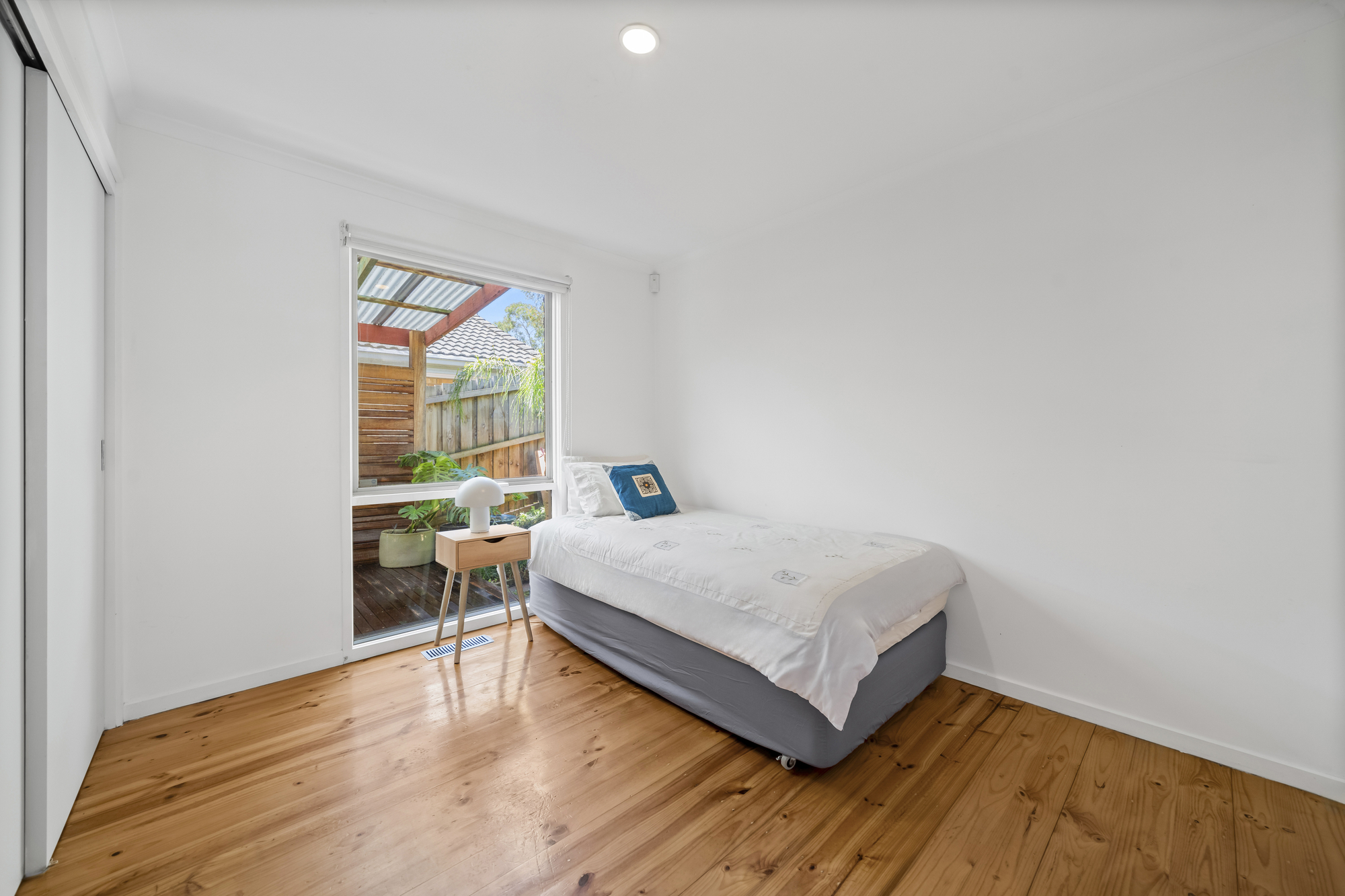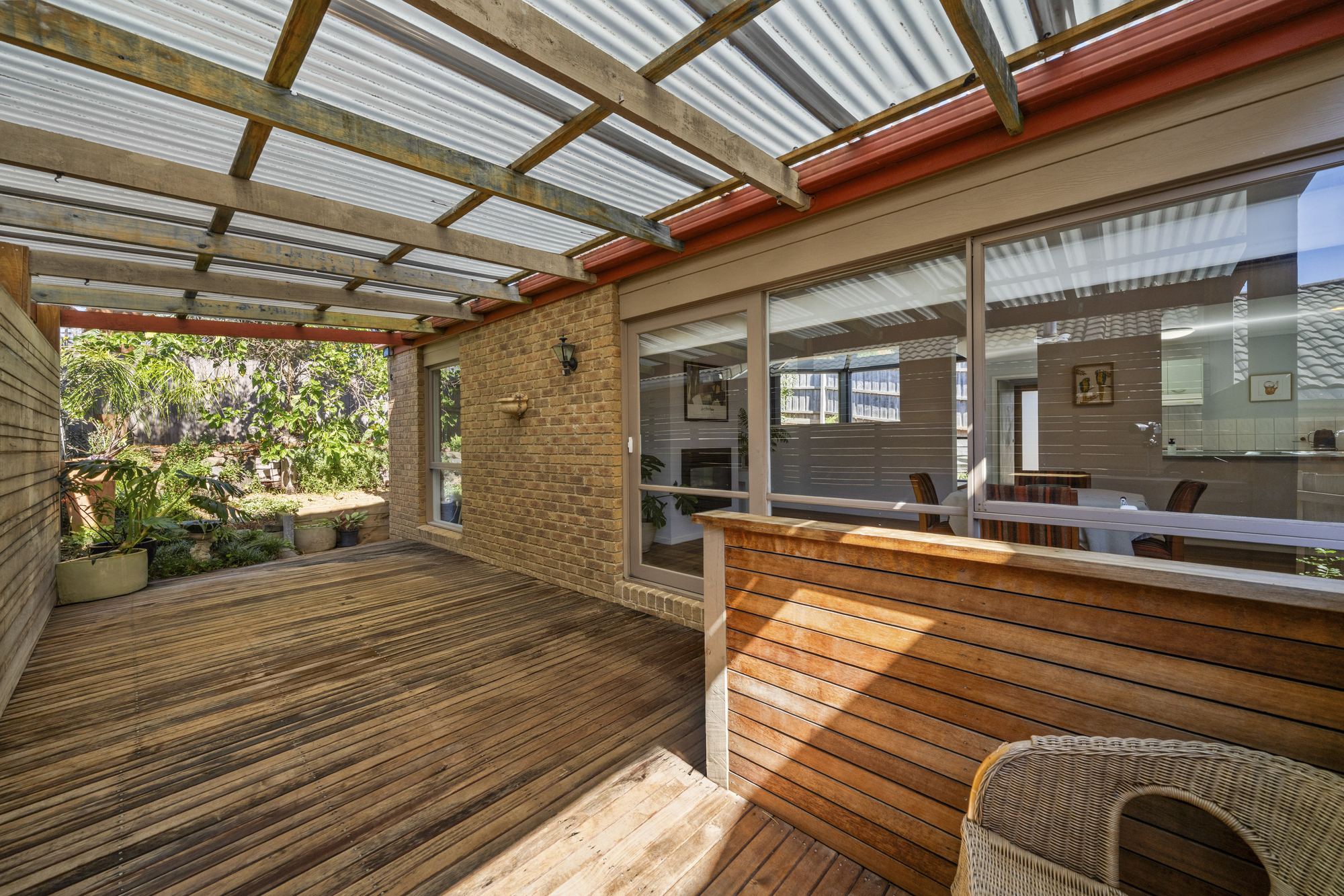 Outdoor entertaining is well catered for with a covered timber deck seamlessly extending from the main living area. This inviting alfresco space is perfect for dining and relaxed gatherings, overlooking a private, established garden with raised beds, greenery, and secure fencing. The deck’s polished timber finish adds warmth and character, while the yard offers space suitable for children or pets.