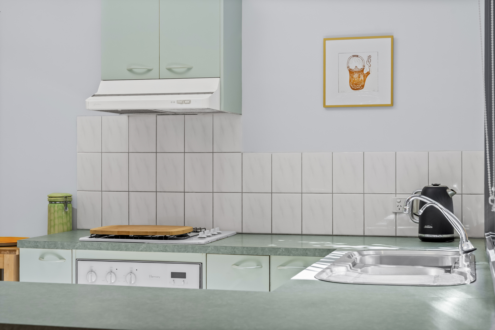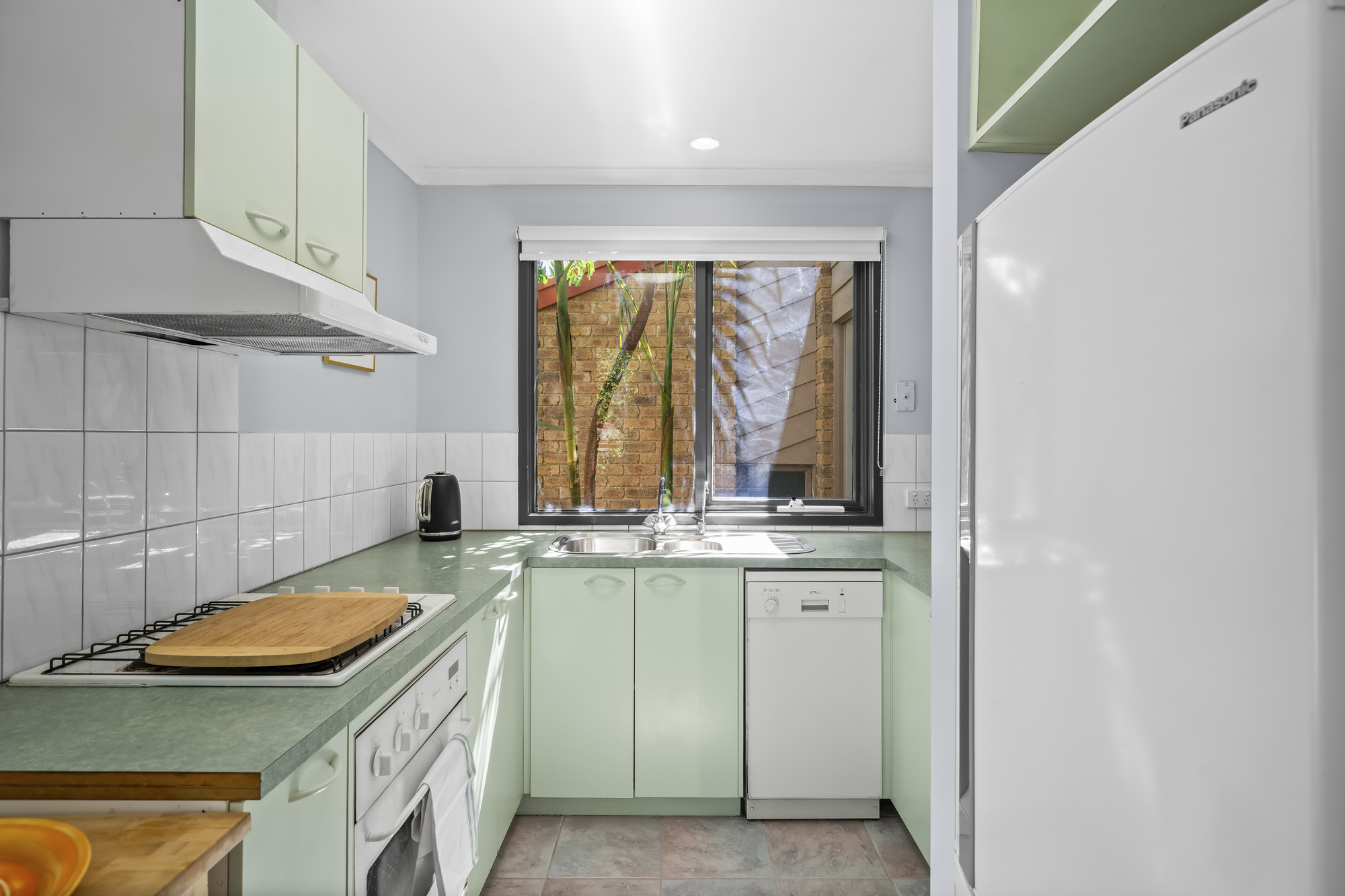 The kitchen is practical and well-appointed, featuring a U-shaped layout with a Simpson gas cooktop and oven, laminate benchtops, tiled splashback, overhead rangehood, and ample storage. A window above the sink provides natural light and leafy garden outlooks, supporting everyday functionality.