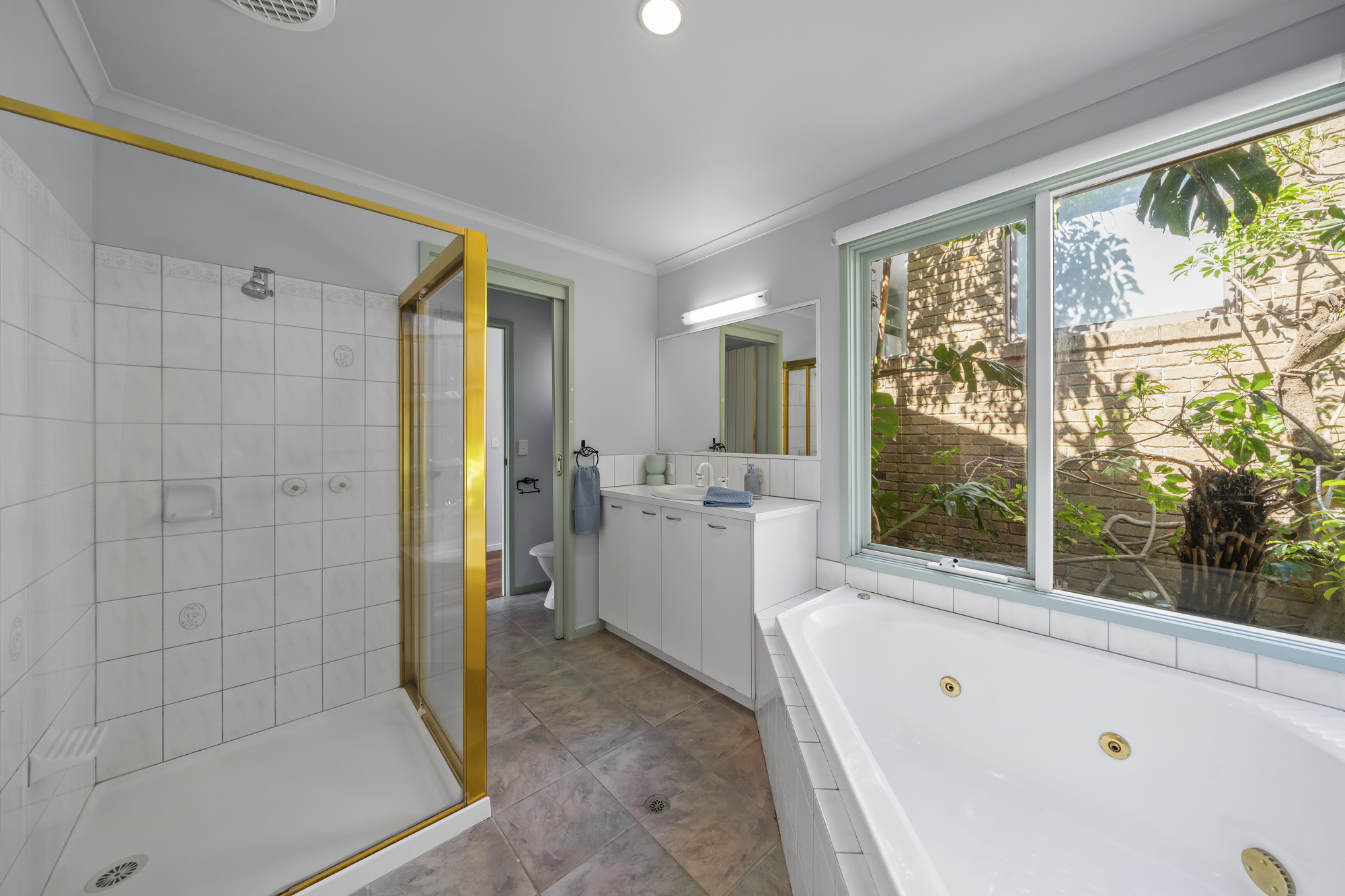 Accommodation includes two well-proportioned bedrooms, each fitted with built-in robes and direct access to a bathroom. The master bedroom enjoys a private ensuite complete with a full-size bathtub, separate shower, vanity, and toilet. The second bedroom is serviced by its own bathroom with shower, offering excellent separation and flexibility for shared living, guests, or rental use.