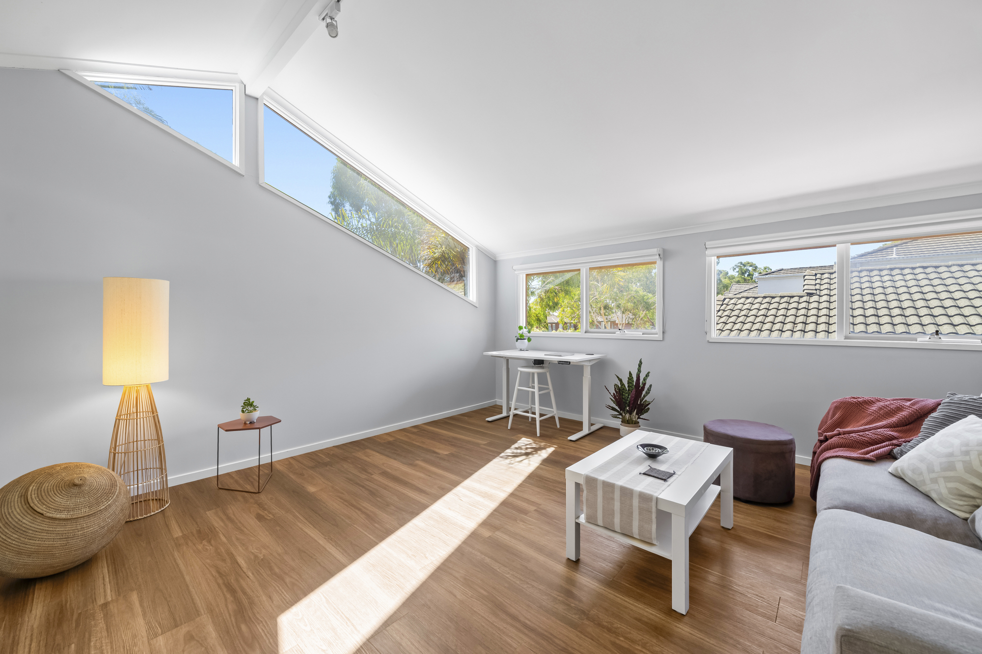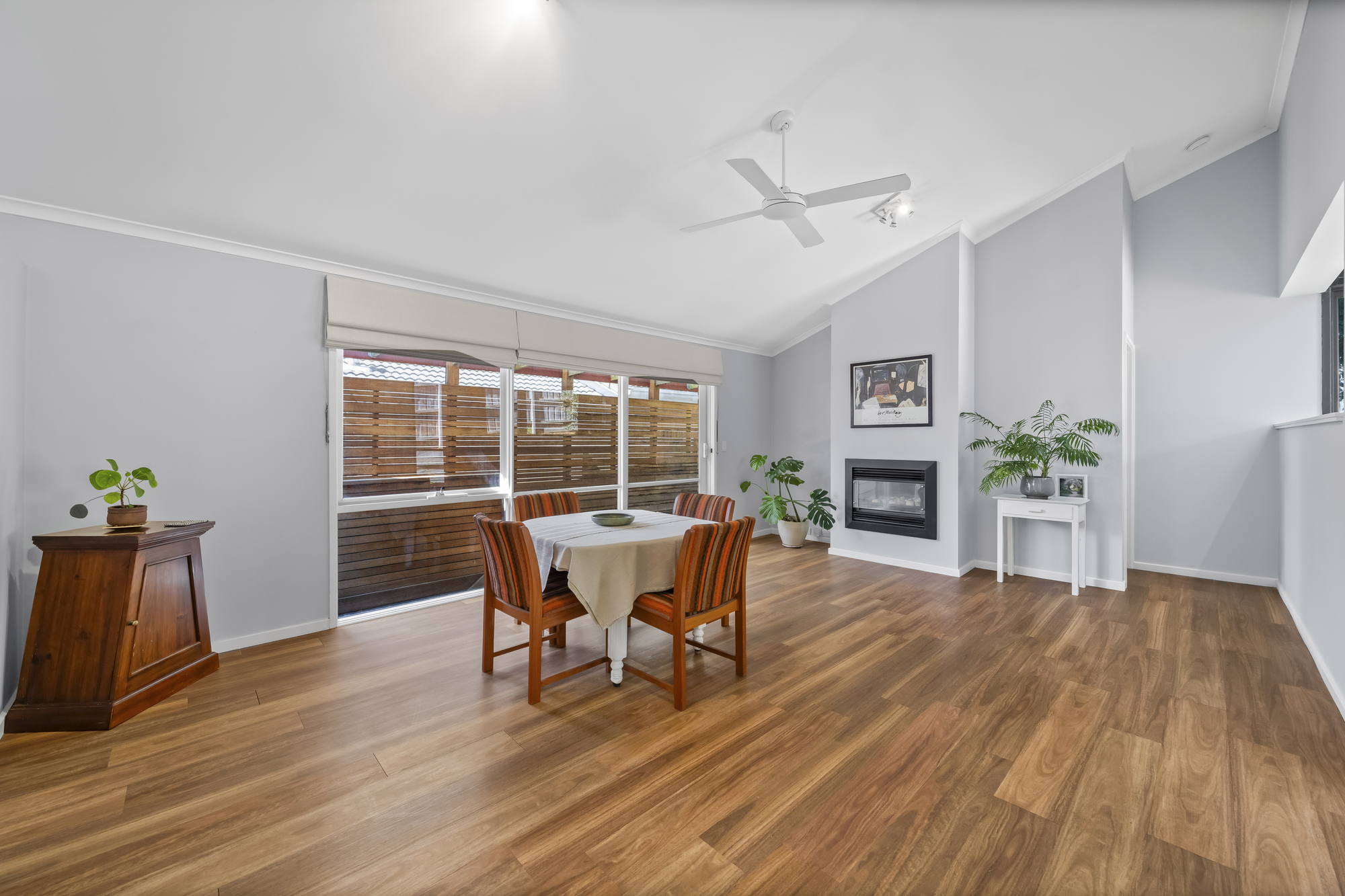 The main living and dining area is spacious and filled with natural light, enhanced by timber flooring and large sliding glass doors that open directly to the outdoor deck. Vaulted ceilings and highlight windows add architectural interest and a sense of volume, while the versatile layout comfortably accommodates both lounge and dining zones with a strong connection to the alfresco area.