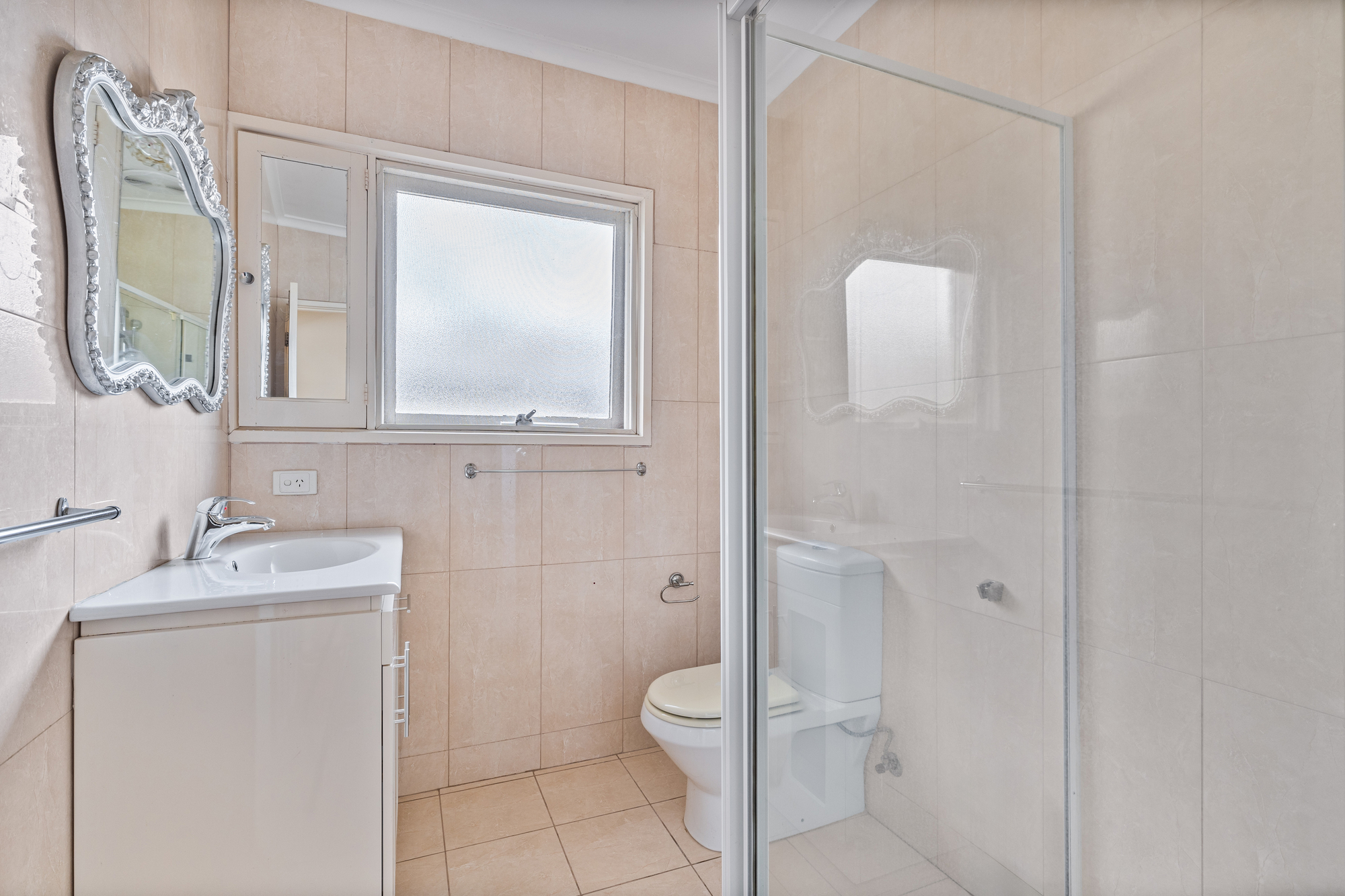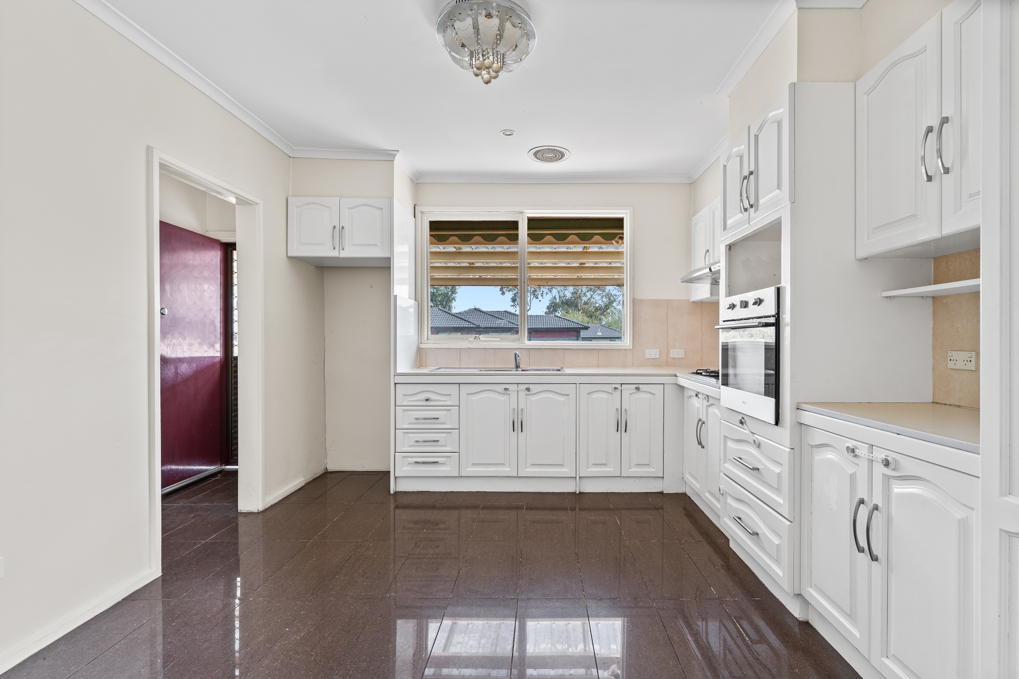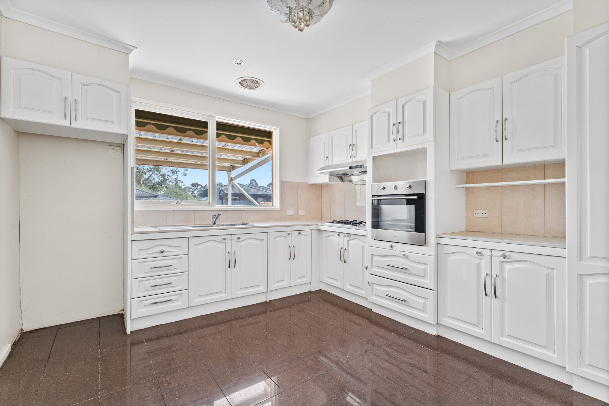 Step inside and be enthralled by the elegance of polished timber floors that lead to a bright and airy front-facing living space. Sunlight floods the room, complemented by a cosy gas heater, and a harmonious balance of ducted heating and evaporative cooling ensures comfort throughout the seasons. The heart of the home is the kitchen, exuding cottage charm with gleaming floor tiling and quaint cabinetry.