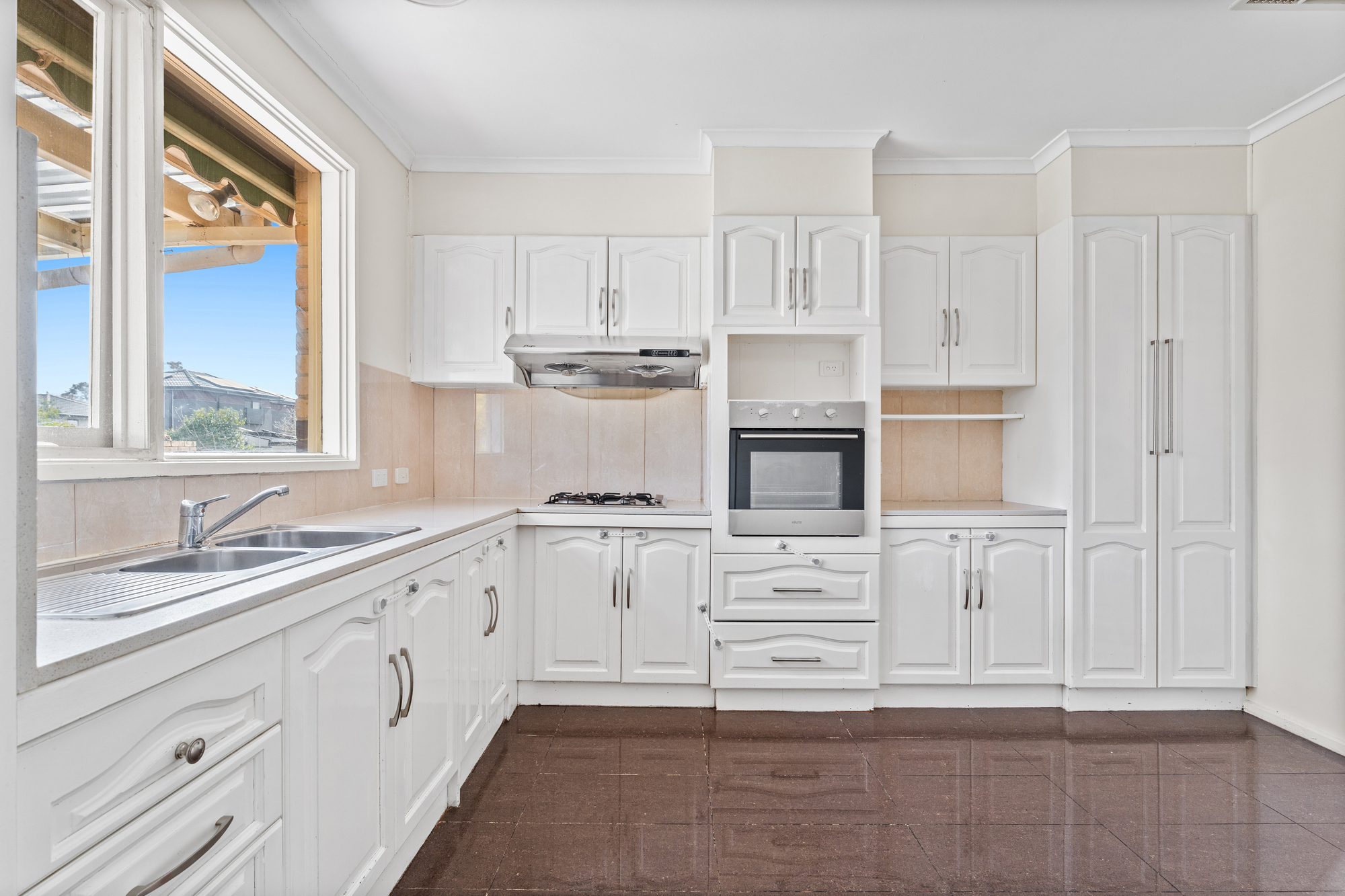 Envision yourself preparing meals while admiring the backyard vistas. The kitchen effortlessly accommodates casual meals, while the stainless steel gas appliances and wall oven make cooking a joy. Conveniently accessible from the kitchen, the laundry features a separate toilet, adding to the home’s functionality. Three generously sized bedrooms, each offering a haven of comfort, await. Whether it’s the master retreat with its own in-built robe, or the other well-appointed bedrooms, you’ll find peace and solace in every corner while the central bathroom offers a neat and practical space, complete with a shower and toilet.