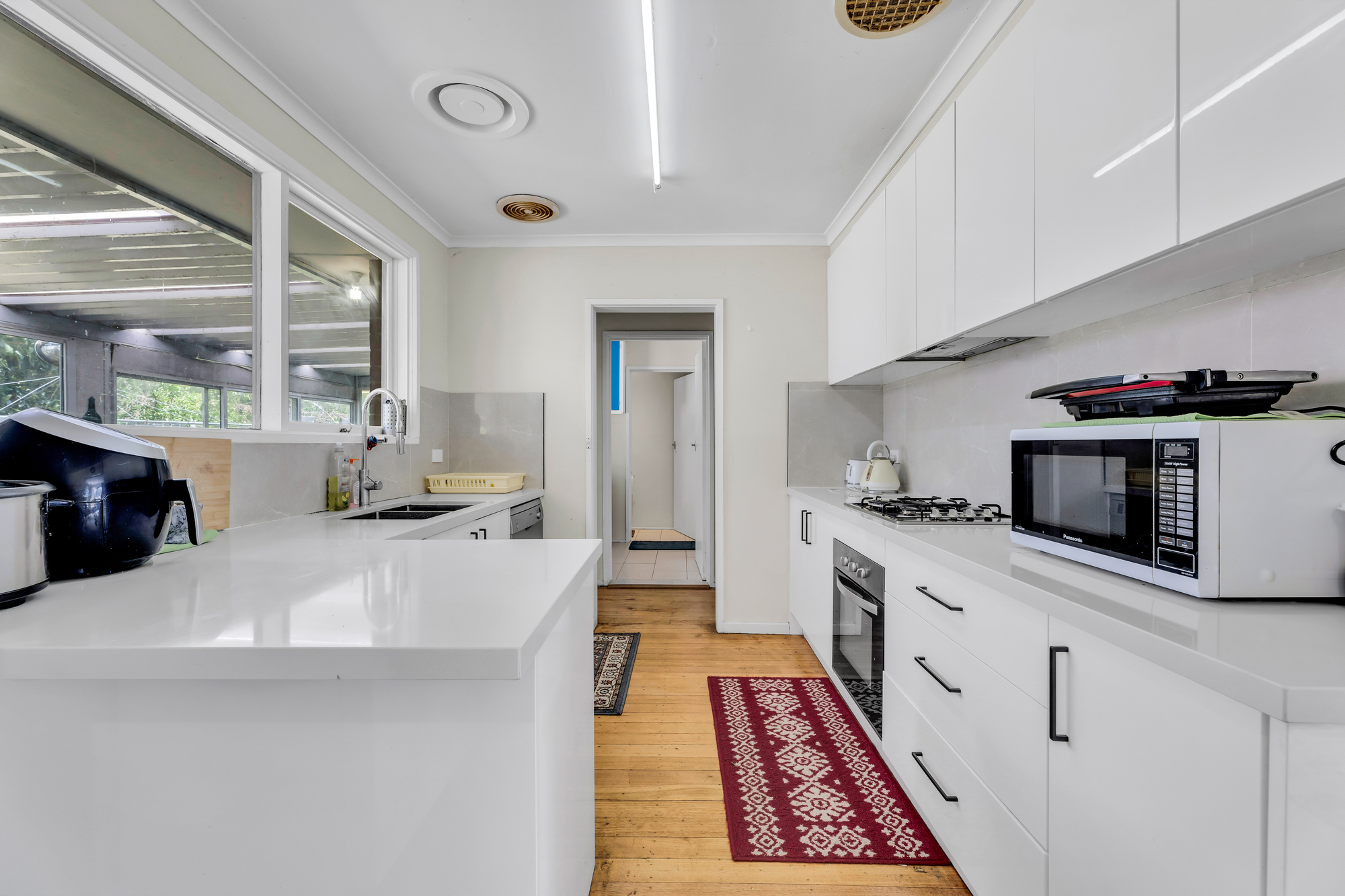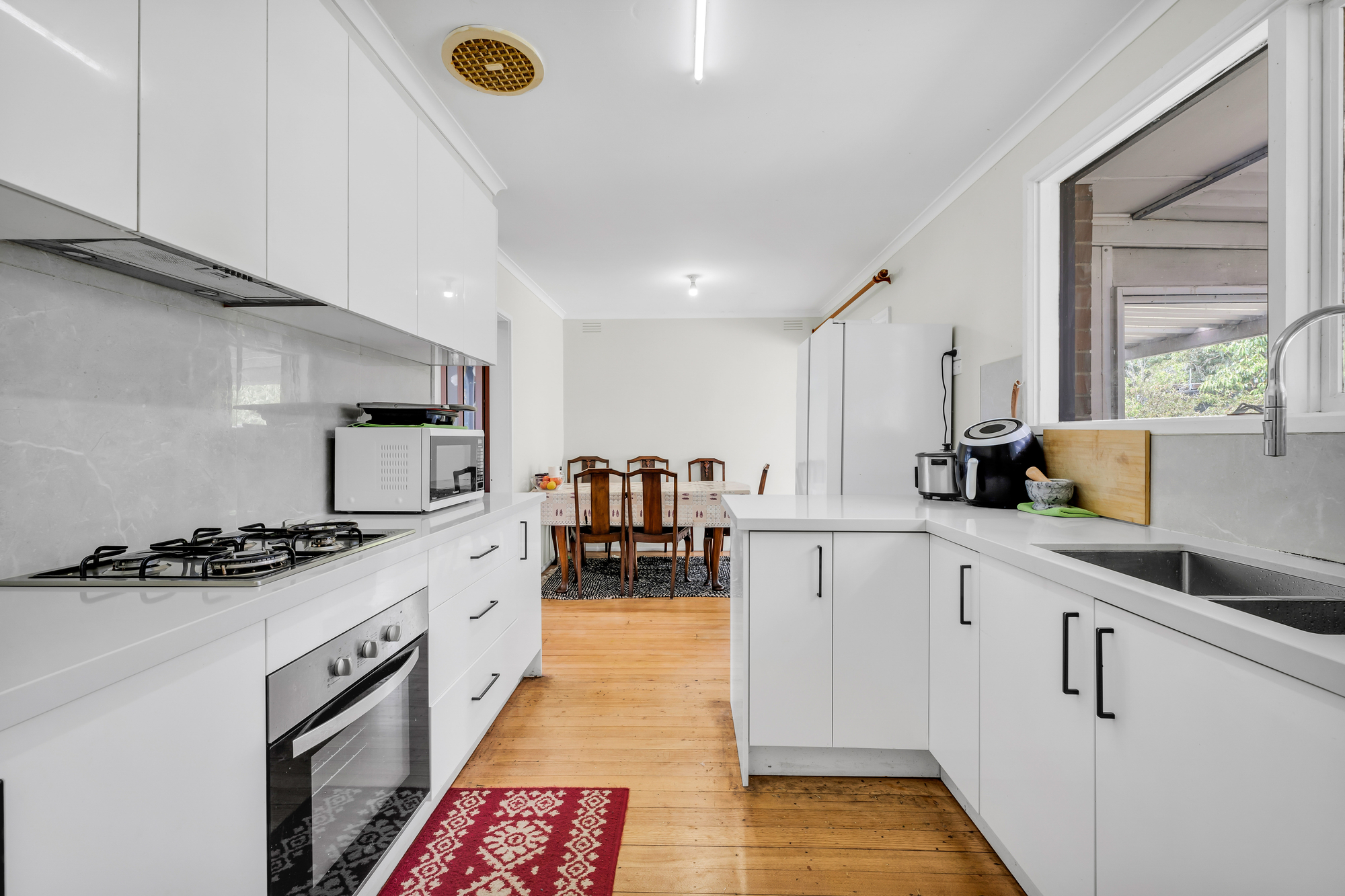 Stepping inside, you are welcomed by a bright and airy living space, where large windows invite in natural light and timber floors add warmth. The well-sized lounge is complemented by a separate dining area, providing ample room for everyday living and entertaining. A modernised kitchen offers sleek cabinetry, ample storage, a gas cooktop, oven, and Bosch dishwasher, making meal preparation both stylish and practical.