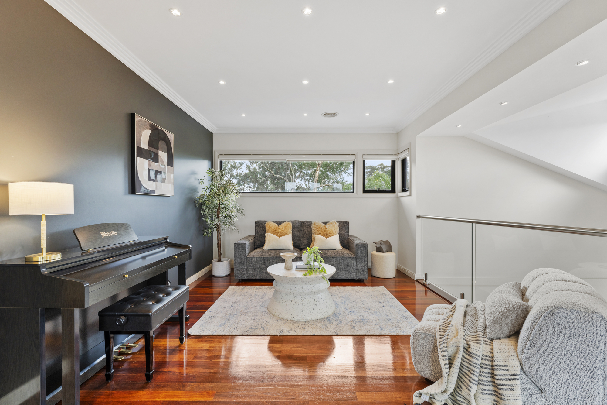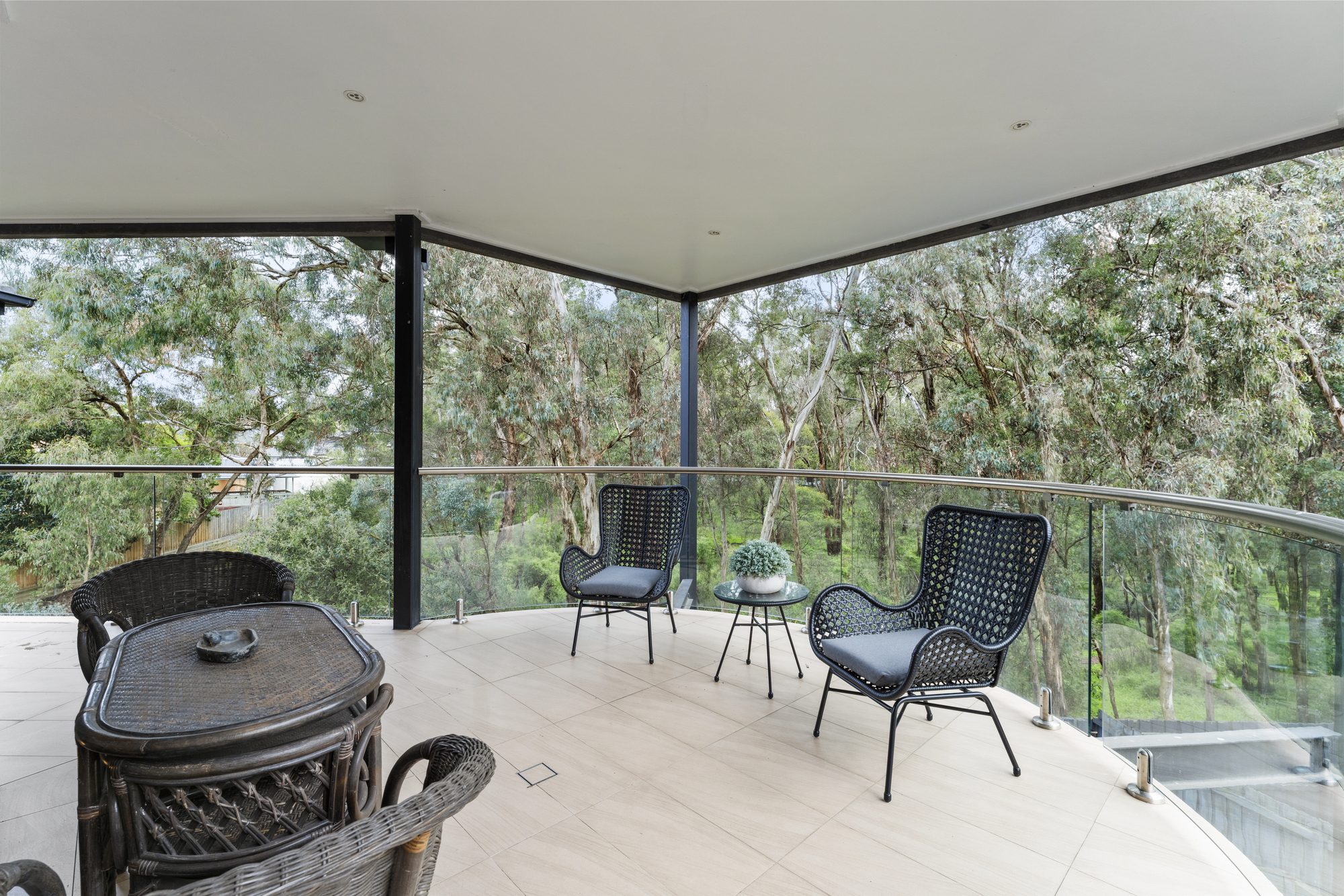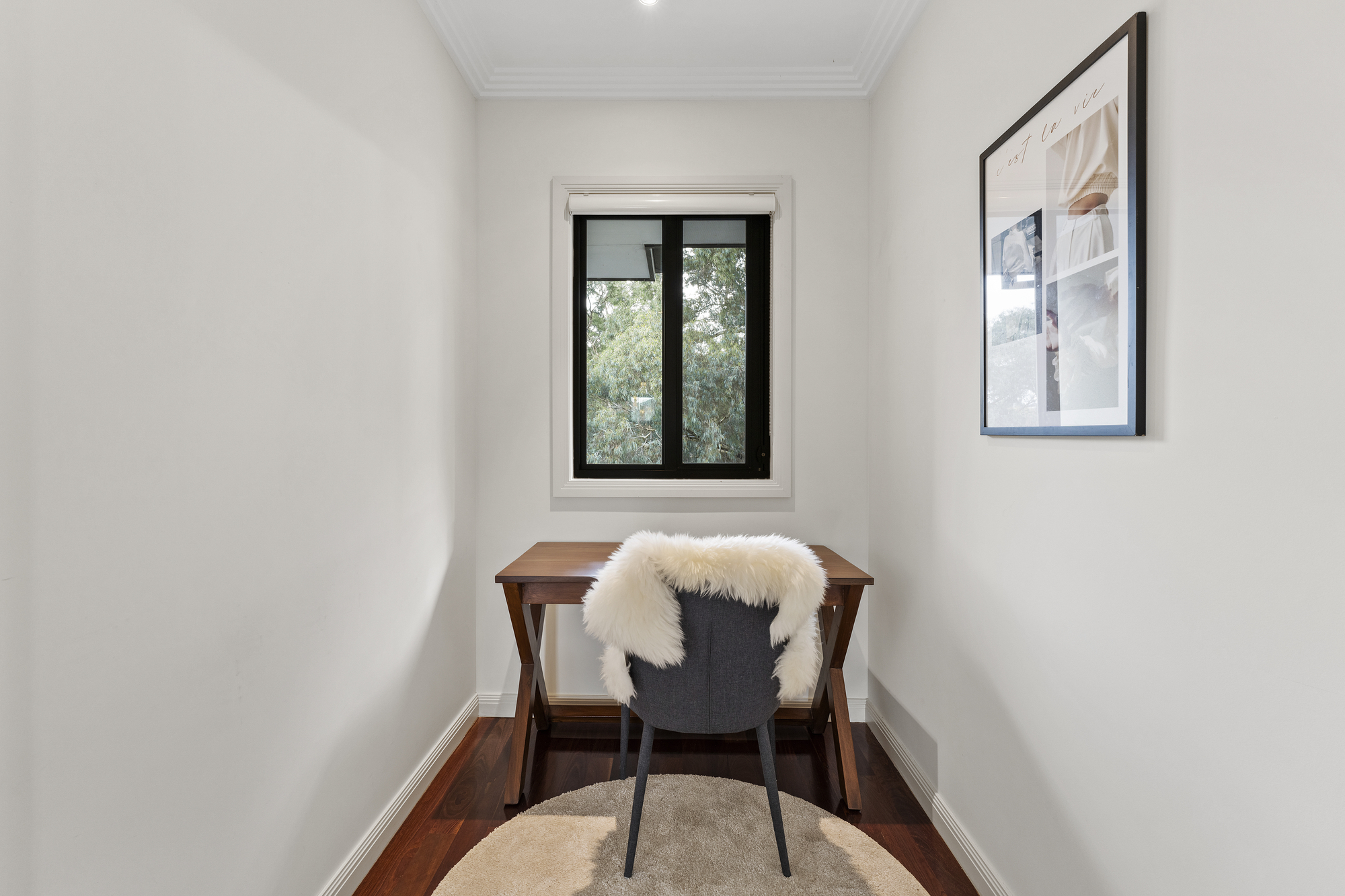 Outside, a large balcony overlooks beautiful Australian Eucalypts, while the manicured, tiered backyard with garden pathing provides a tranquil retreat. For those looking for peace and privacy to get creative, a dedicated study nook is your perfect productivity driver.