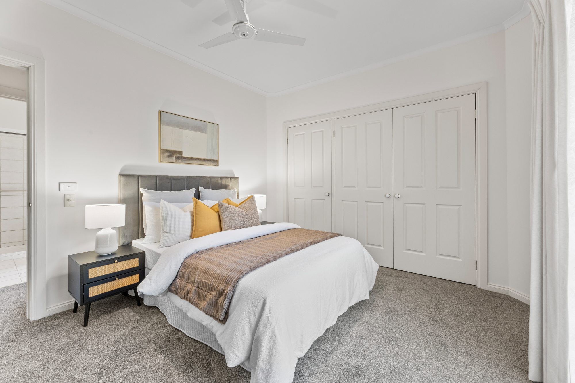 Living and dining areas are seamlessly integrated with the open plan kitchen, creating a welcoming space for daily living and entertaining. The kitchen is well equipped with a dishwasher and finished with tiled flooring for ease of maintenance, a feature that continues through the bathroom. Carpeted flooring throughout the remaining areas provides warmth and comfort. Climate control is well considered, with air conditioning in the living area and a ceiling fan in one of the bedrooms. A single carport completes the home, offering secure off-street parking.