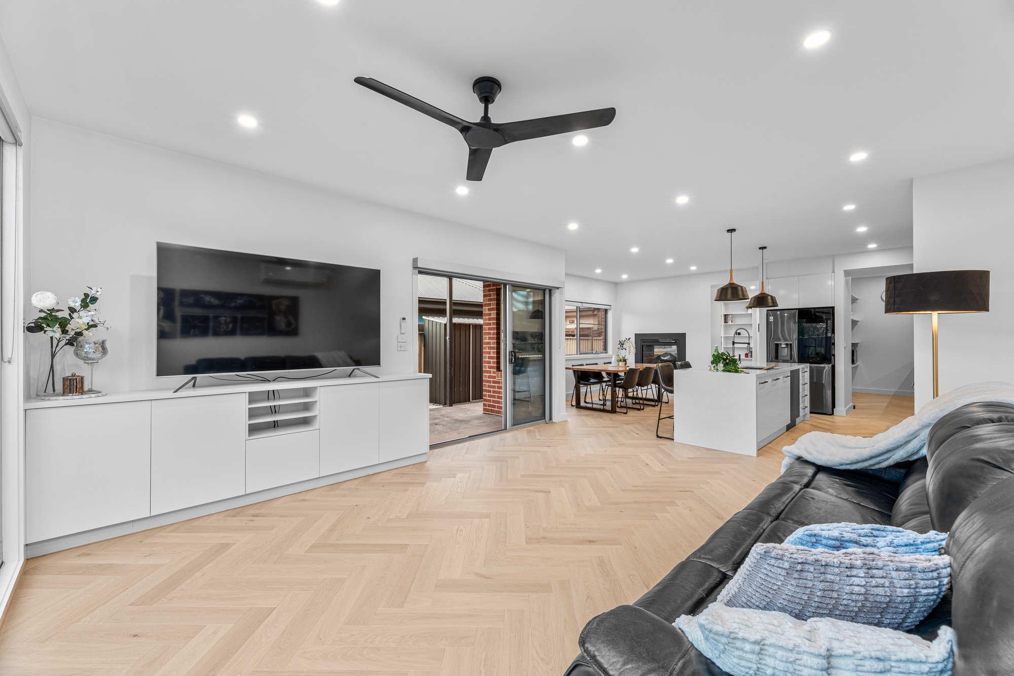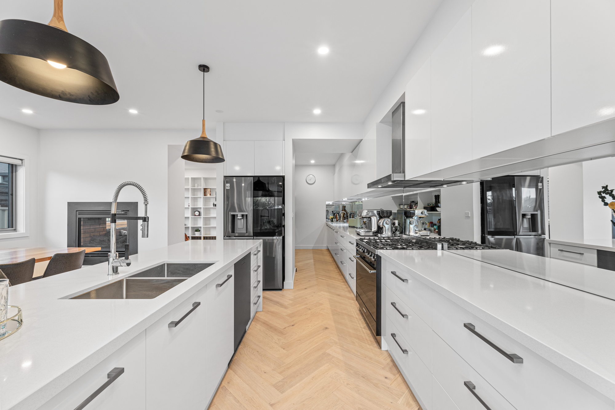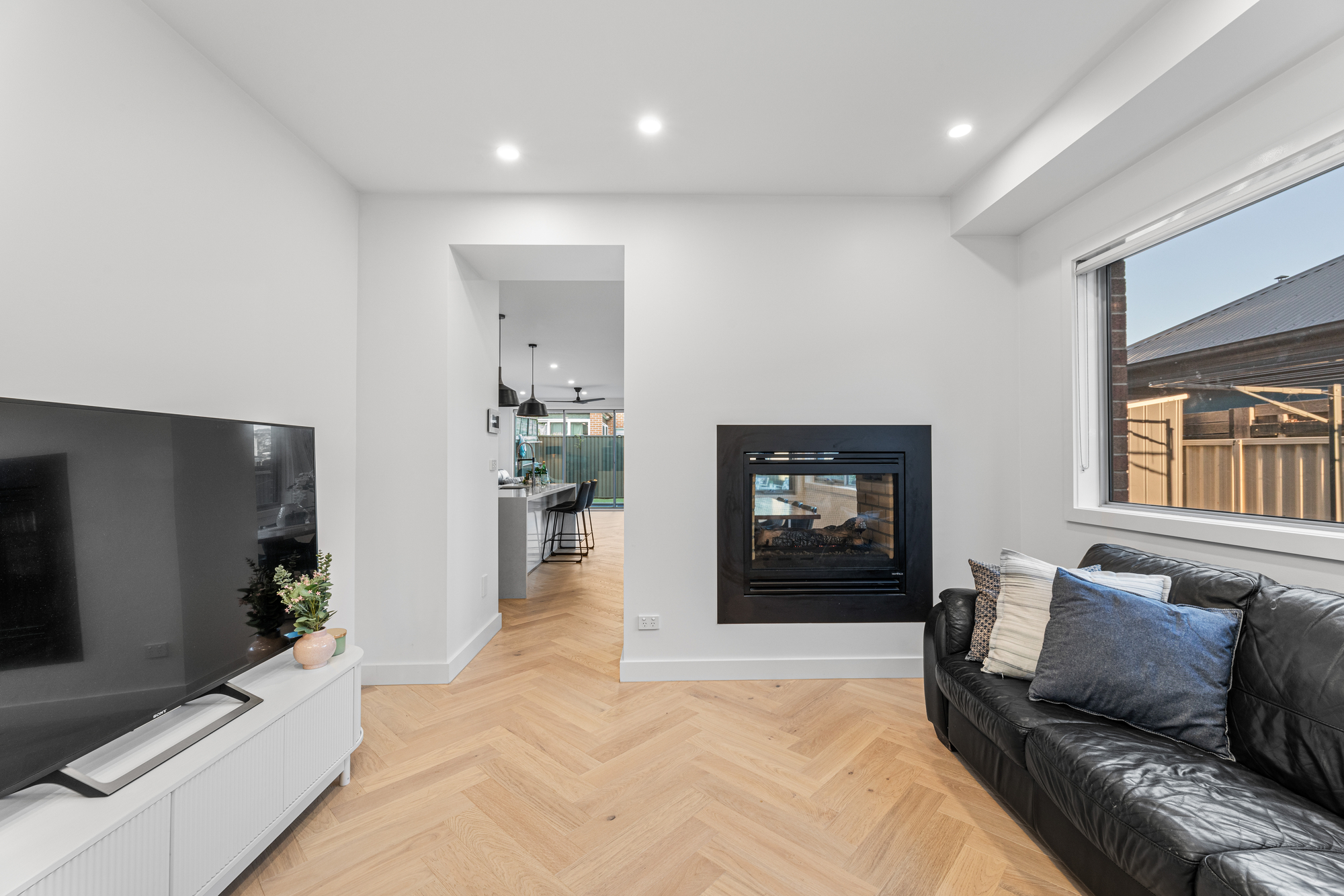 Spanning two spacious levels, the home welcomes you with a dedicated study near the entrance, ideal for working from home, before opening to expansive living zones. A light-filled lounge and dining domain is anchored by a striking double-sided fireplace, creating warmth and ambience while connecting the living areas.