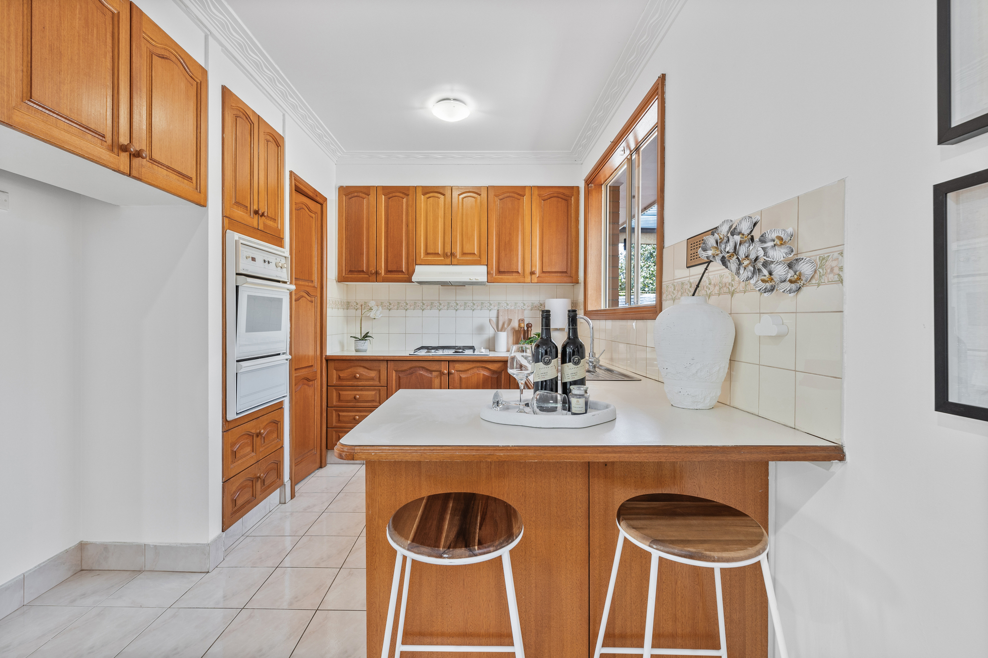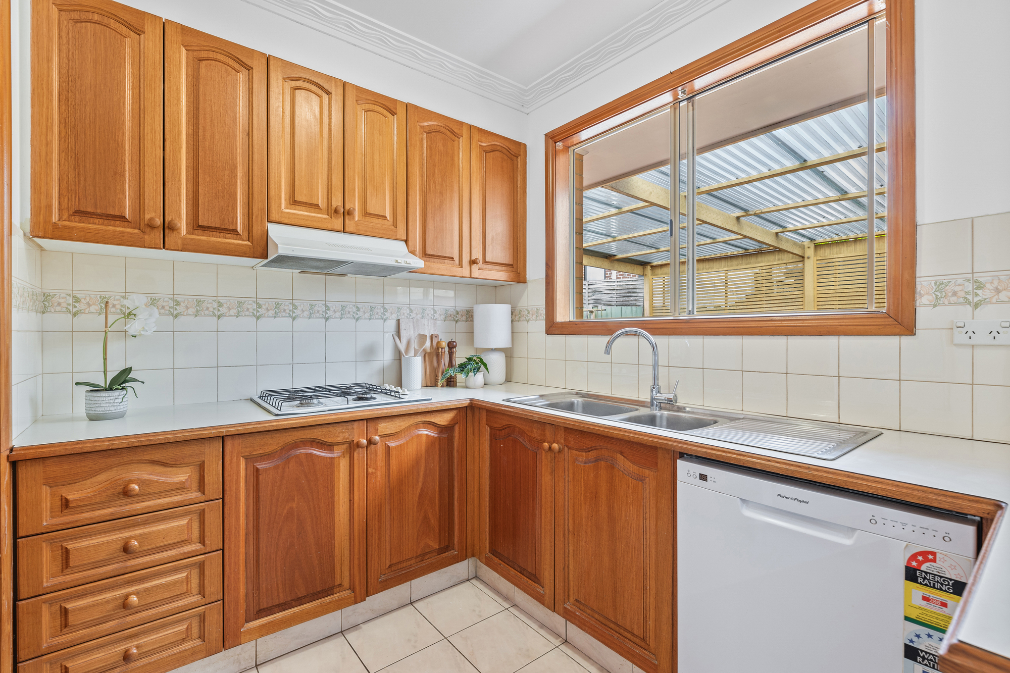 The kitchen is both practical and inviting, with a double overmount sink, Chef wall-mounted oven, Chef gas stove, laminate benchtops, tiled floors and walls, and a Fisher & Paykel dishwasher. The kitchen bench comfortably seats two, offering a casual spot for meals or conversation.