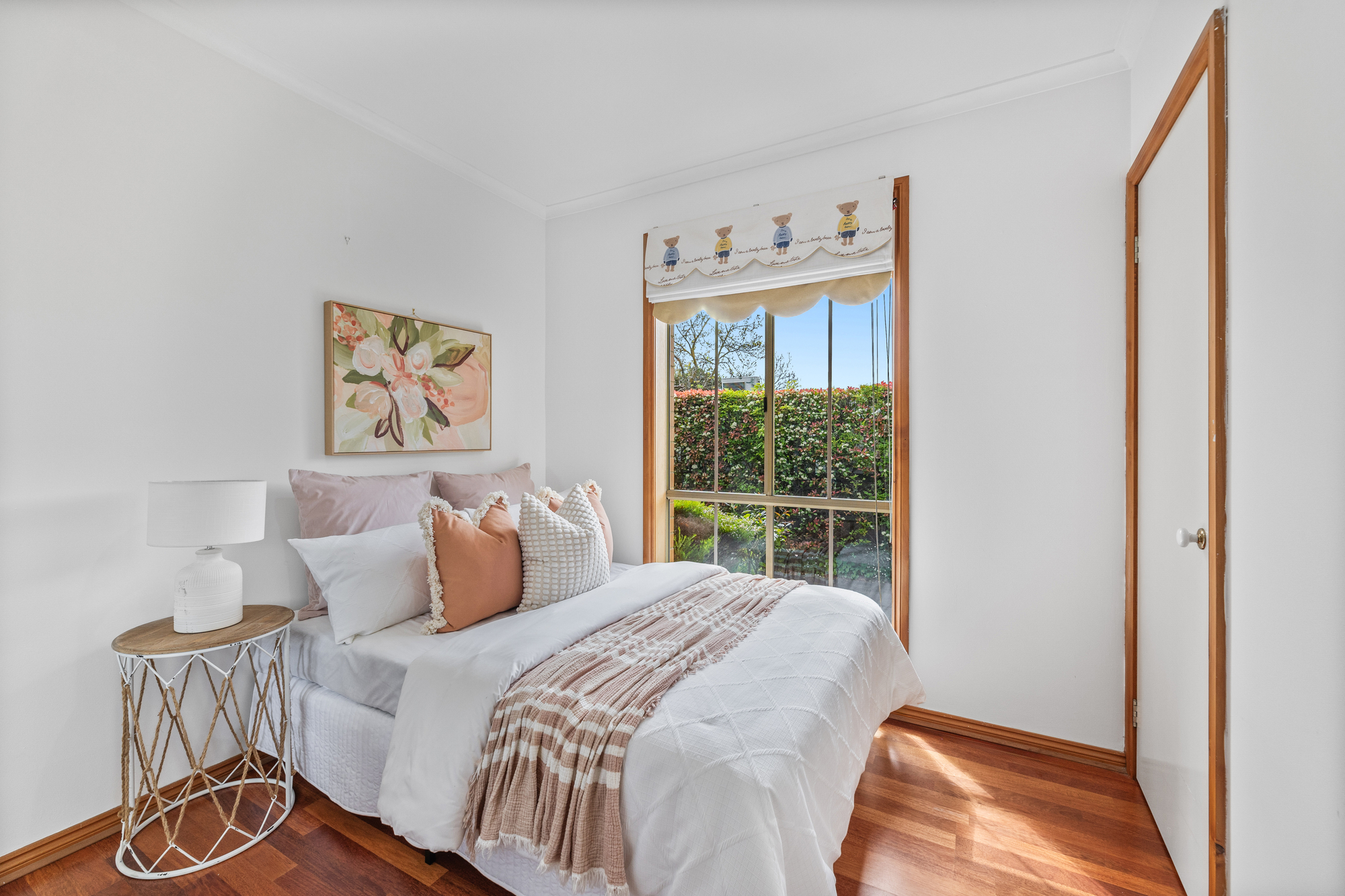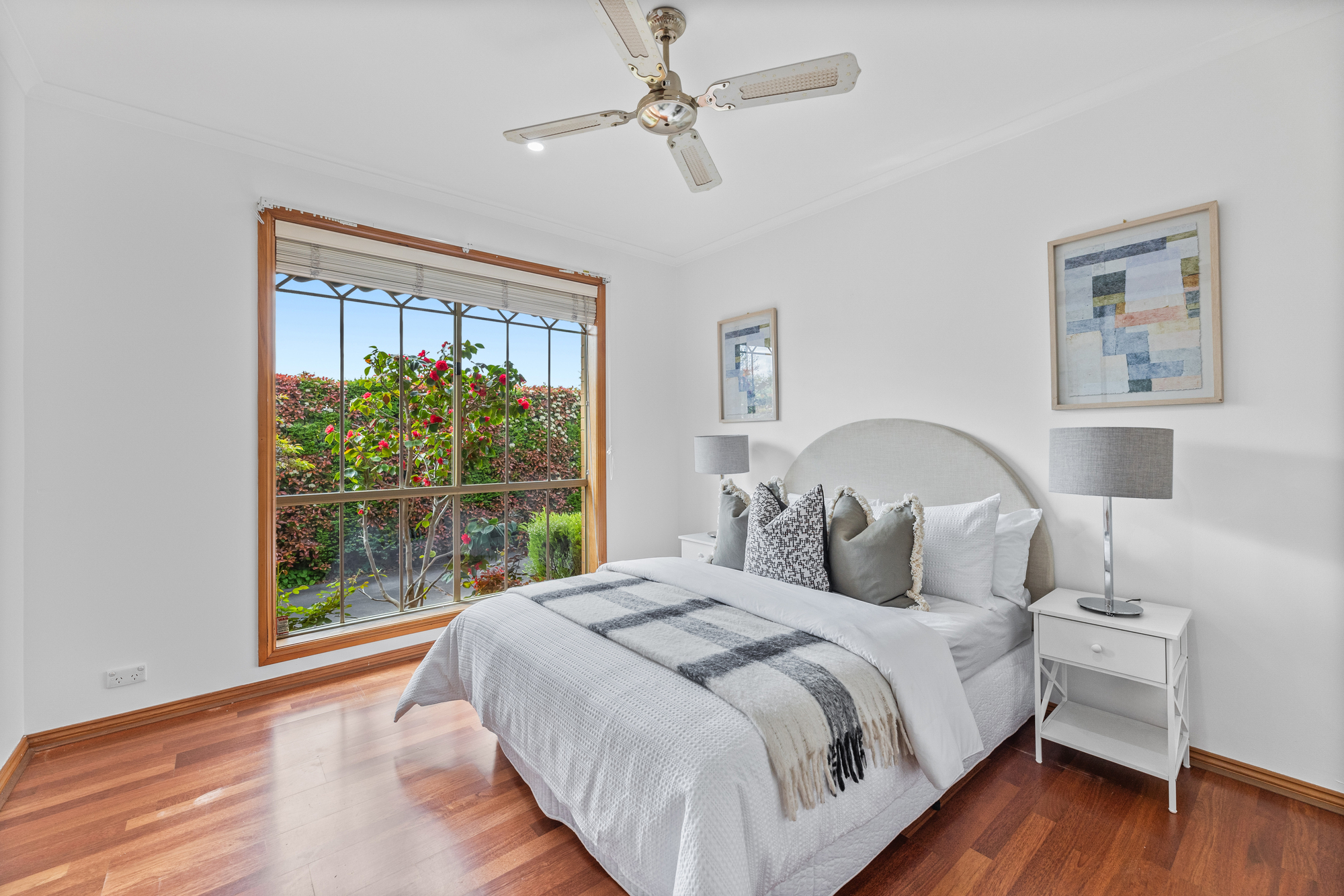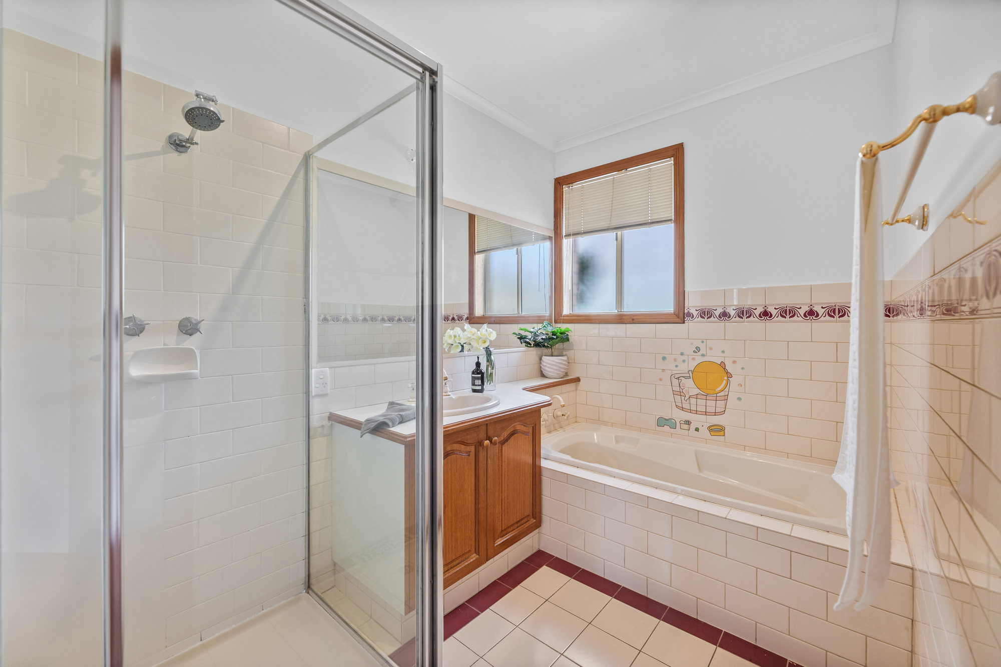 Both bedrooms include two built-in robes, large floor-to-ceiling windows, and timber floors, while the main bedroom has direct access to the central bathroom. The bathroom includes a full bath, separate shower, and half-height tiled walls, maintaining functionality and charm.