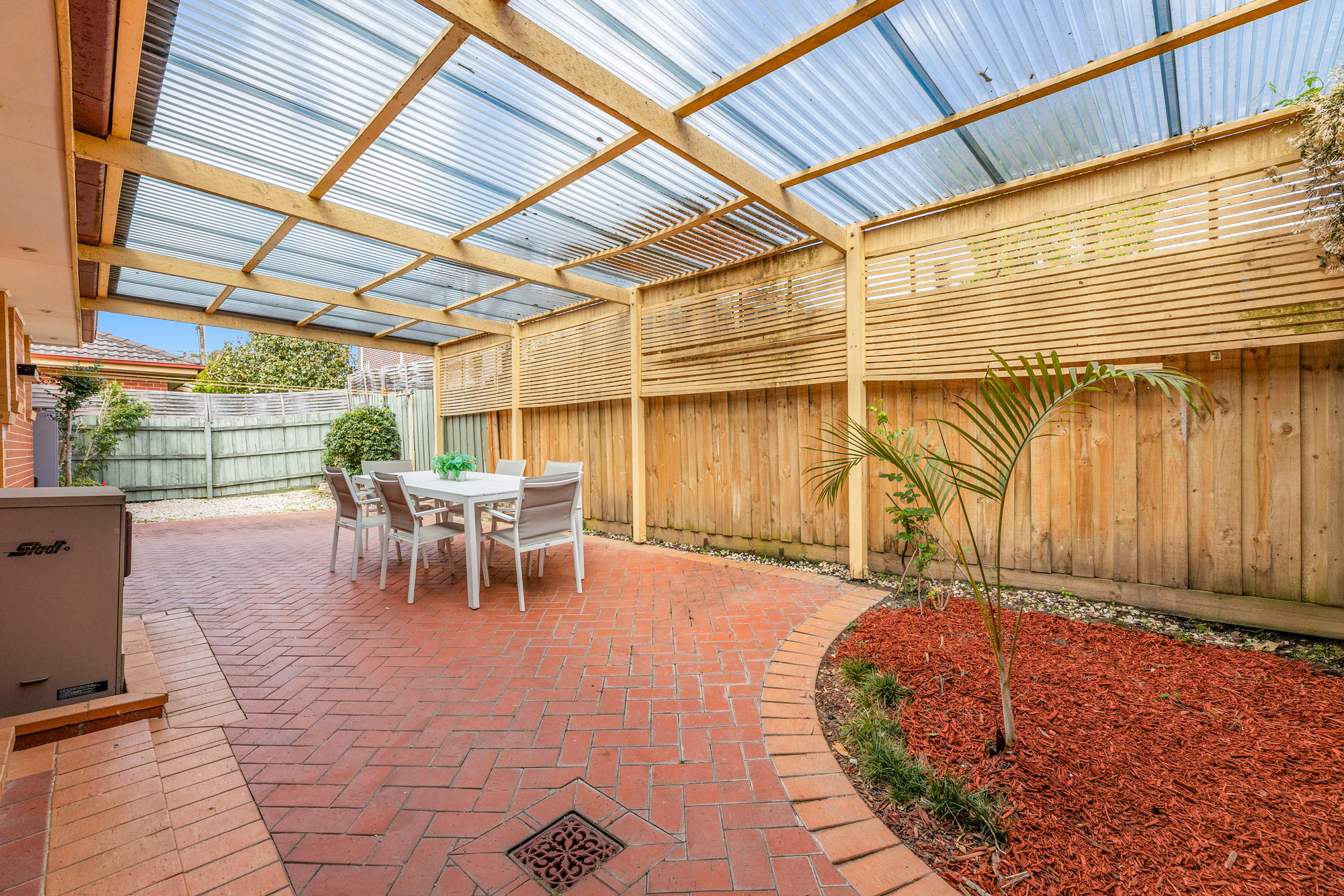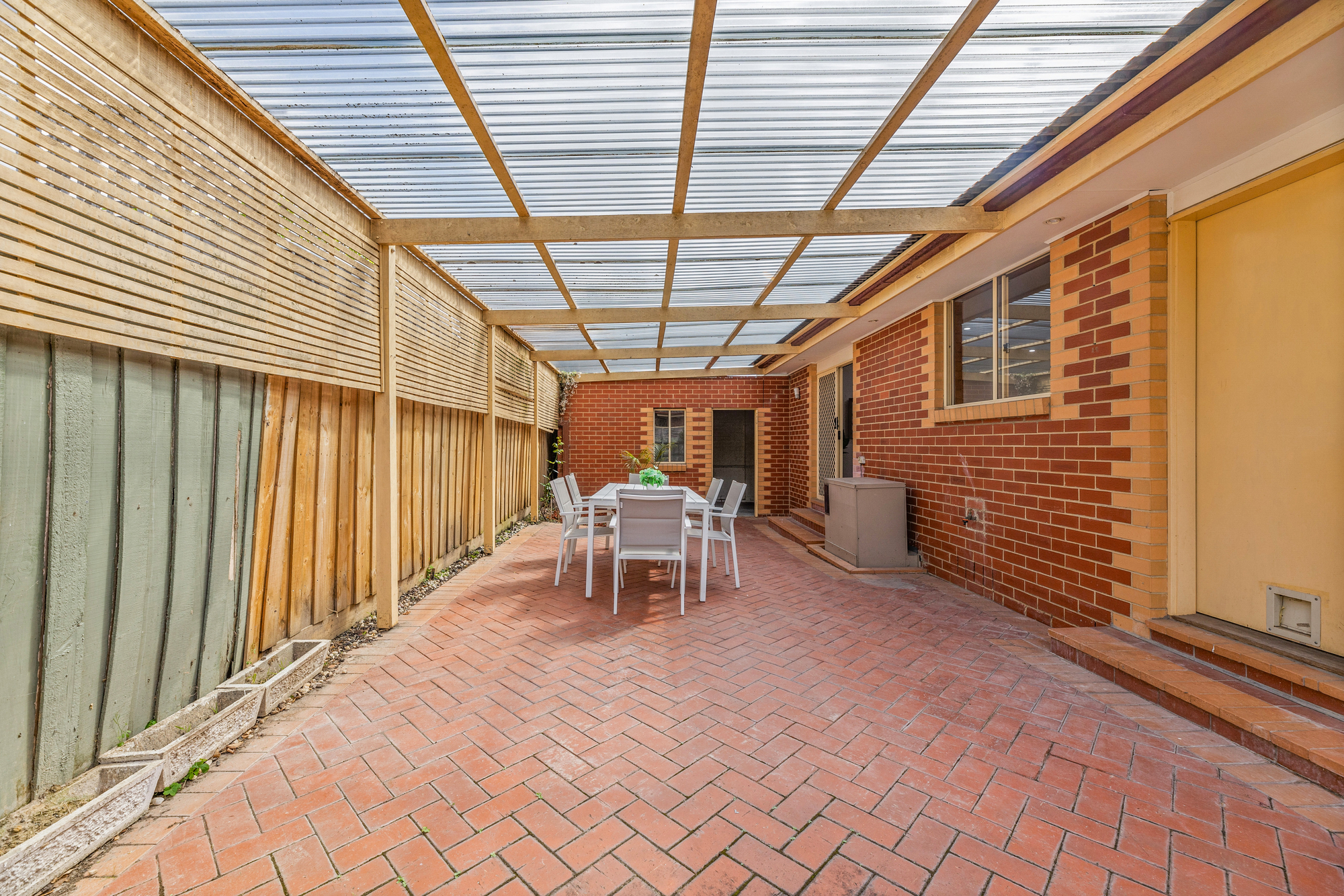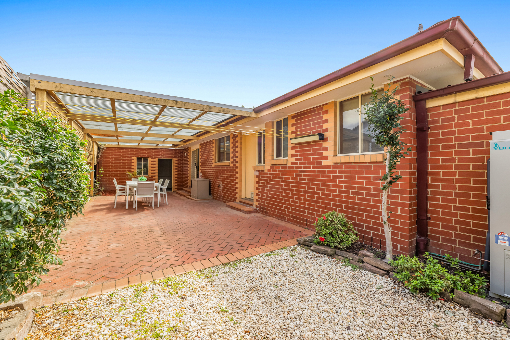 Additional highlights include a separate toilet, laundry with external access, a split system cooling and ducted gas for heating. Outdoors, a spacious undercover patio with brick flooring sits within a low-maintenance garden, while a single garage provides secure parking.