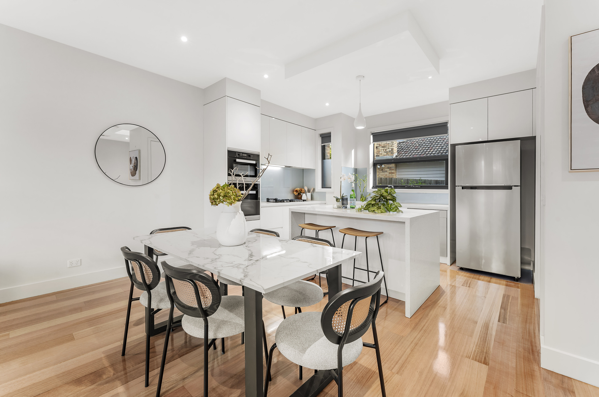 Step inside and be greeted by an inviting, light-filled living space that flows effortlessly into the open-plan dining and kitchen area. The contemporary kitchen is well-equipped with ample storage, modern appliances, and a functional design, making meal preparation a breeze.