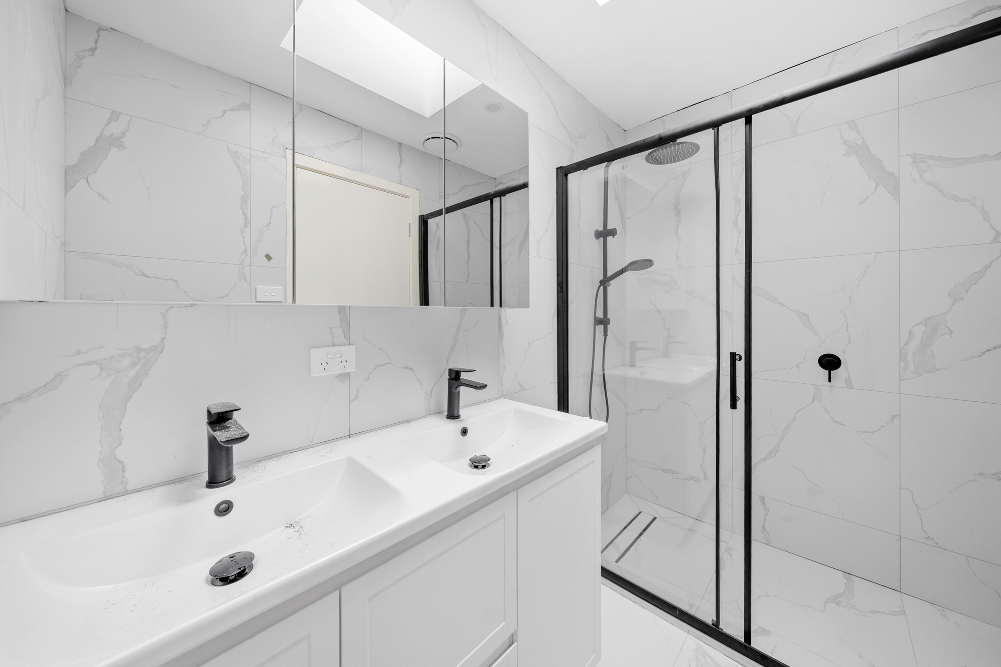 This unit has two generous bedrooms, both with built-in wardrobes, large windows, and timber-look flooring. The fully renovated bathroom features floor-to-ceiling marble-look tiling, a modern vanity, a frameless-glass shower, and matte black fittings. There is also a separate toilet for practicality.