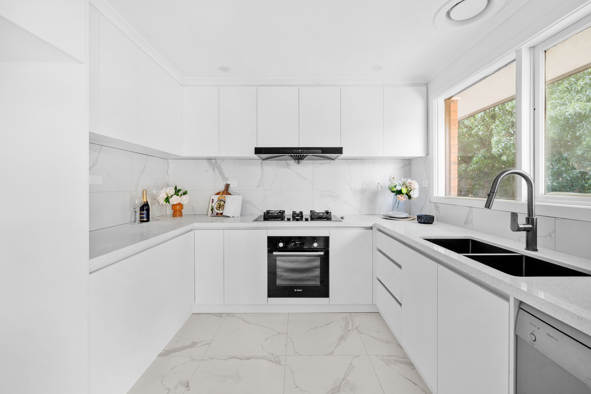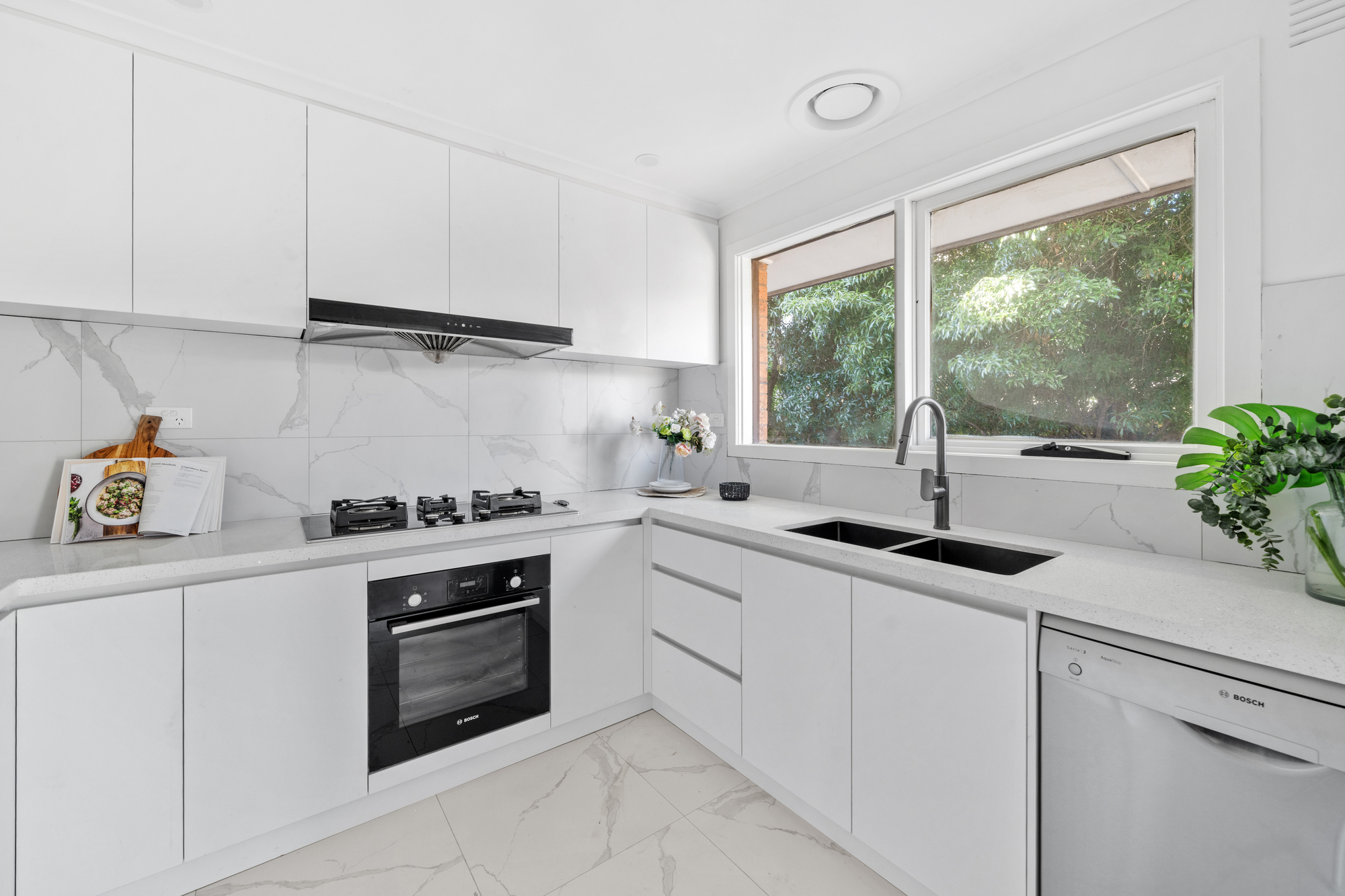 The U-shaped kitchen boasts premium stone benchtops with waterfall-style edging, a marble-look tiled splashback, and high-quality Bosch appliances including an oven, gas cooktop, and dishwasher. A sleek black double sink and ample cabinetry complete the kitchen, with a large window overlooking the private courtyard.