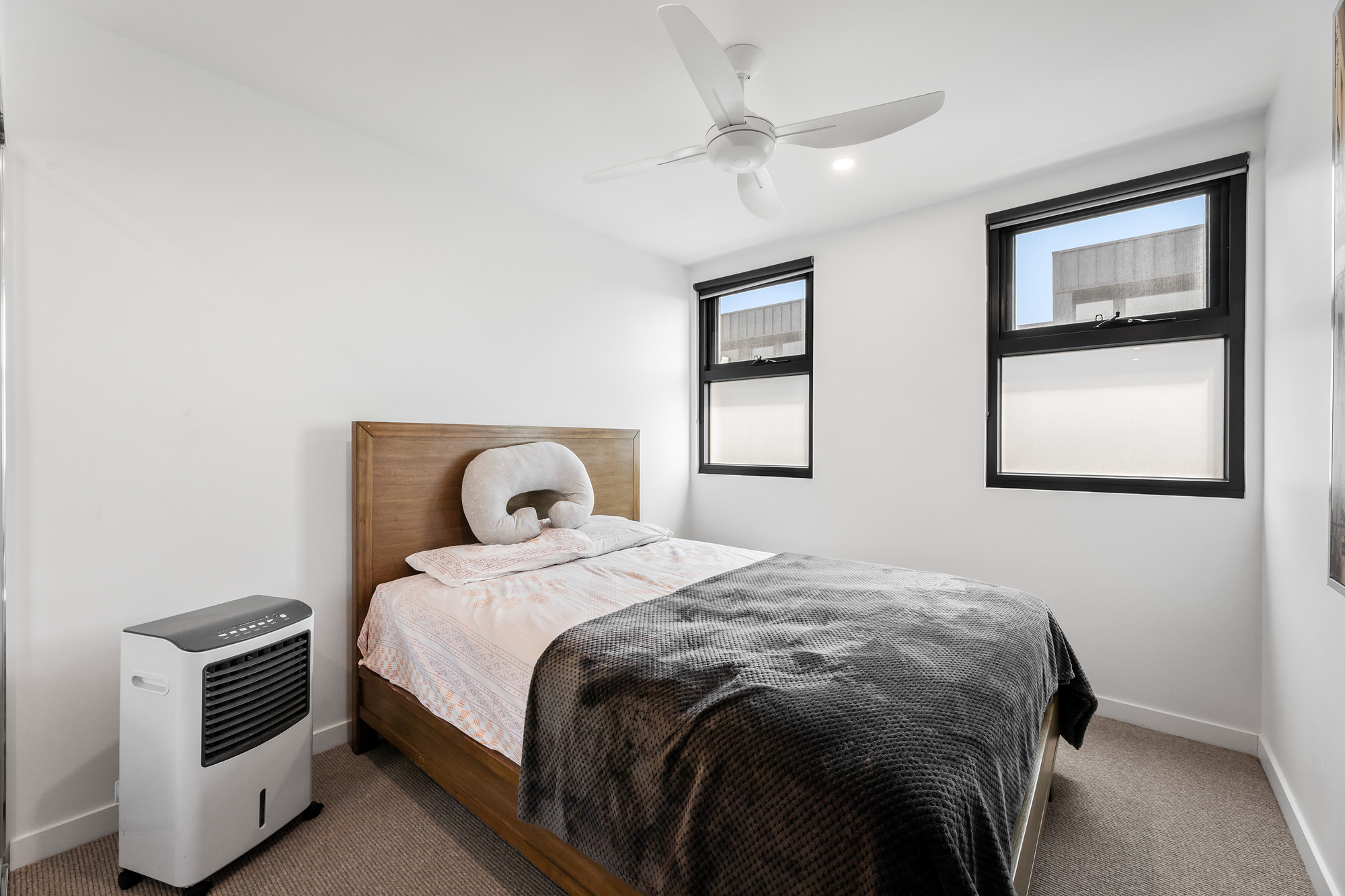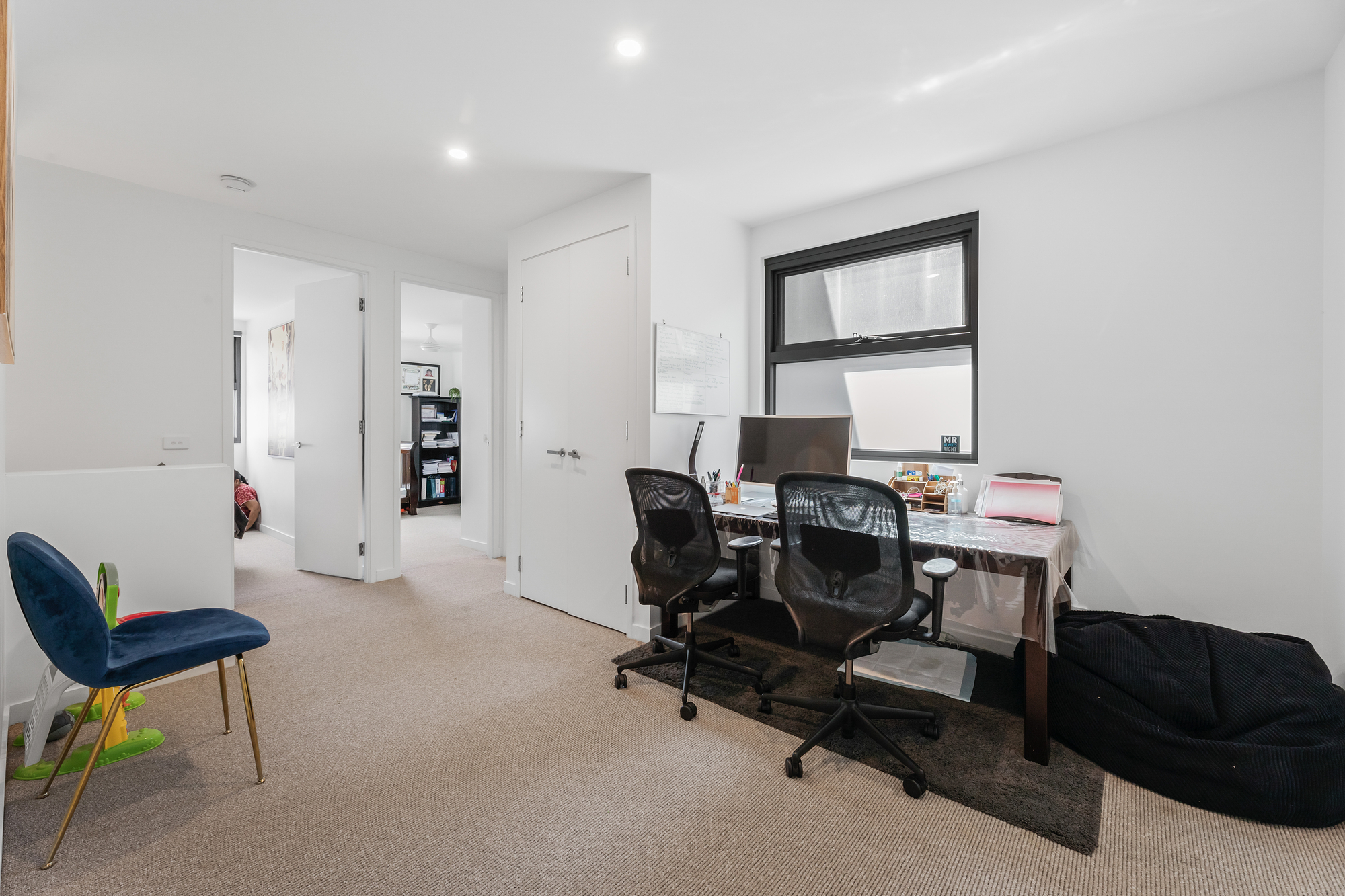 The second floor is dedicated to accommodation and flexibility, comprising two generously sized bedrooms, both with built-in robes and ceiling fans, serviced by a stylish central bathroom. A versatile retreat or study area on this level provides the ideal space for a home office, second living zone or quiet reading nook.