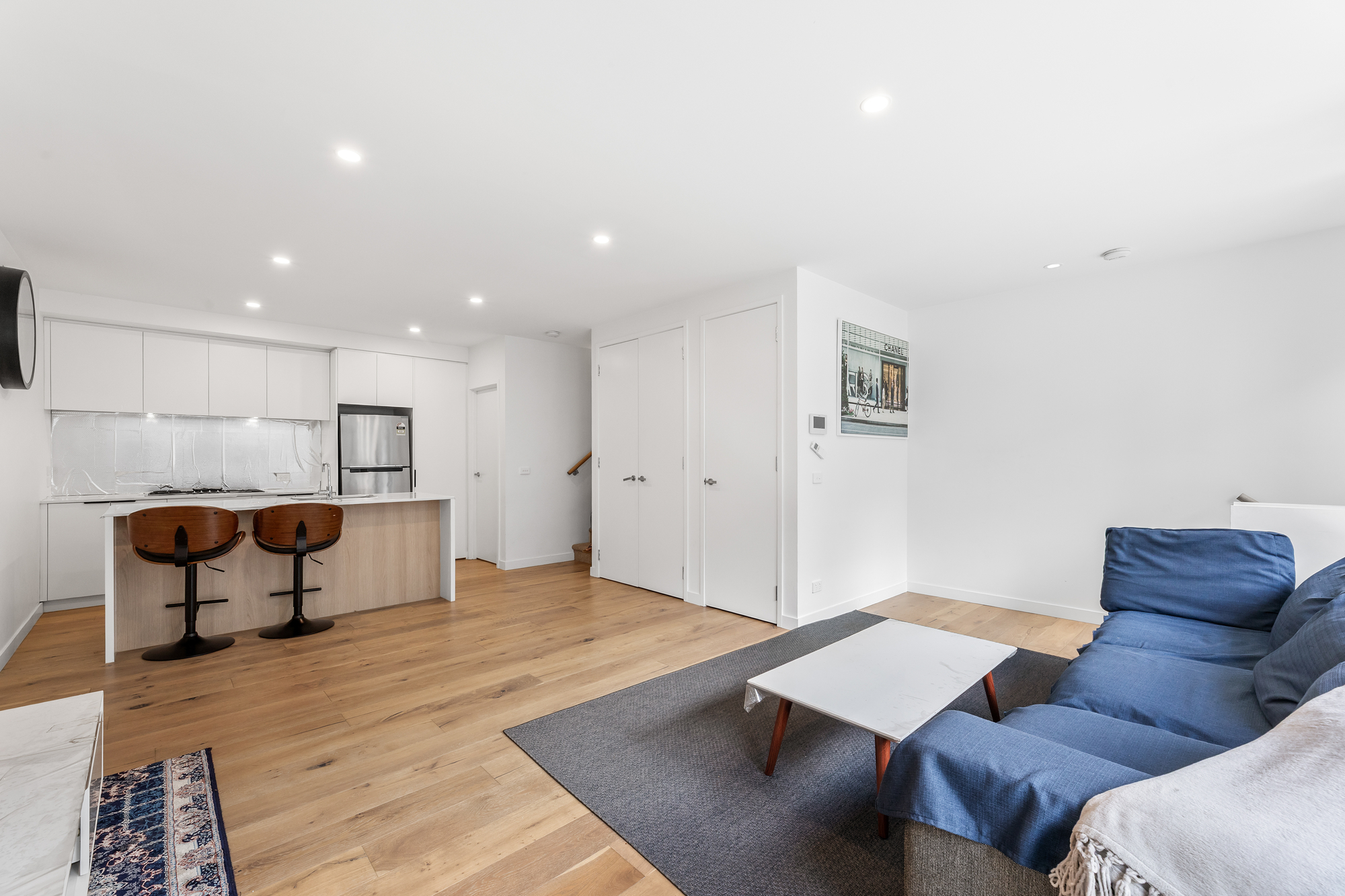 The first floor forms the heart of the home, featuring a spacious open-plan living and dining area anchored by a sleek designer kitchen. Equipped with premium Miele appliances, stone island benchtop, gas cooktop and dishwasher, this level is perfectly suited for everyday living and entertaining. Glass sliding doors extend the living zone to a sun-drenched balcony, creating seamless indoor–outdoor flow.