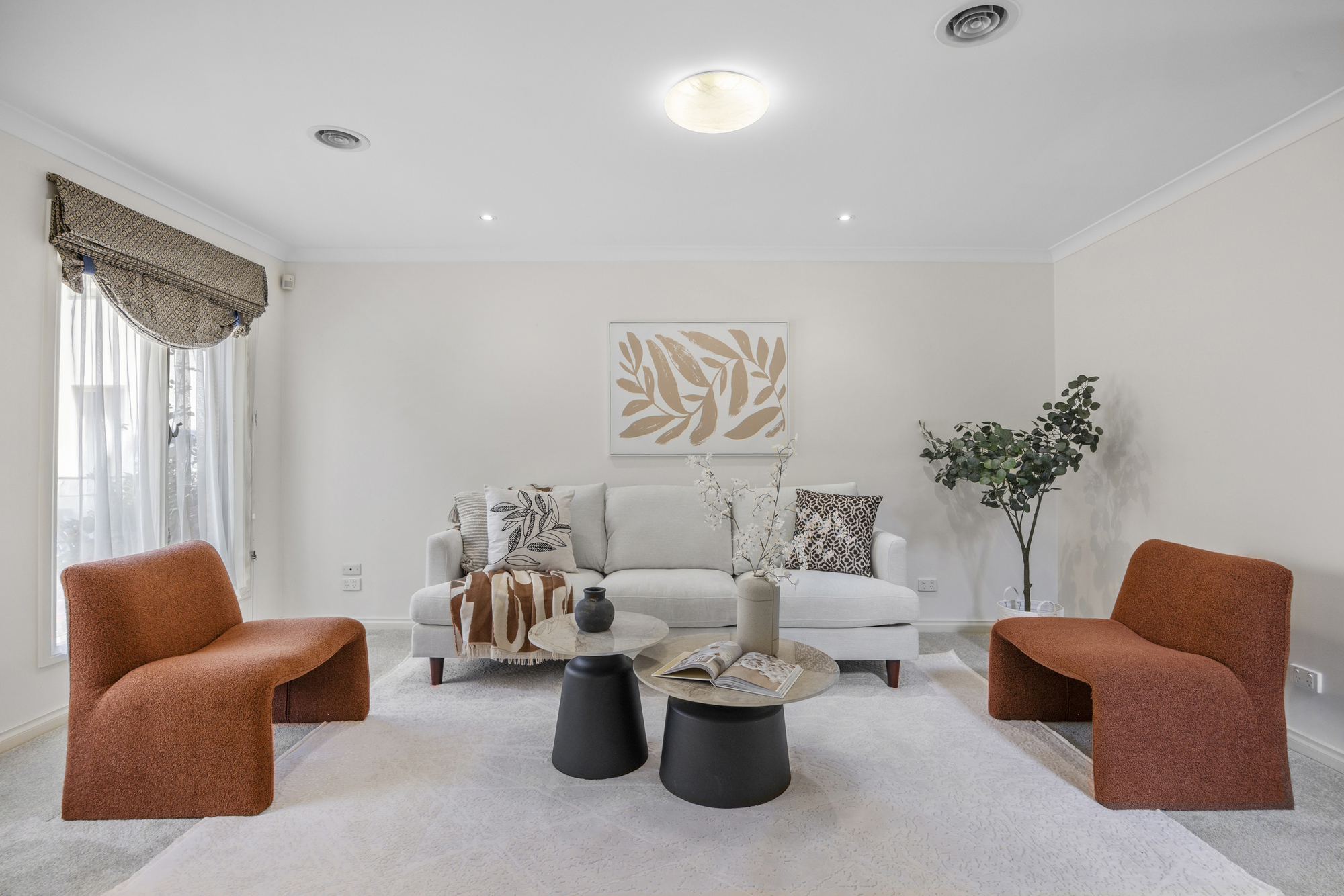 The home opens to a carpeted secondary living room at the front, ideal as a quiet lounge, media room or retreat. Flowing through, the expansive open plan family and dining zone is anchored by floorboards and filled with natural light. Sliding doors extend the space to a paved backyard, creating easy indoor outdoor living. The dining area is set slightly apart from the kitchen while remaining connected, providing structure without sacrificing openness.