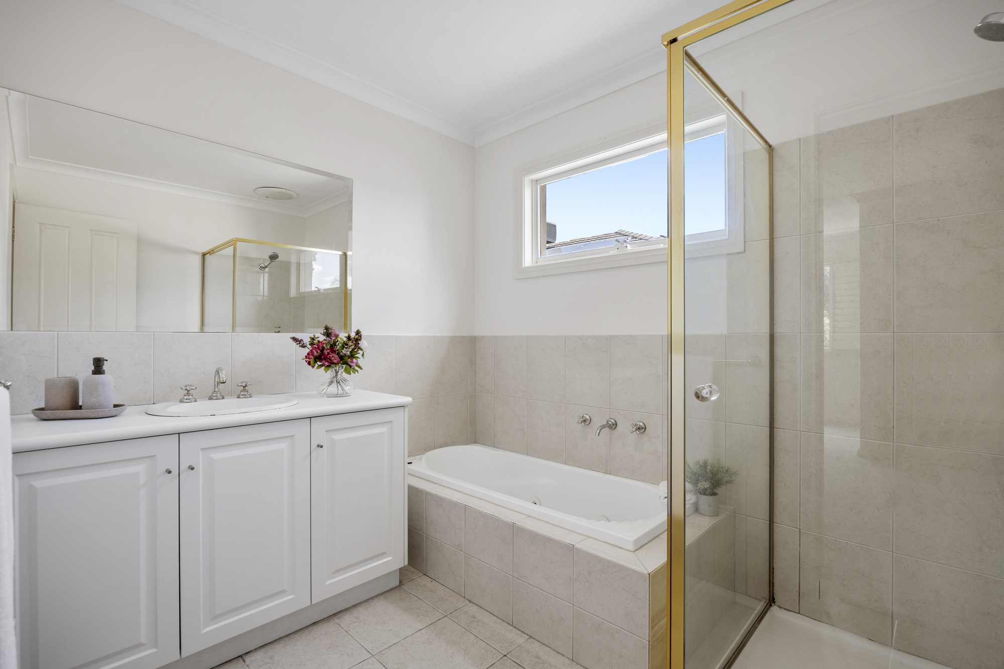 Upstairs, three well appointed bedrooms offer plush carpet and excellent natural light. Two include built in robes, while the master suite features a walk in robe and private ensuite. Three tiled bathrooms service the home, including a full bathroom downstairs and a central upstairs bathroom with bathtub. All bathrooms include single vanities and practical layouts suited to family living.
