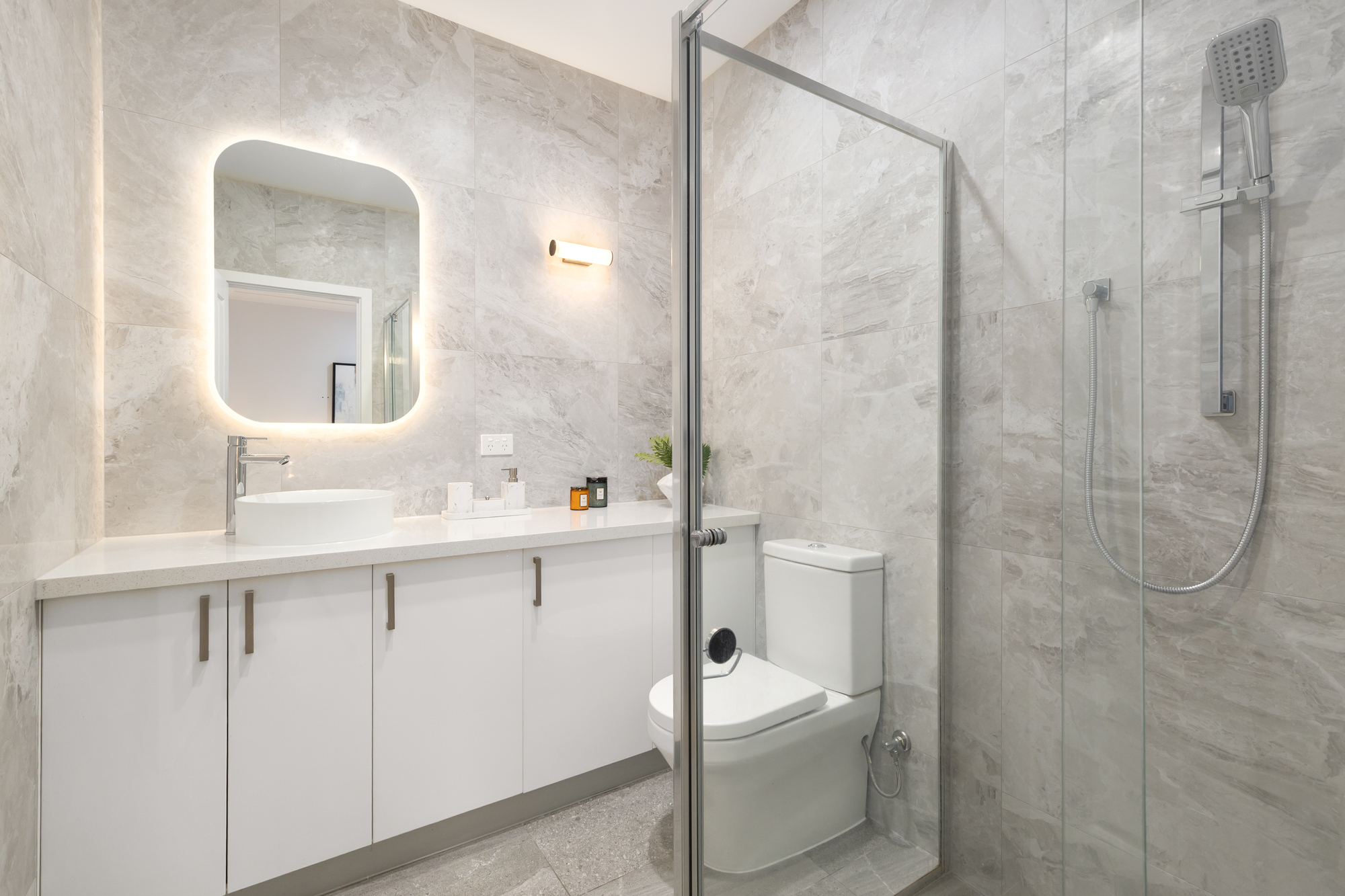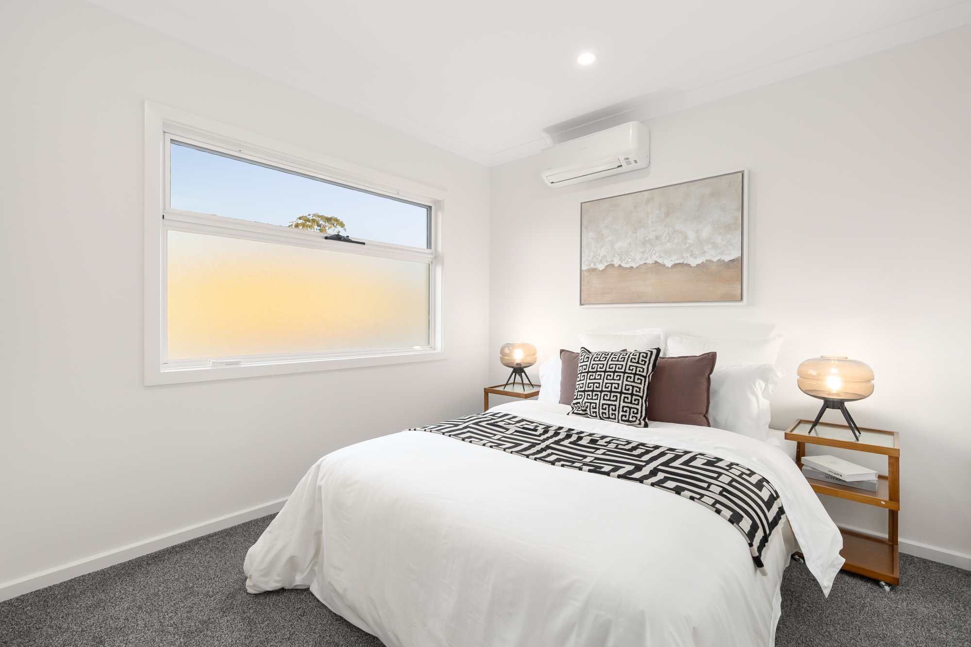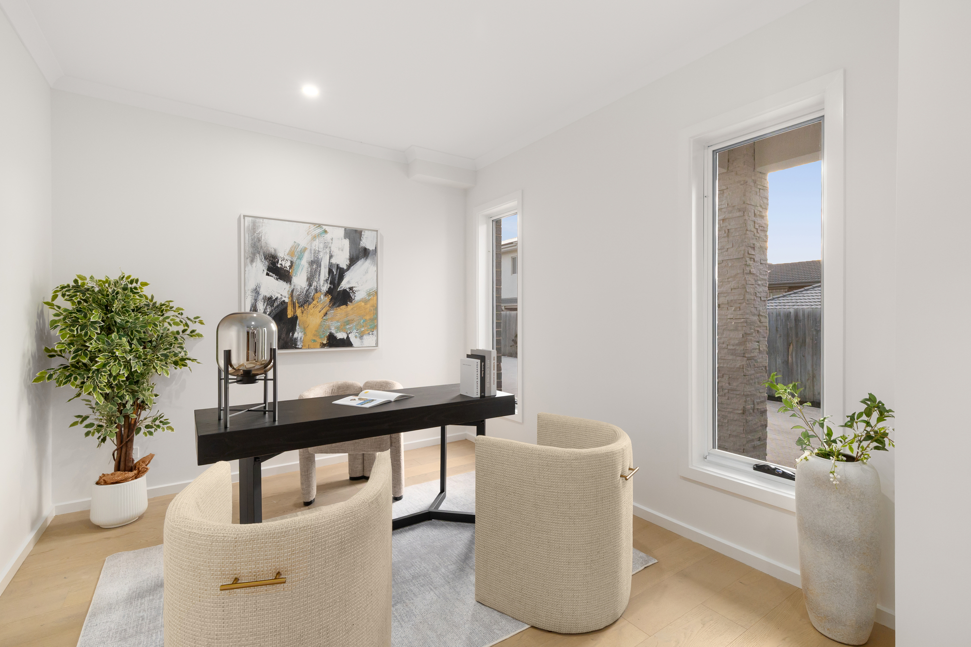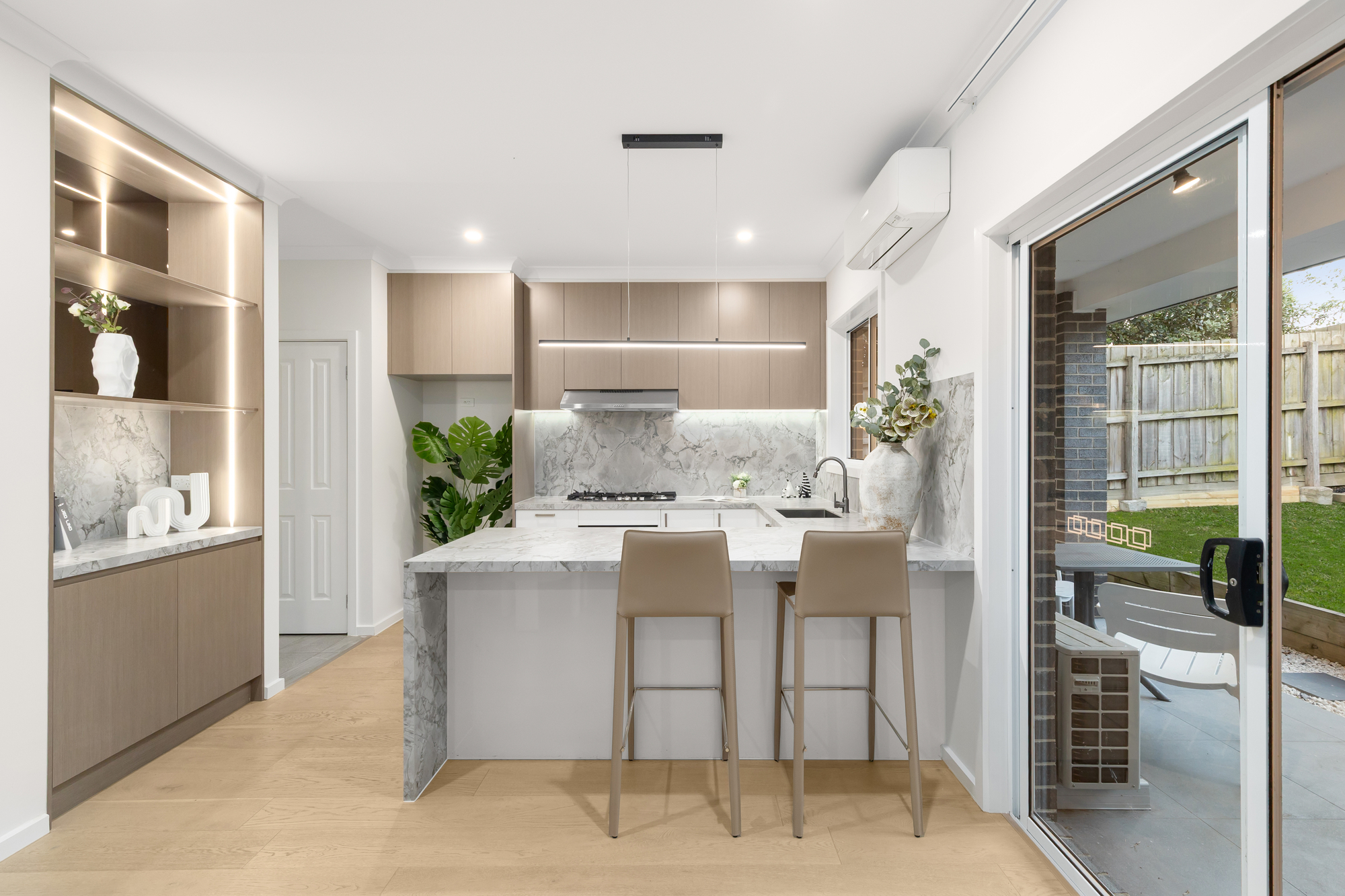The elegant formal living room enjoys quiet separation from the vibrant open-plan dining area and sleek stone kitchen, appointed with premium appliances. Sliding doors extend seamlessly to a covered alfresco and sun-filled, low-maintenance courtyard — perfect for effortless entertaining.