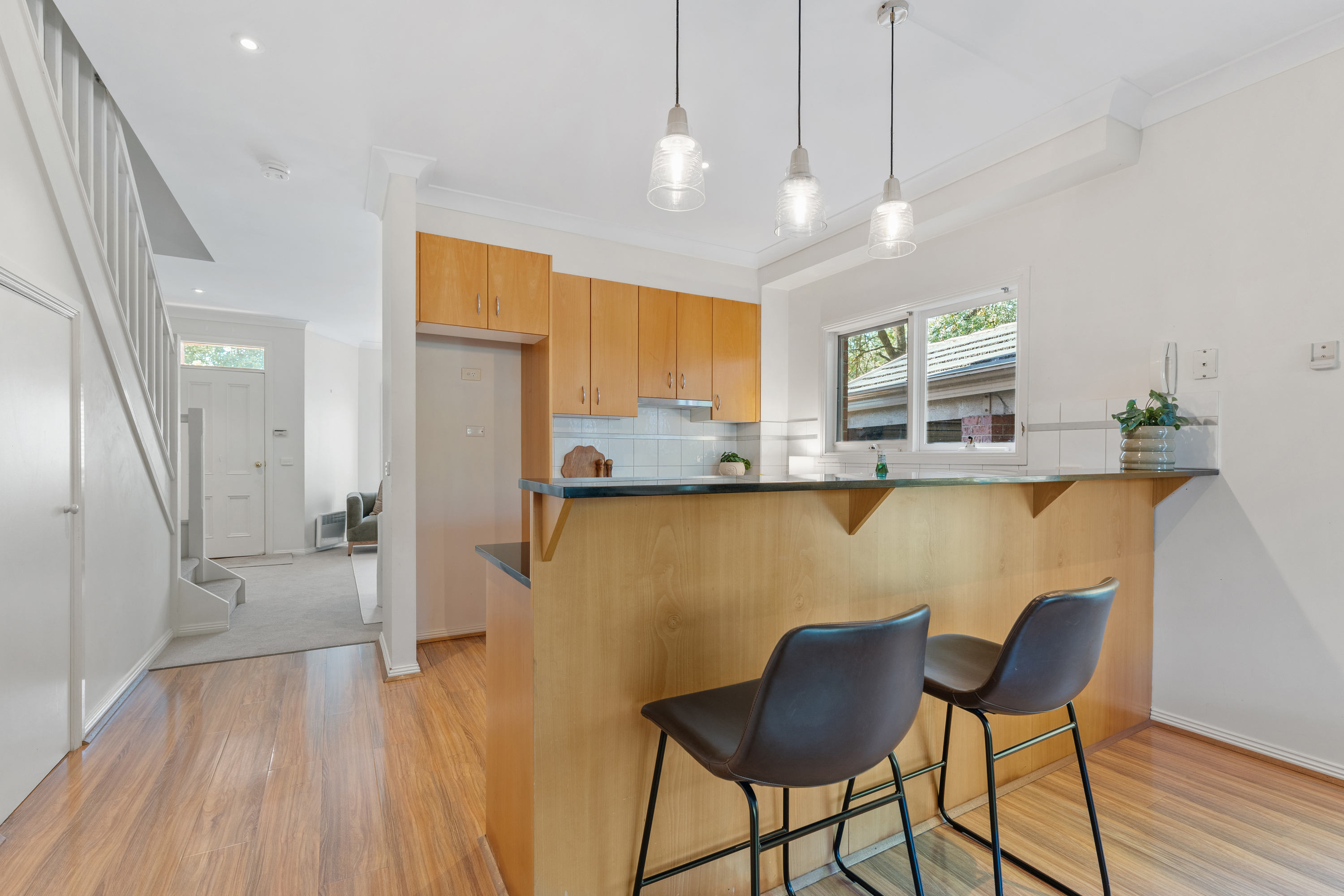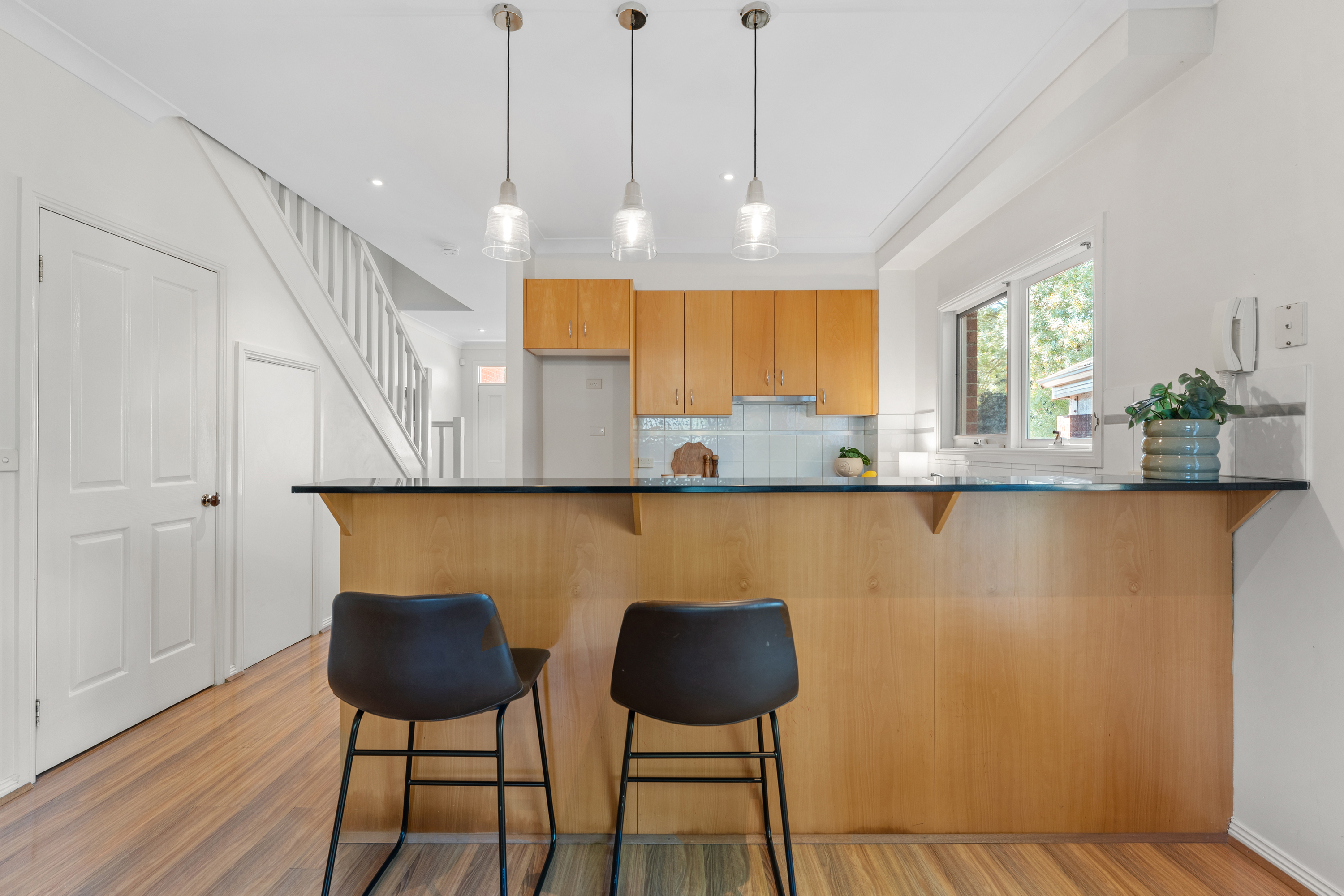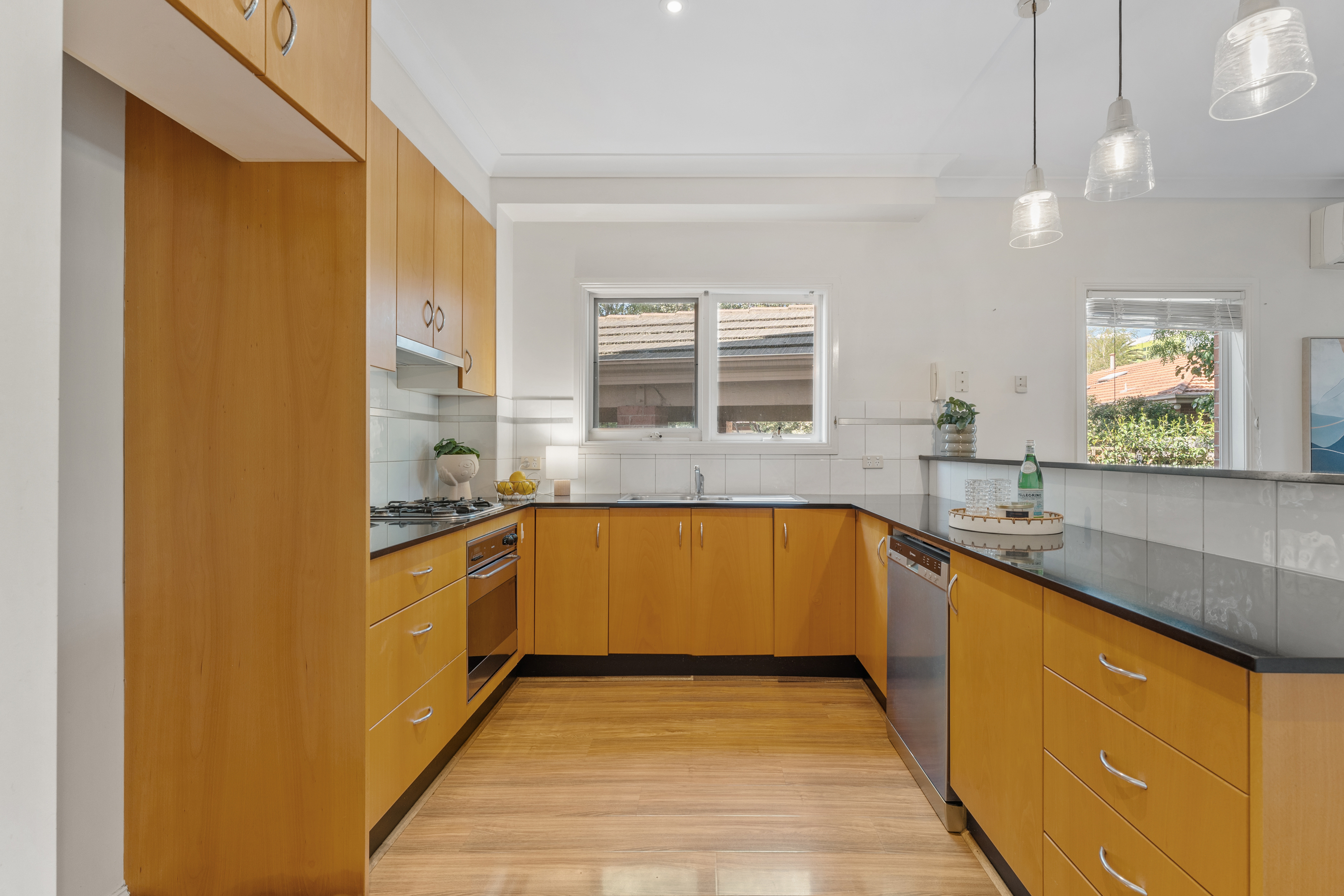 The living and dining area is enhanced by timber flooring, abundant natural light, and a sliding door opening directly to the backyard. Comfort is assured with a split system and electric heater. The adjoining kitchen features a high breakfast bar, four-burner gas stove, pantry, and ample under and overhead storage, creating a functional space for everyday use. A laundry closet is positioned nearby for convenience.