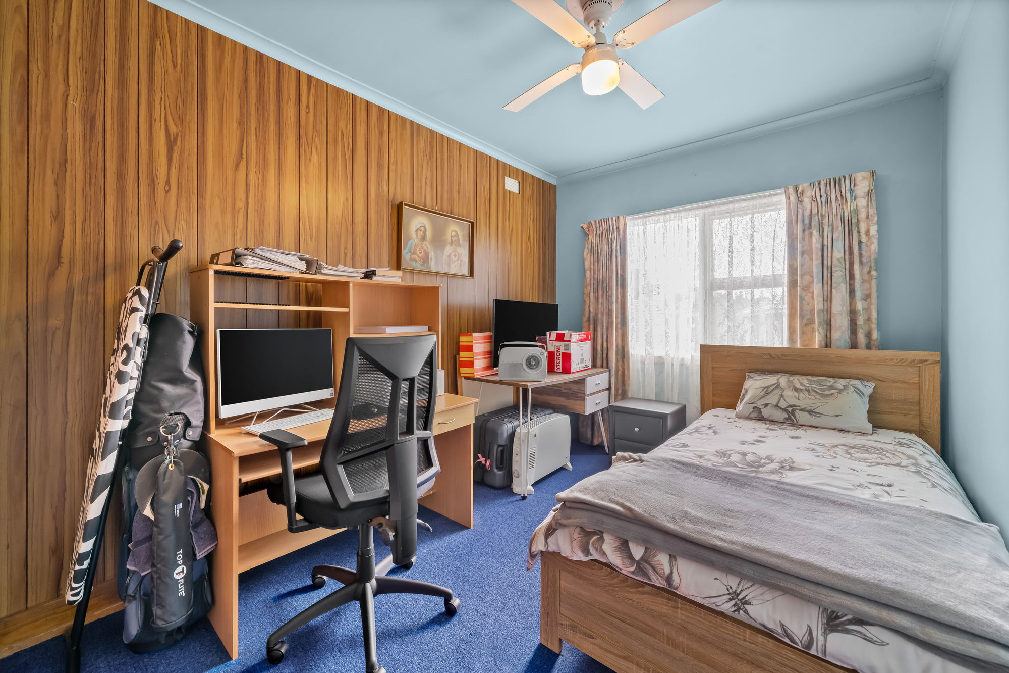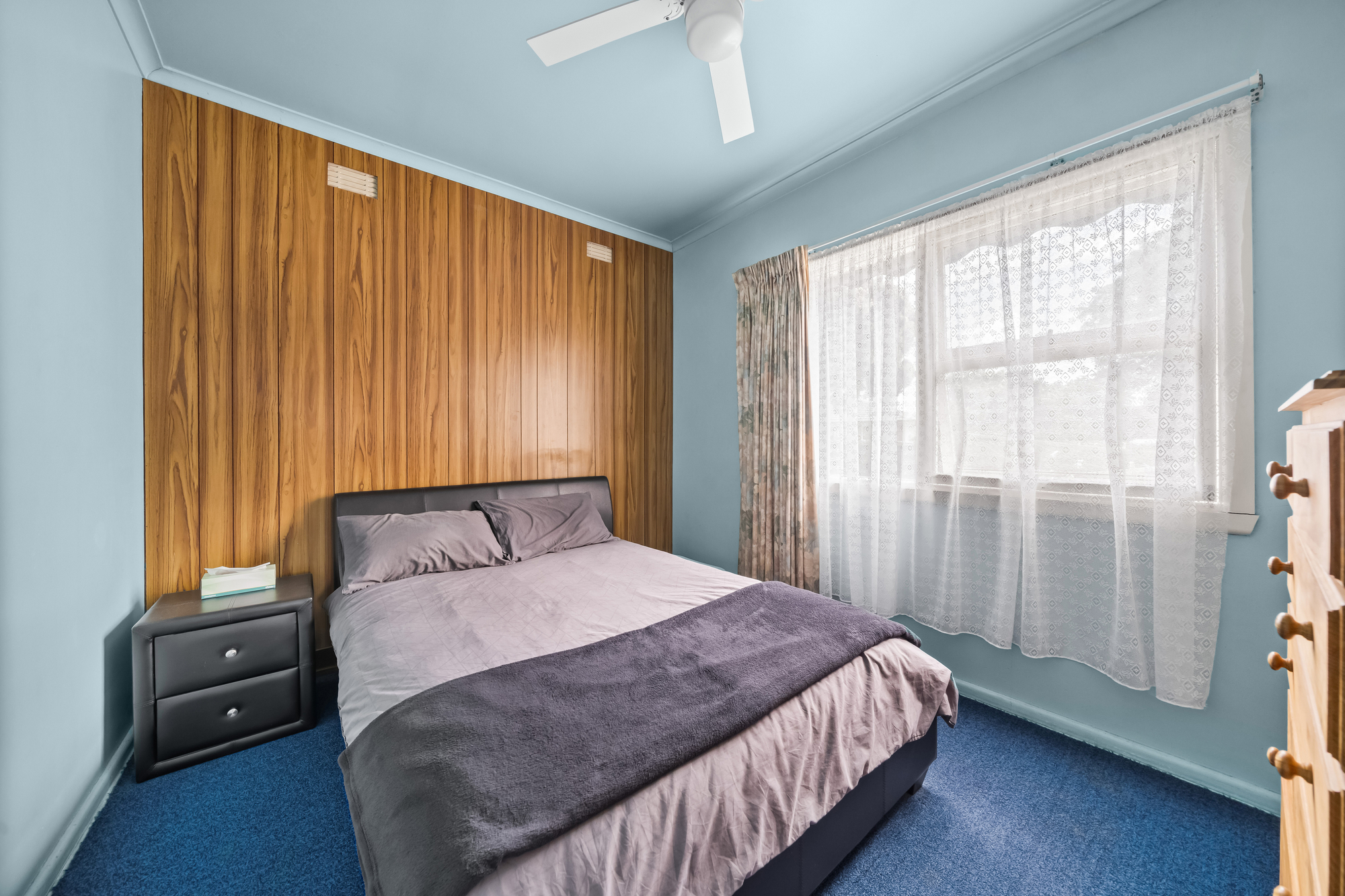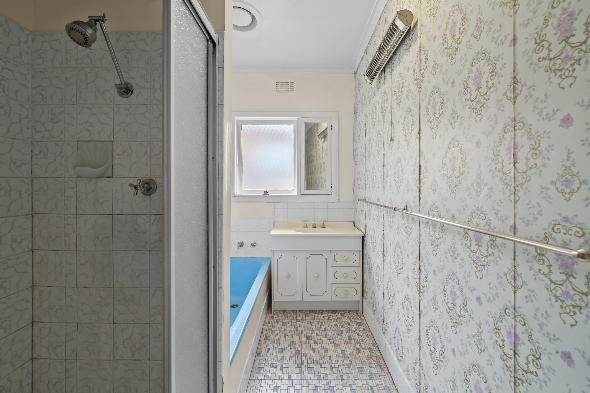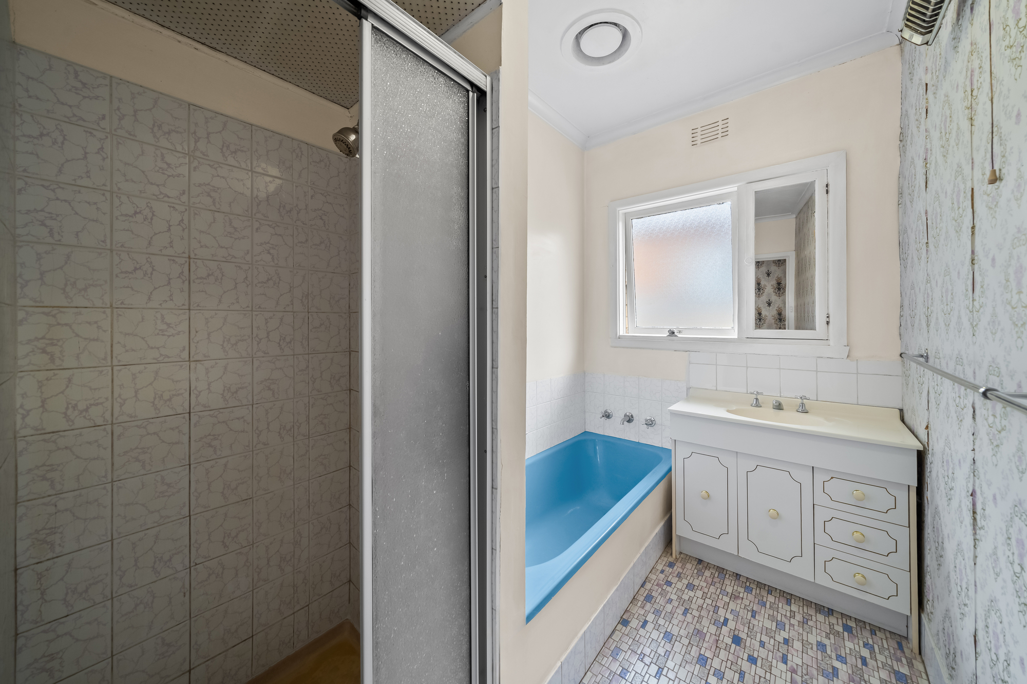 Three well-proportioned bedrooms are fitted with built-in robes and timber flooring. The central bathroom includes a separate shower and bath, neutral tiling, vanity with storage, and a large mirror, complemented by a separate adjacent toilet for added functionality.