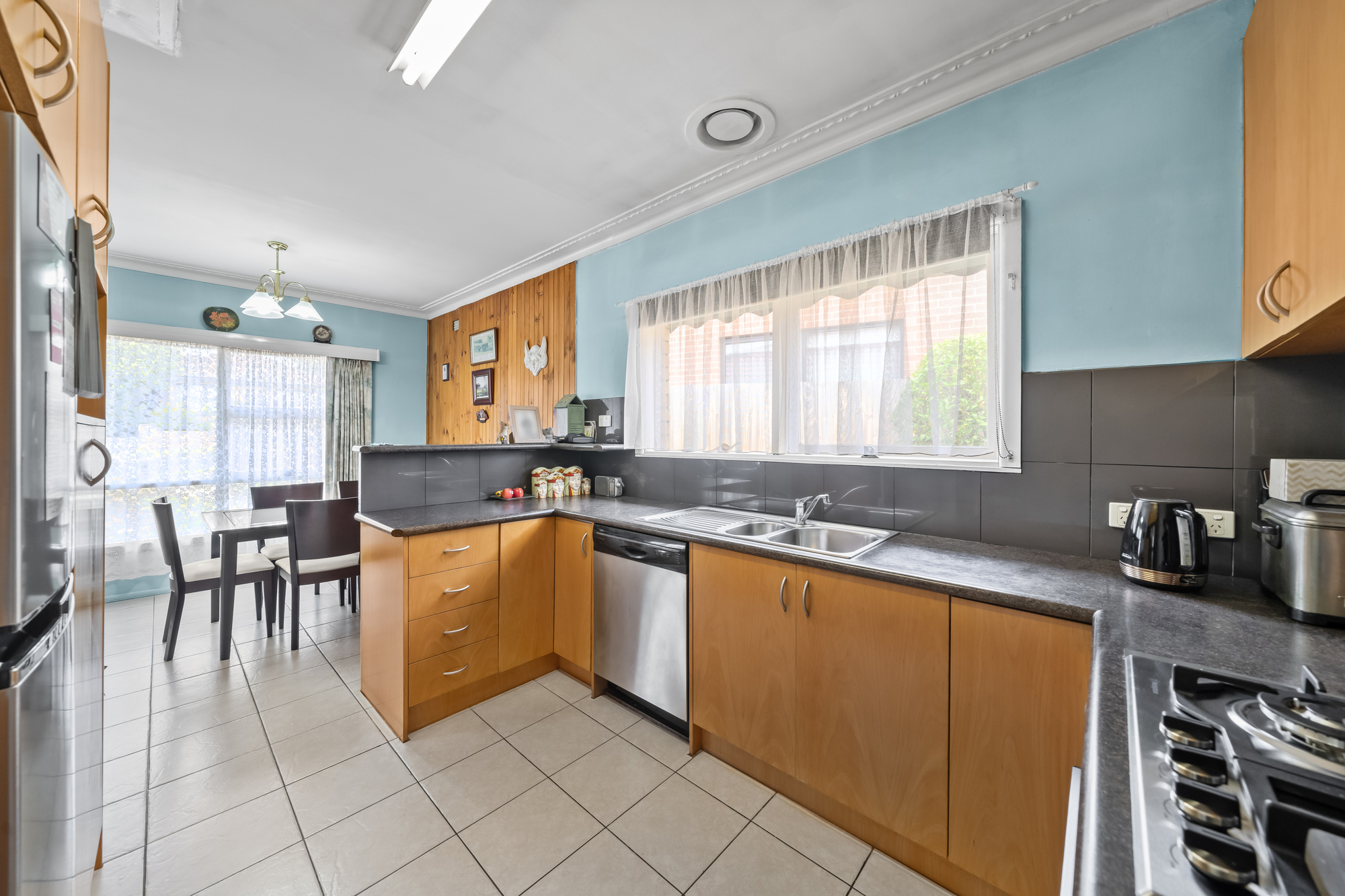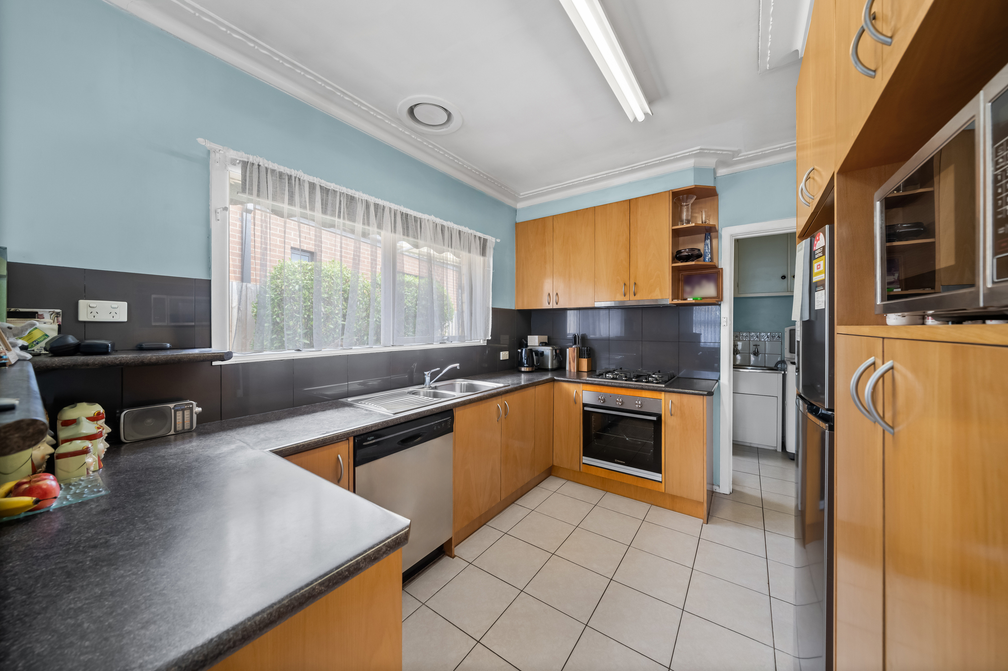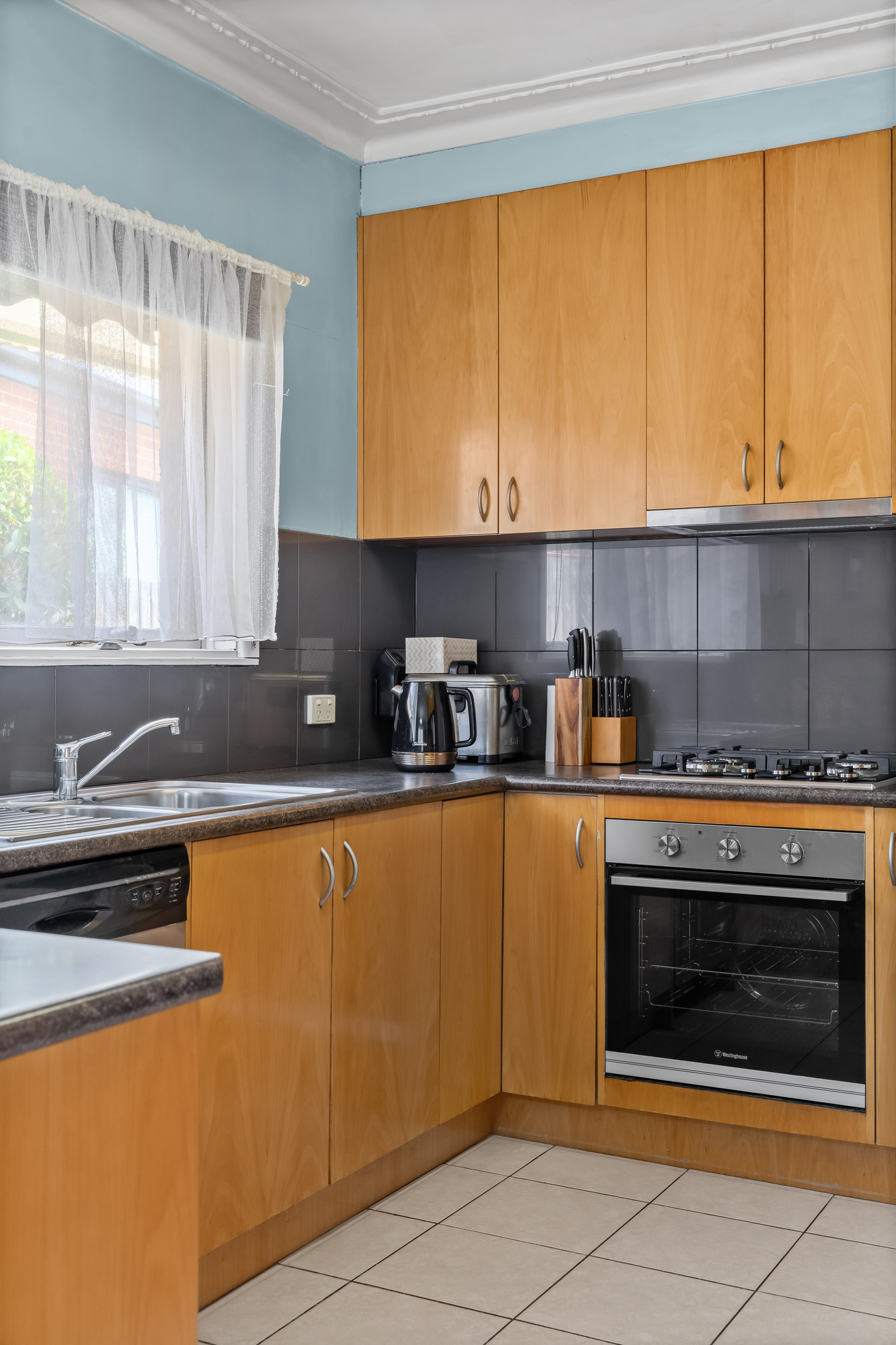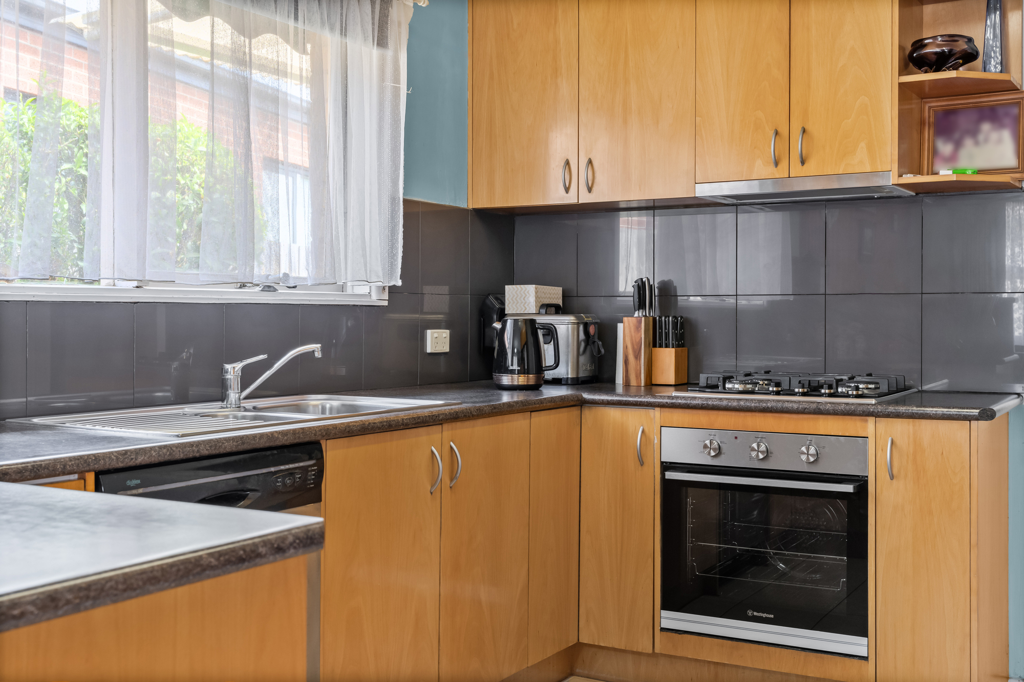 The kitchen is centrally positioned and features a U-shaped layout with good bench space, light cabinetry with contrasting benchtops, tiled splashback, and ample overhead and under-bench storage. New appliances including an oven, cooktop, and rangehood have been installed, while a double sink beneath a window provides a pleasant garden outlook. A breakfast bar overhang offers casual seating.