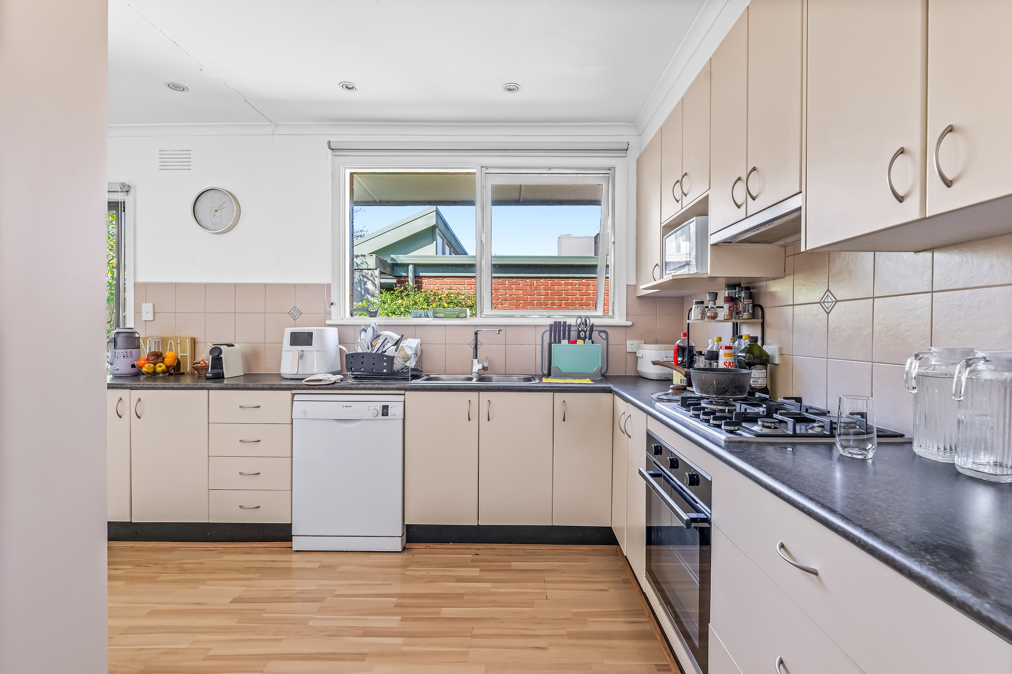 At the heart of the home, a light-filled open-plan living, dining, and kitchen zone impresses. The kitchen comes equipped with quality appliances including a Bosch dishwasher, Everdure oven, Westinghouse gas stove, and a double undermount sink, enhanced by a skylight. Sliding doors connect the family spaces to a deck ideal for entertaining, overlooking a spacious low-maintenance backyard with storage shed. Additional highlights include split system heating/cooling, a carport, and a neatly presented front garden.