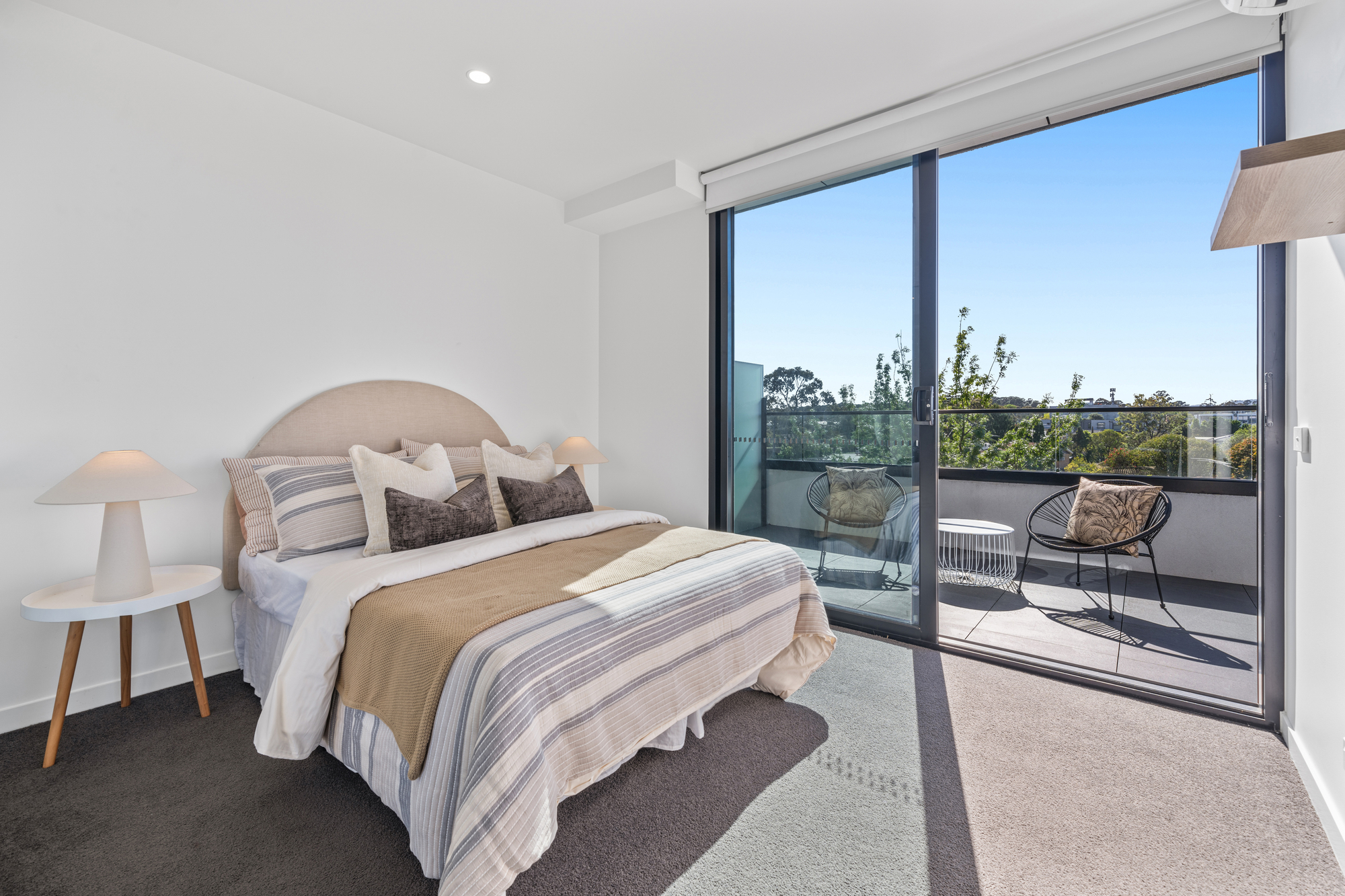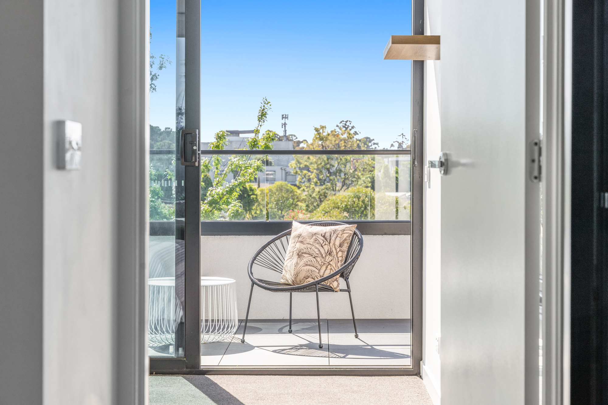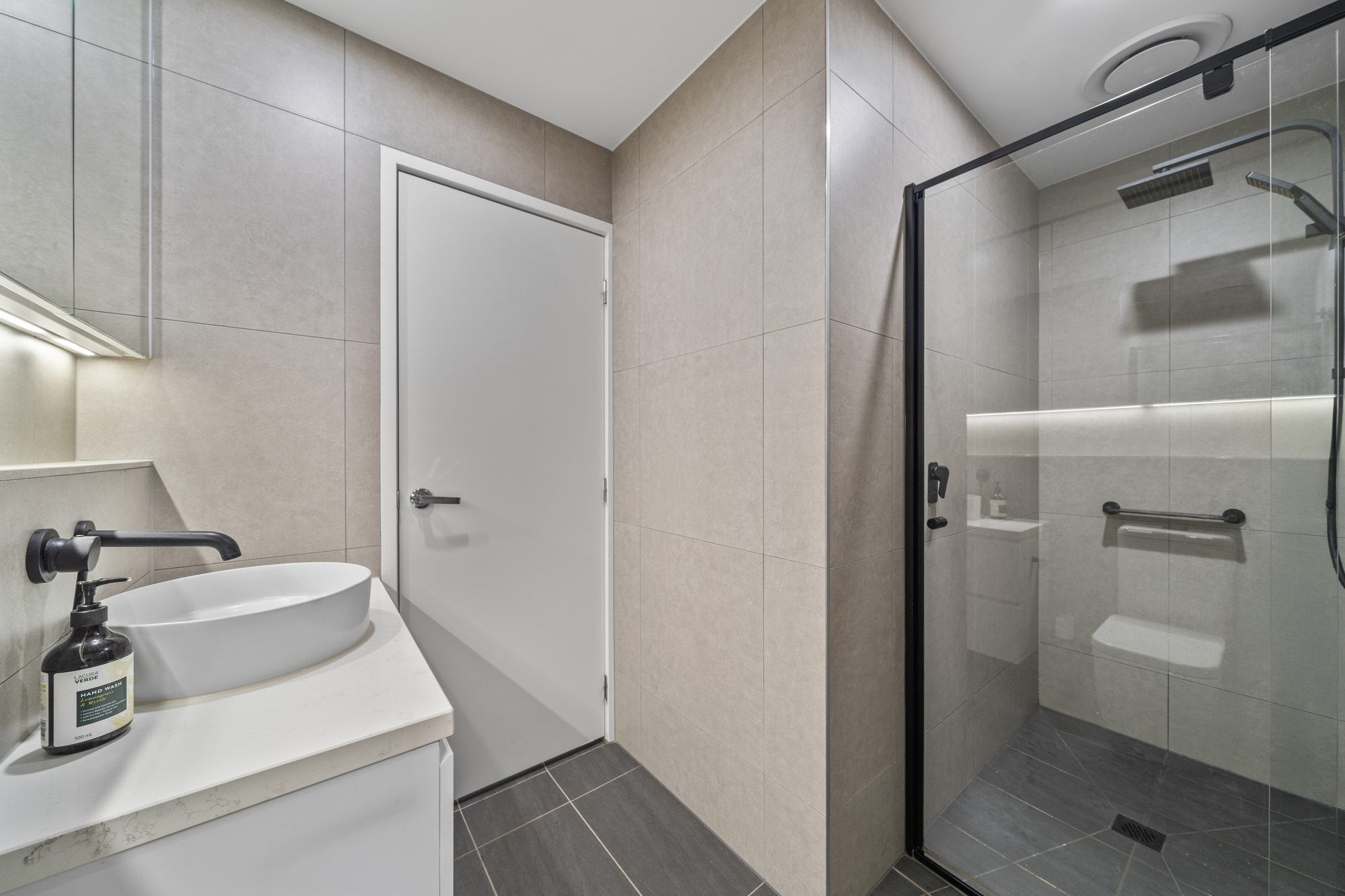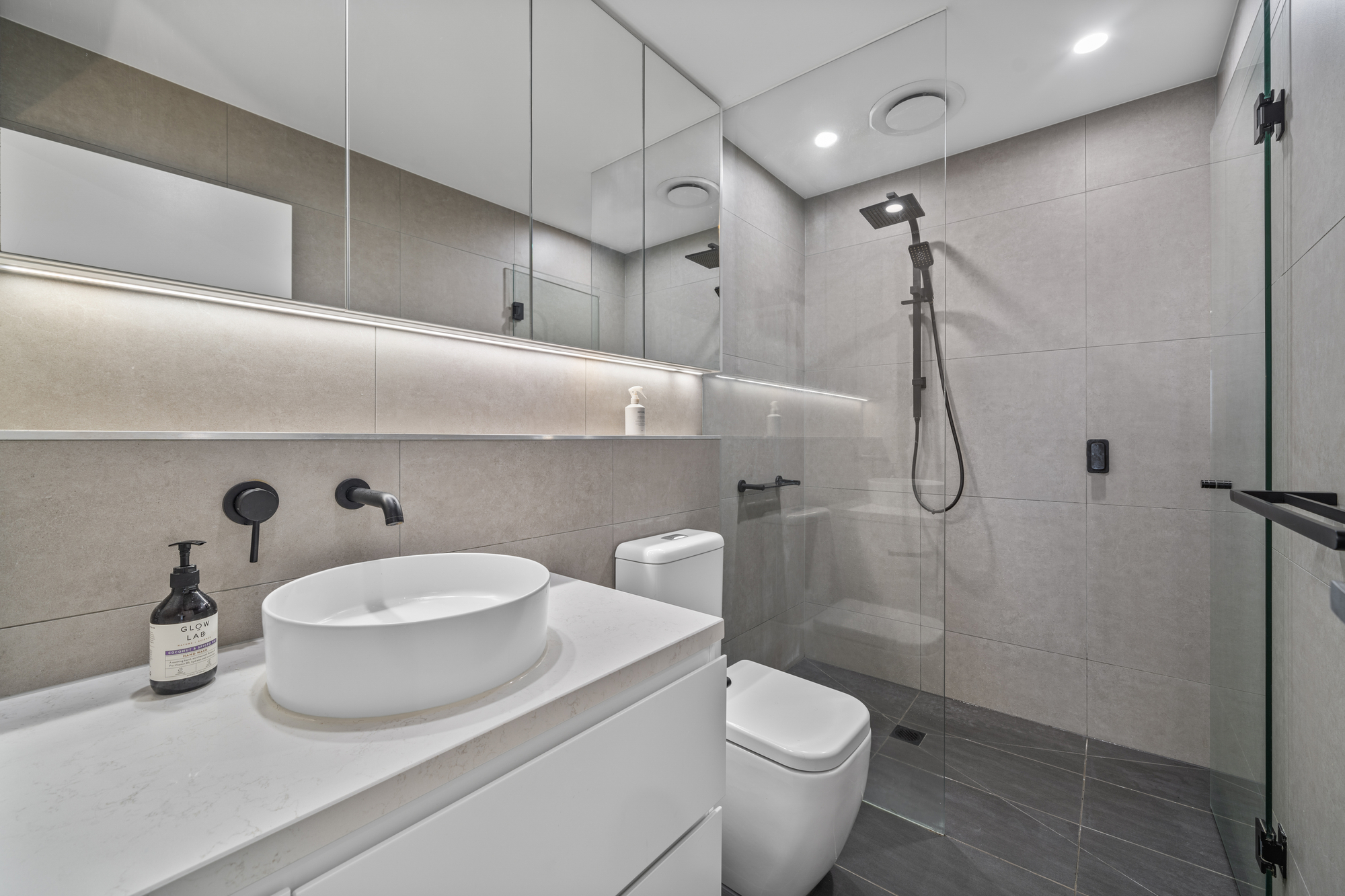 Two generous bedrooms provide peaceful retreats, with the master offering mirrored built in robes and a full ensuite, while the second bedroom enjoys balcony access and leafy outlooks. The fully tiled bathroom continues the contemporary theme with a walk in rainfall shower, stone vanity, and mirrored cabinetry.