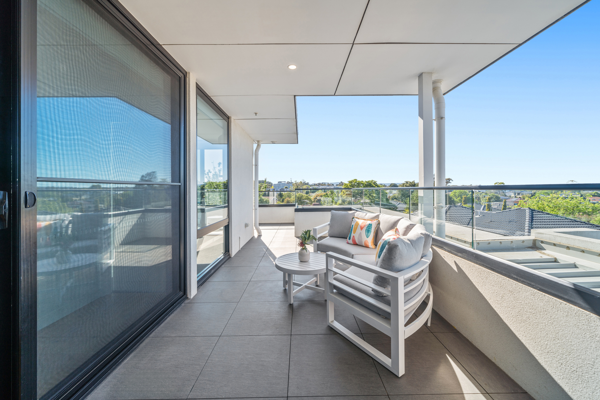 A seamless connection to the expansive wraparound balcony creates the perfect setting for entertaining while enjoying panoramic district views. Timber flooring adds warmth throughout the main living area, complemented by split system heating and cooling for year-round comfort. The sleek kitchen features stone benchtops, a gas cooktop, integrated oven, breakfast bar, and ample soft close storage finished with matte black tapware.