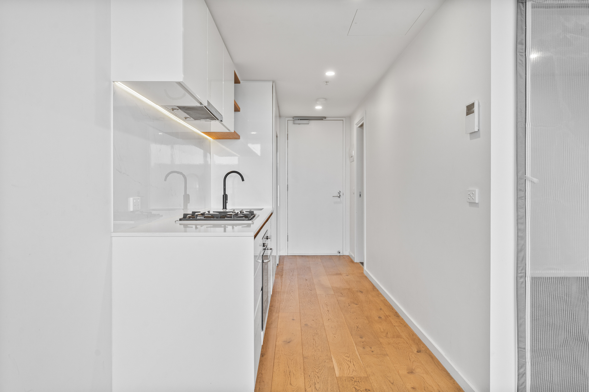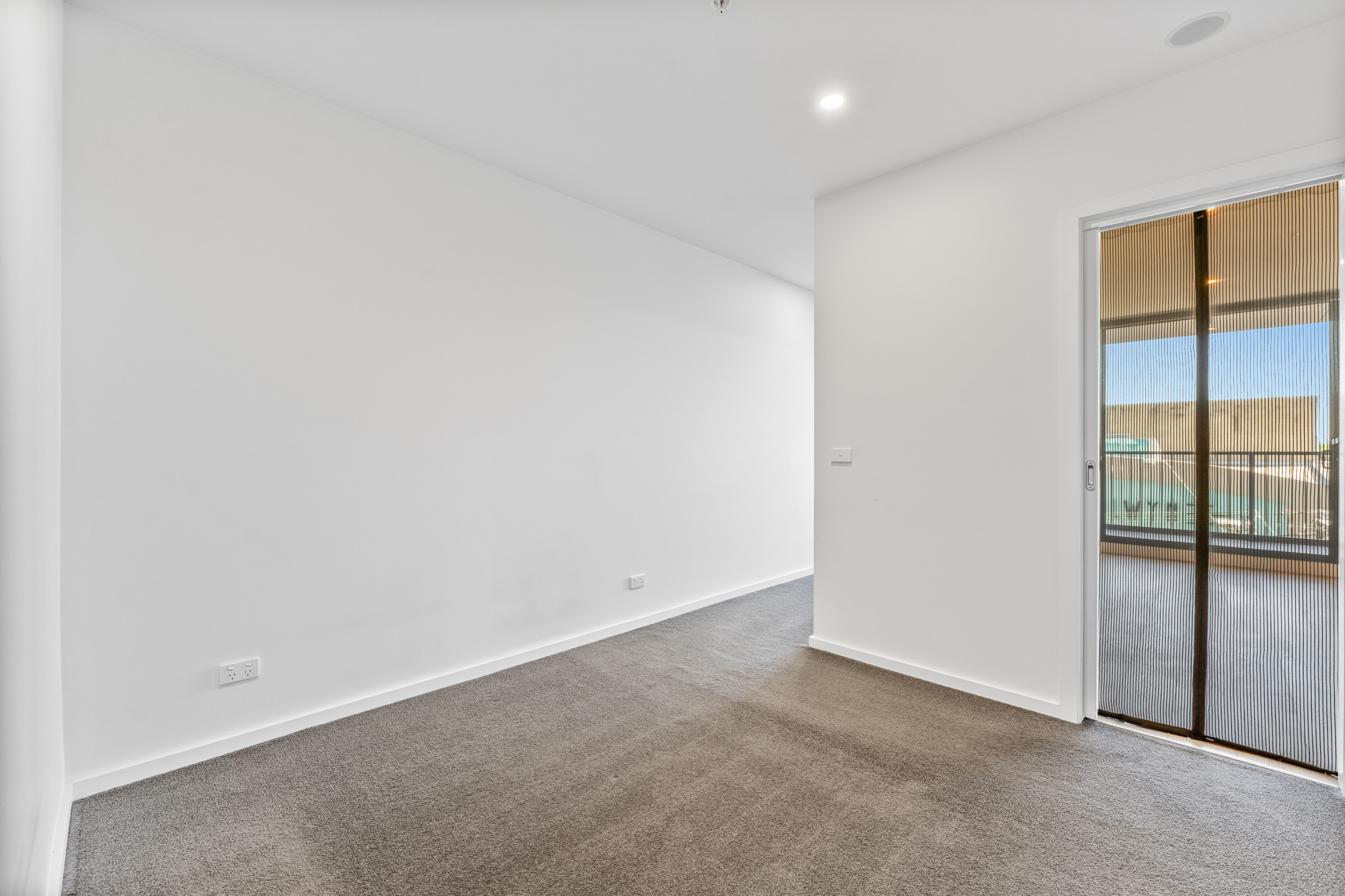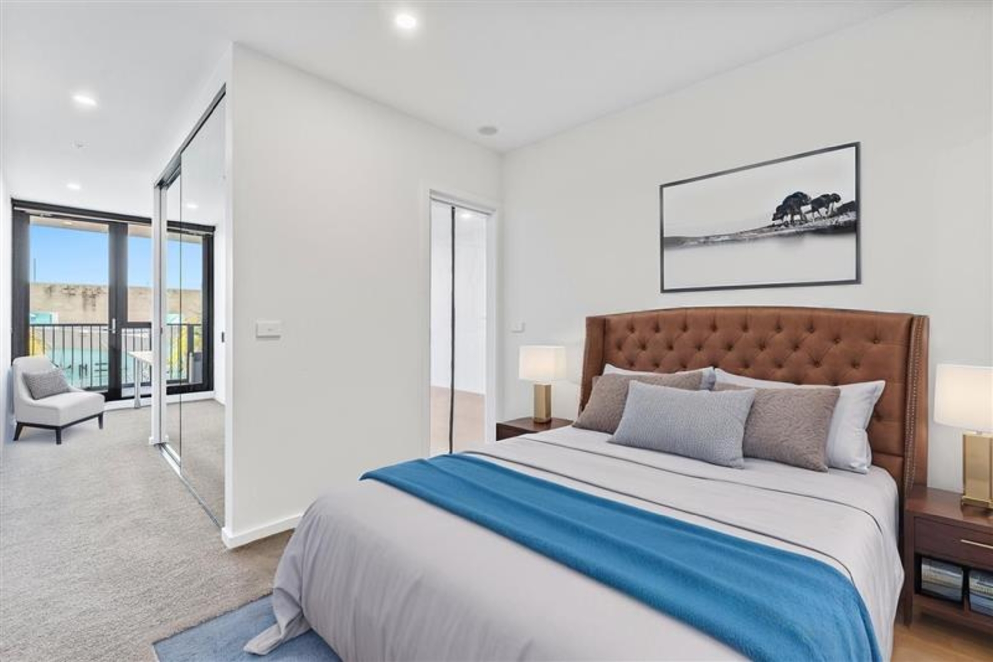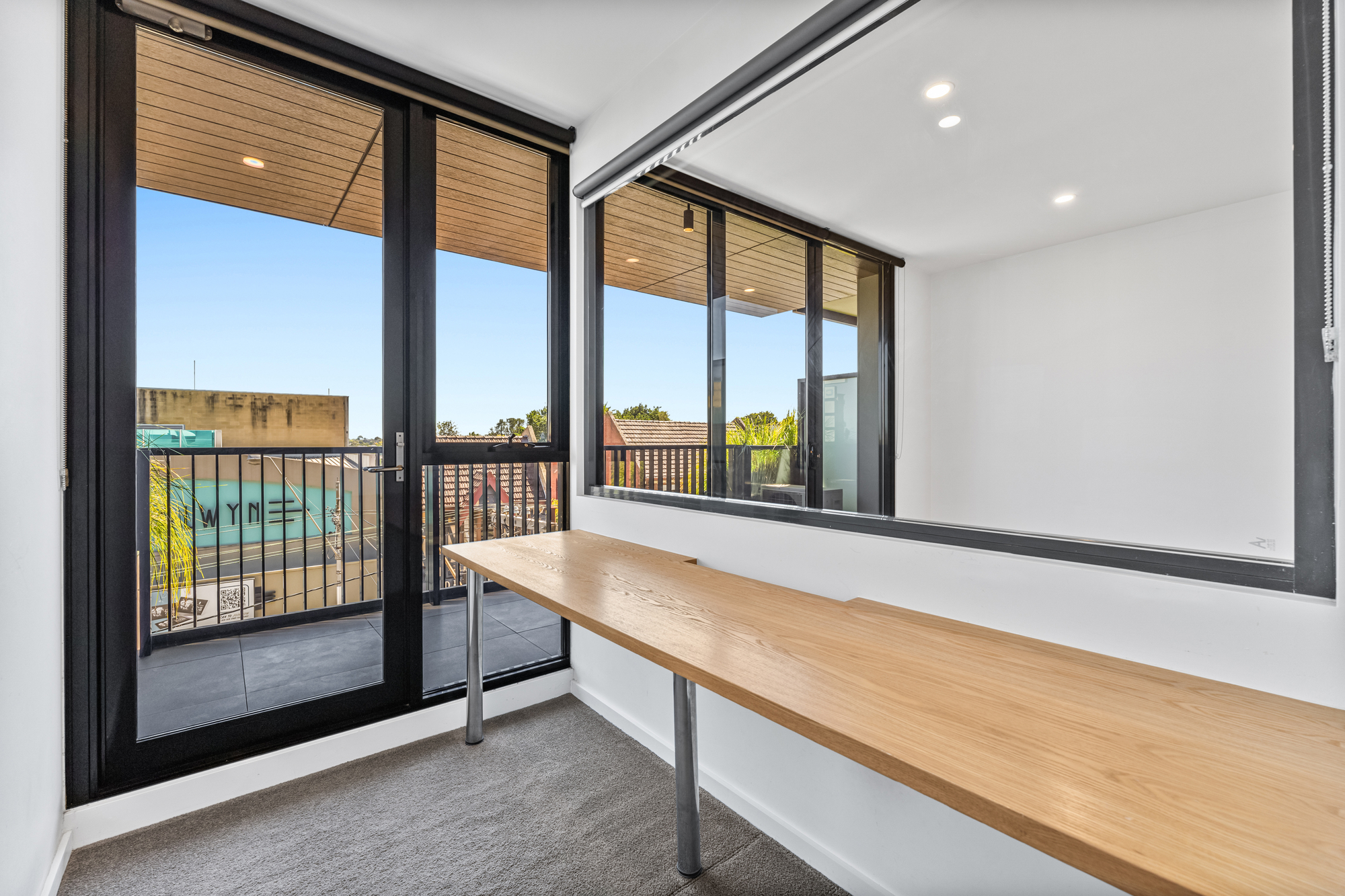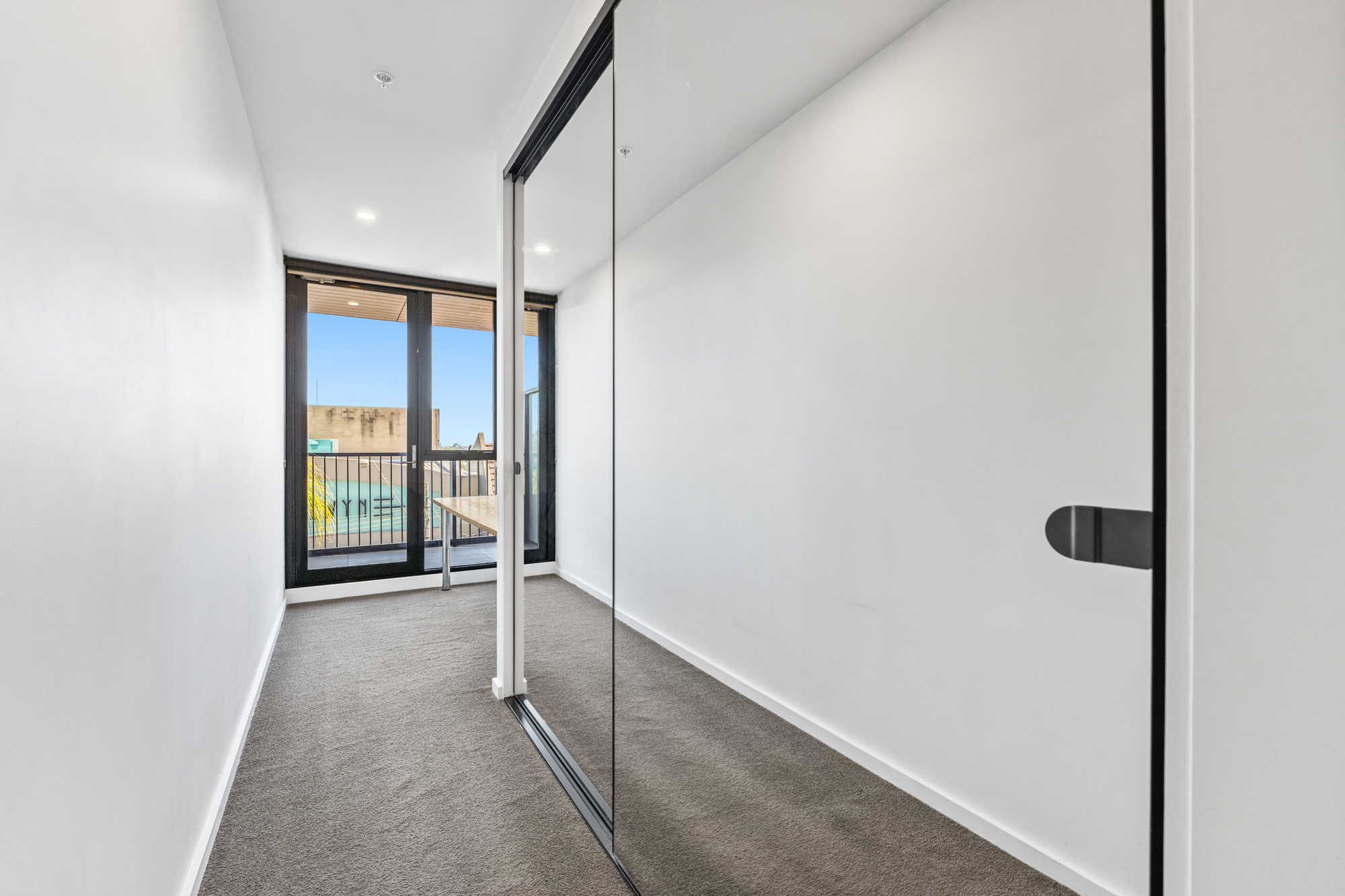 The carpeted bedroom includes mirrored built-in robes, a fixed desk area, and direct access to both the balcony and the central bathroom via sliding doors, creating a flexible and efficient layout. The bathroom features a frameless shower with rainfall head and a modern vanity, while a discreet European laundry is incorporated within the apartment. Additional features include intercom access and excellent natural light.