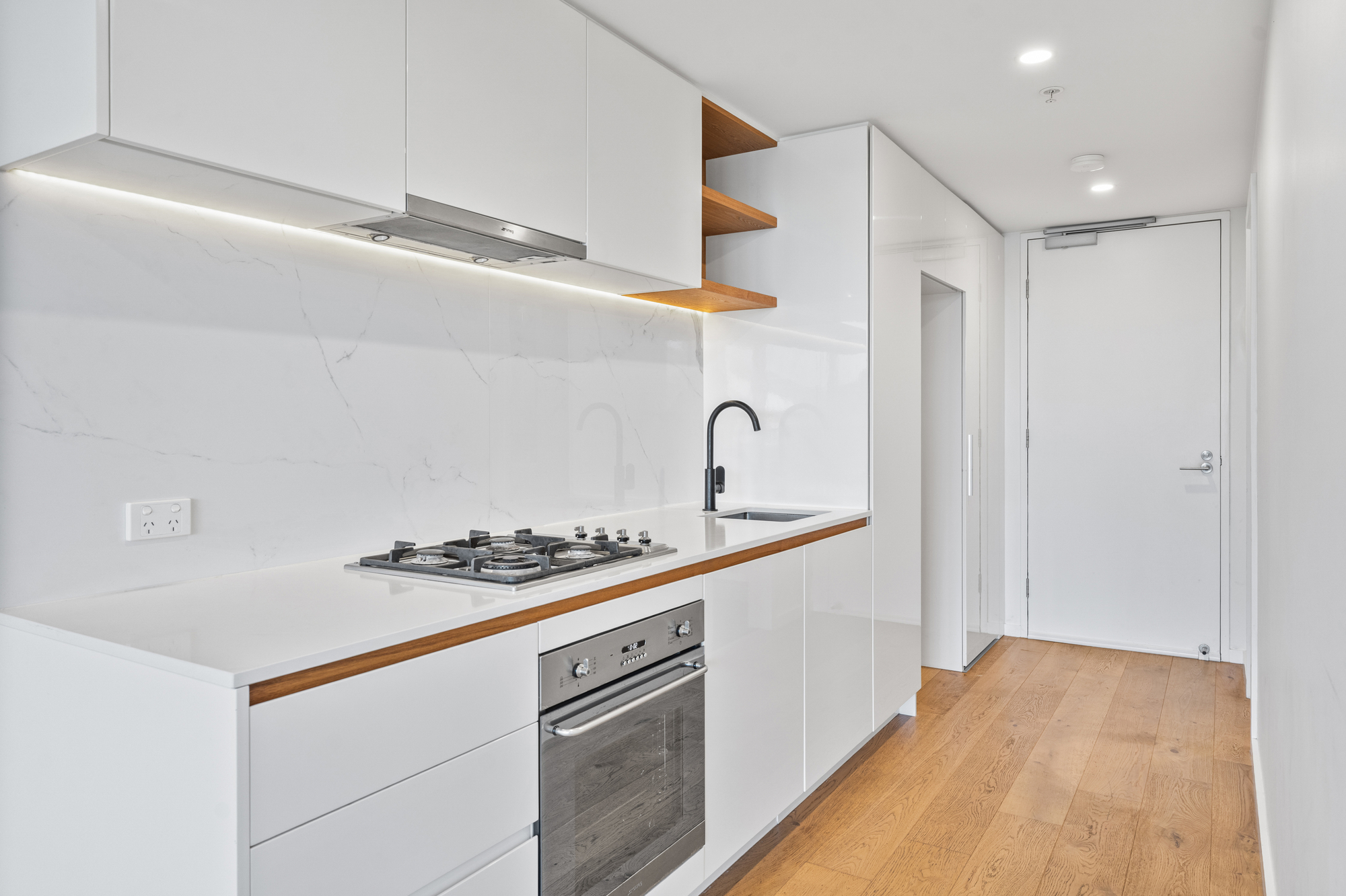 The open-plan living and dining zone features refrigerated cooling and opens via sliding doors to a private balcony, allowing natural light to flow throughout. The kitchen is finished in a European style and fitted with premium Smeg appliances, including a gas cooktop and electric oven, complemented by marble stone benchtops and splashback.