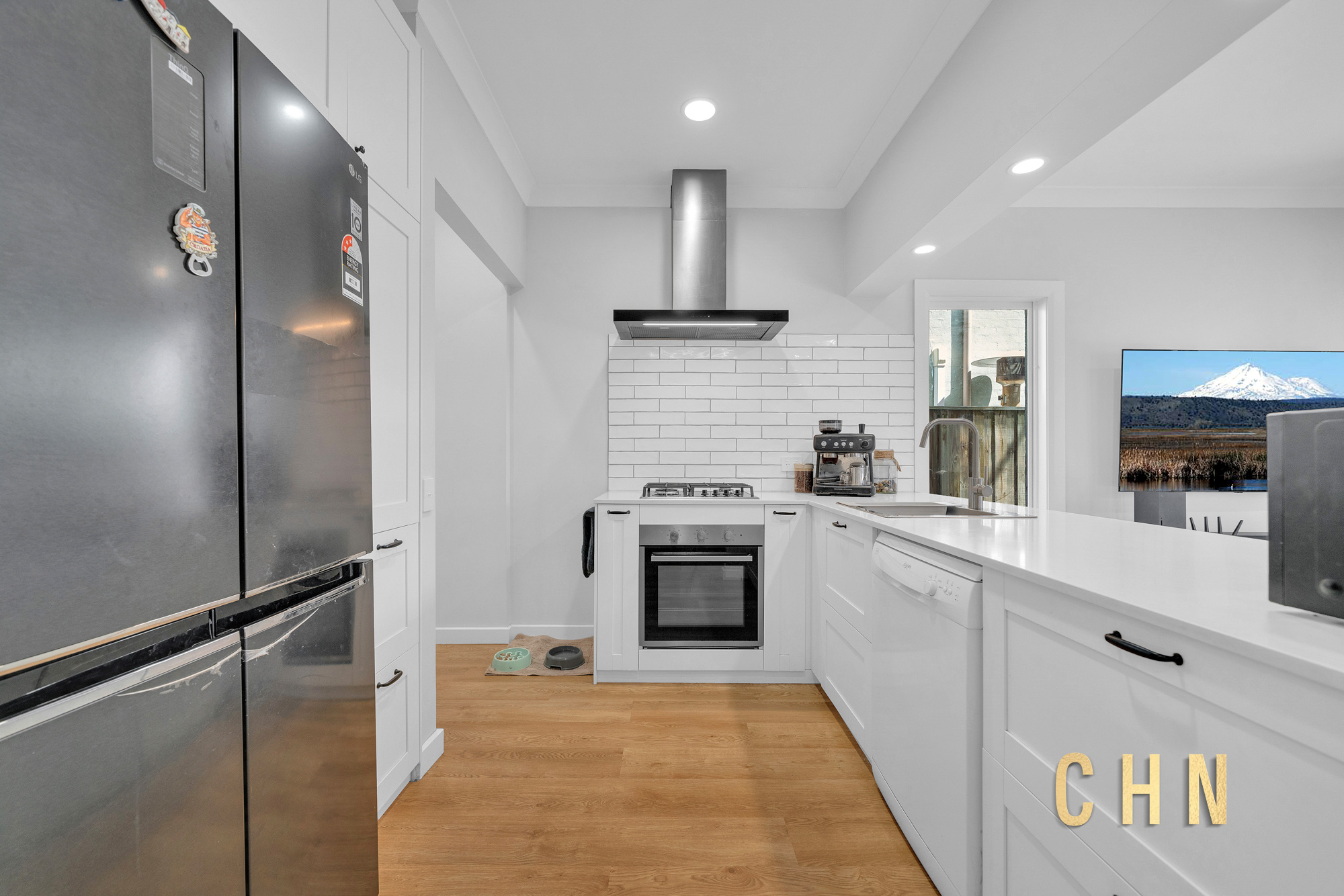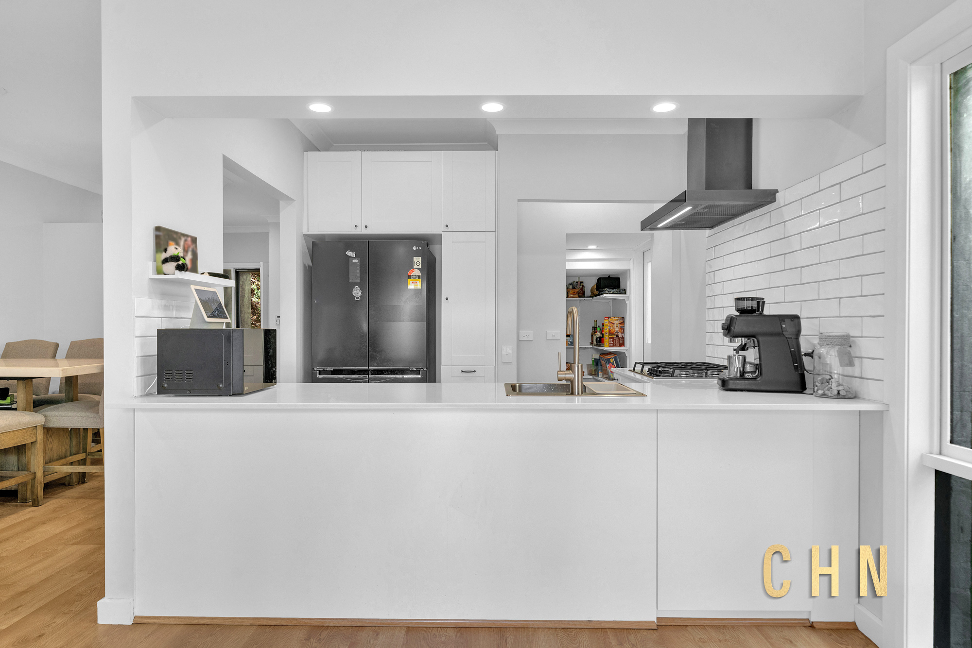 -The U-shaped kitchen is a chef’s delight, featuring stone benchtops, gas appliances, a tiled splashback, and a fantastic walk-in pantry.