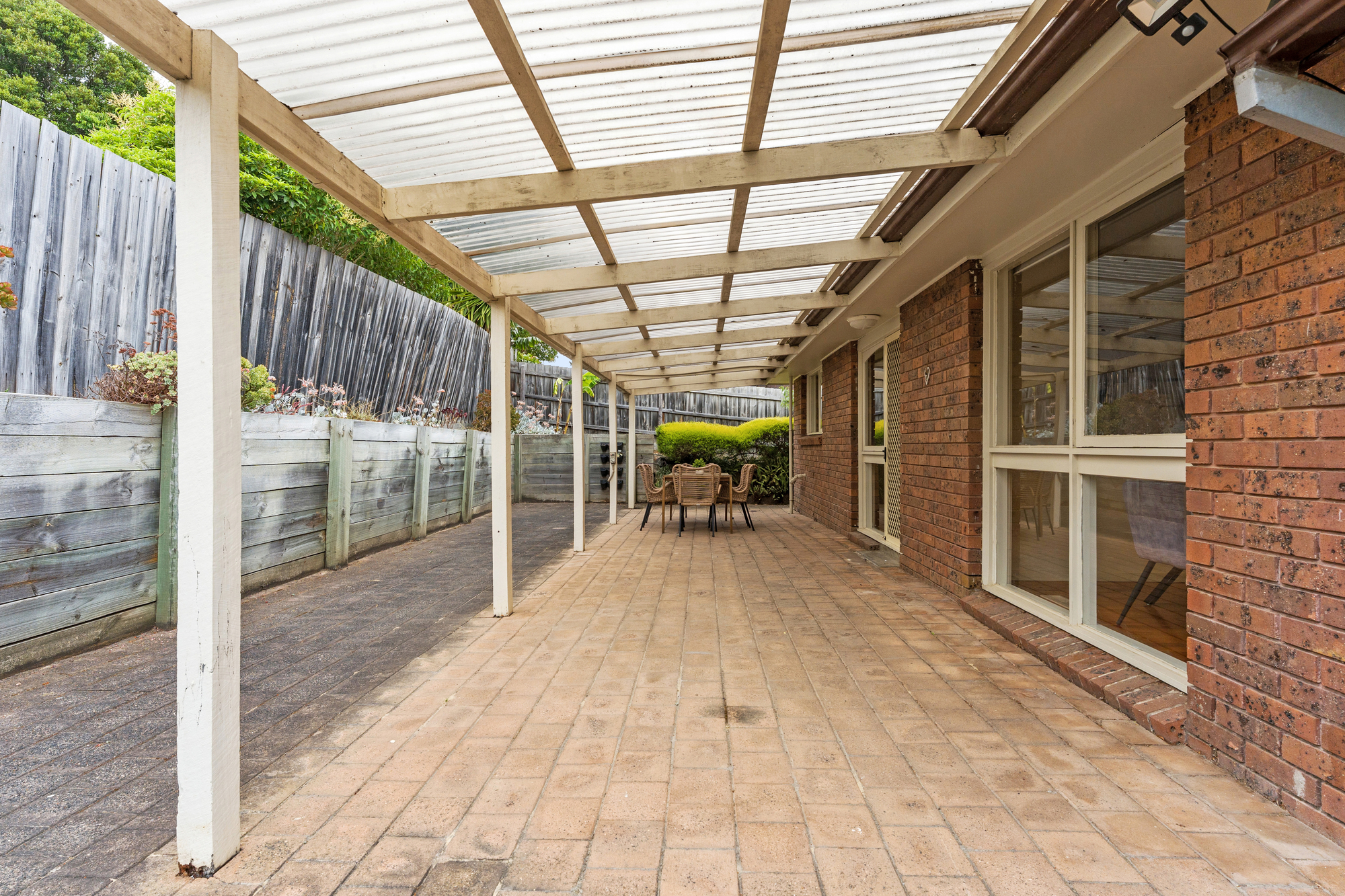 Additional spaces include a laundry with direct access to the backyard and a garden shed providing extra storage. Outdoors, a covered alfresco with brick flooring overlooks a raised grassed garden area, landscaped and well maintained for relaxed outdoor living. A dedicated binstorage area with door adds further everyday convenience.