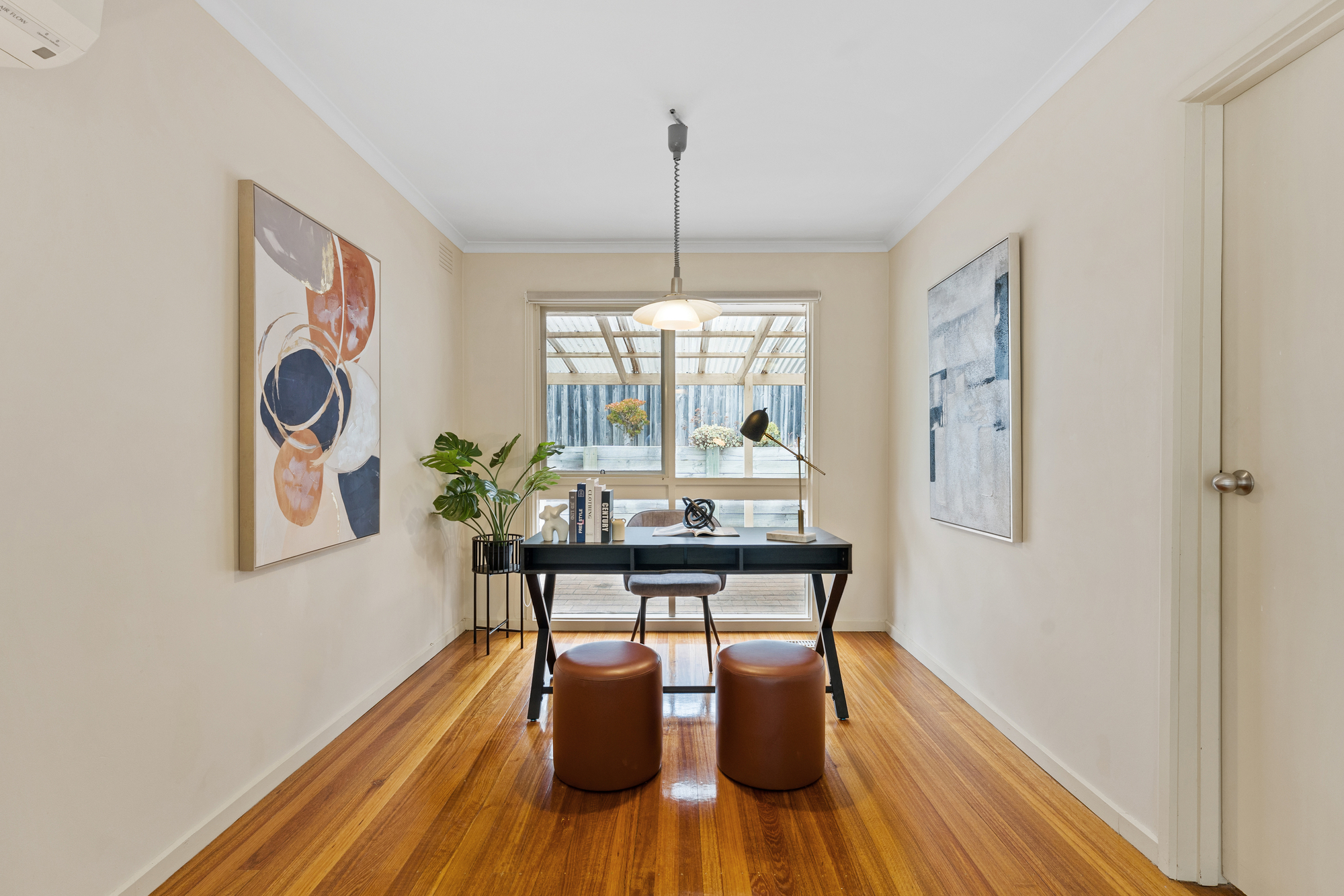 Timber flooring flows throughout the home, creating warmth and continuity across the living zones. The main living area is enhanced by corner windows to the front, drawing in excellent natural light, while split-system air conditioning and gas ducted heating provide year-round comfort. A generous study area positioned beside the living zone offers an ideal work-from-home or homework space. The dining area sits adjacent to the kitchen, creating a practical and connected layout for everyday