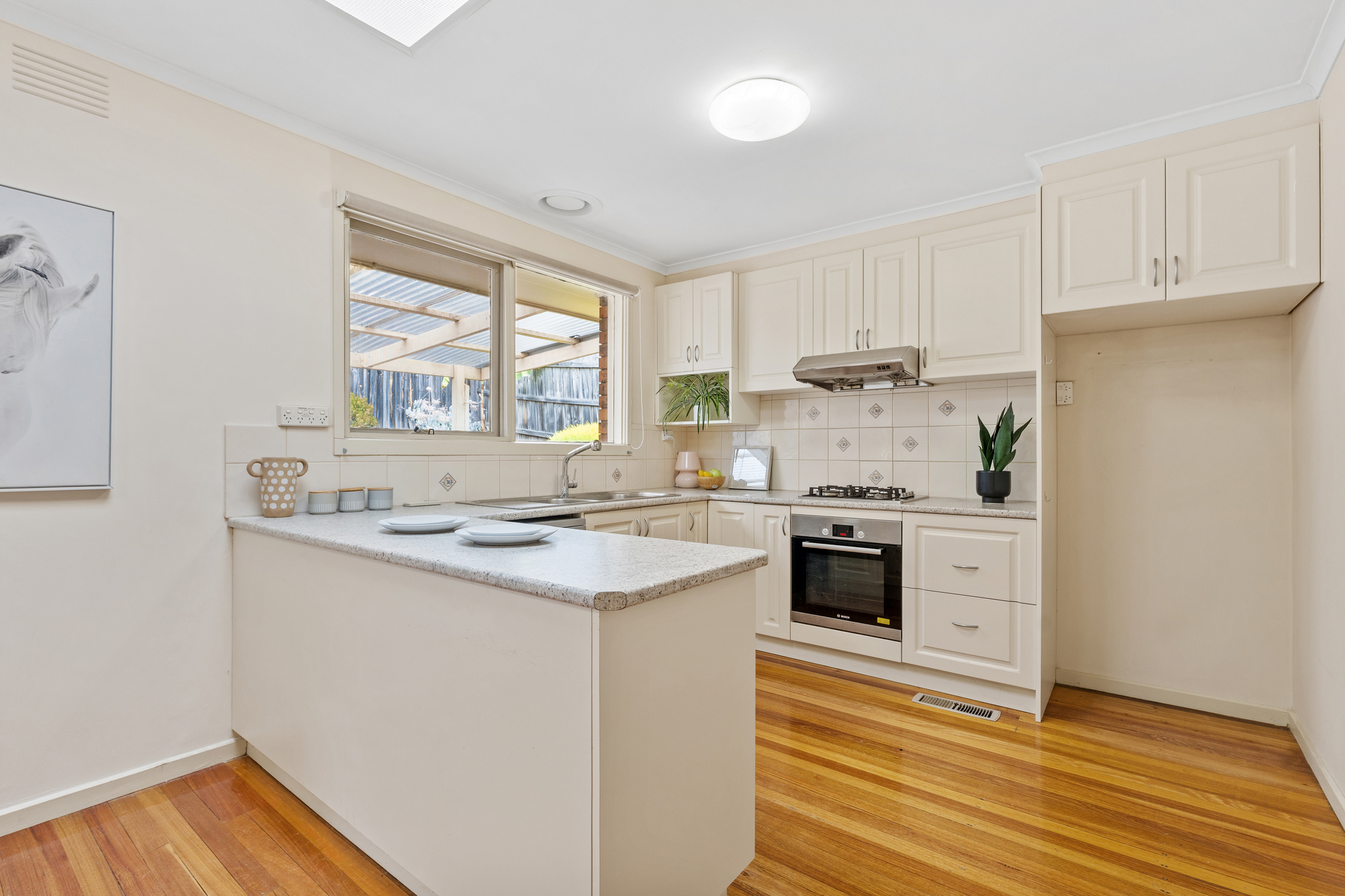 The kitchen is bright and functional, highlighted by a large skylight and fitted with laminate benchtops, dual sink, Bosch oven, Smeg dishwasher, four-burner gas cooktop, and pantry storage. Its central position makes it well suited to both daily use and entertaining.