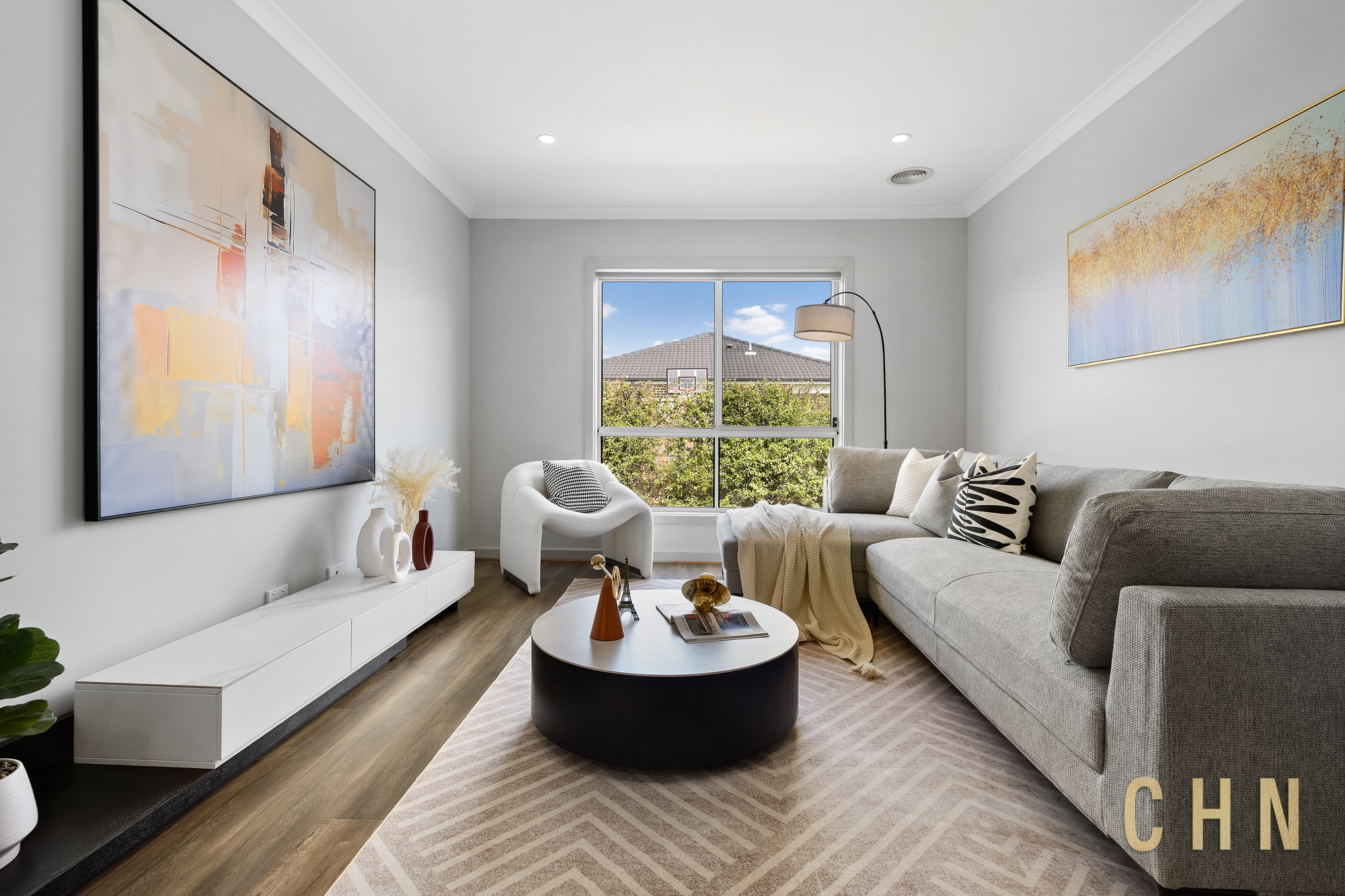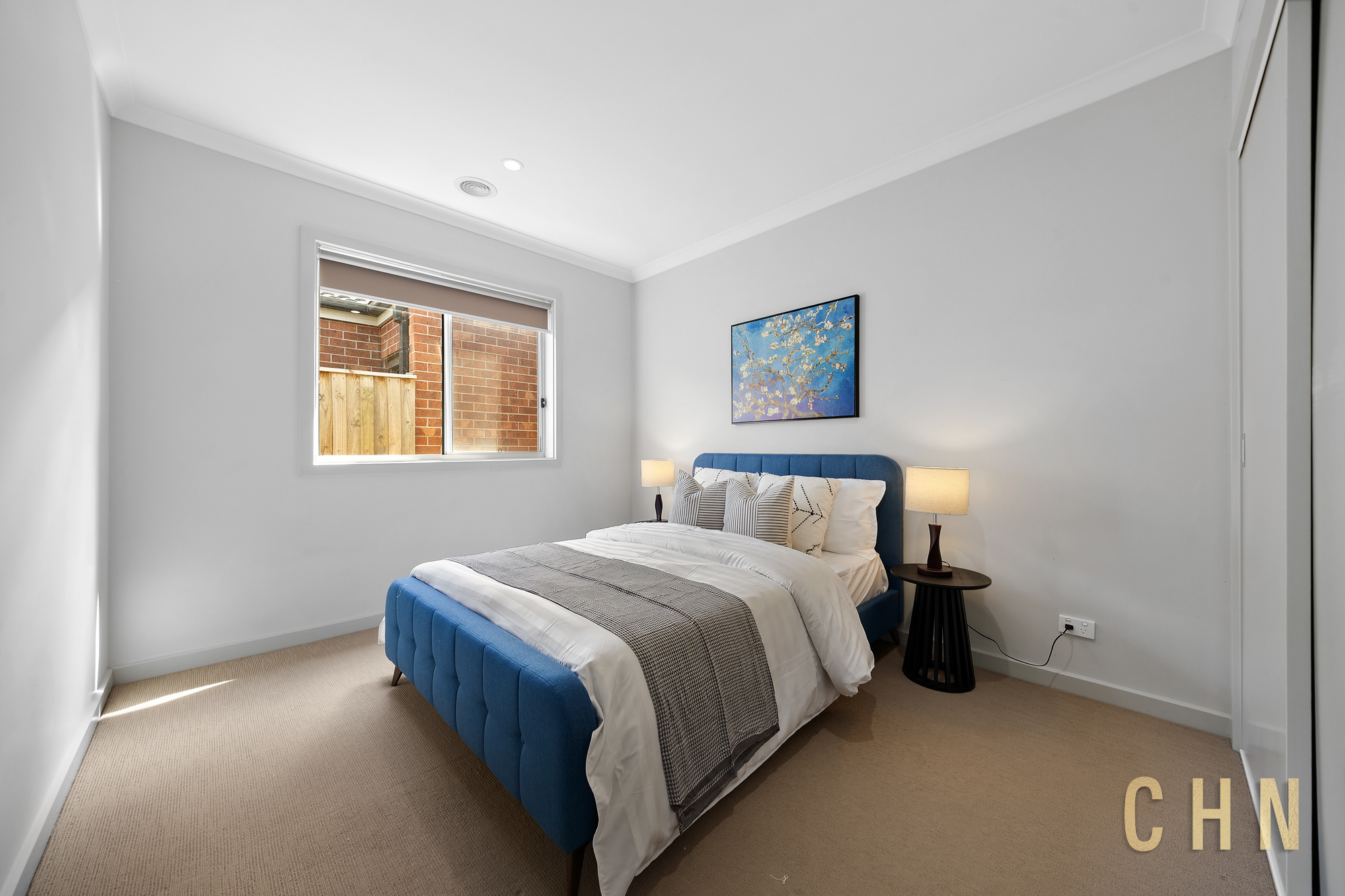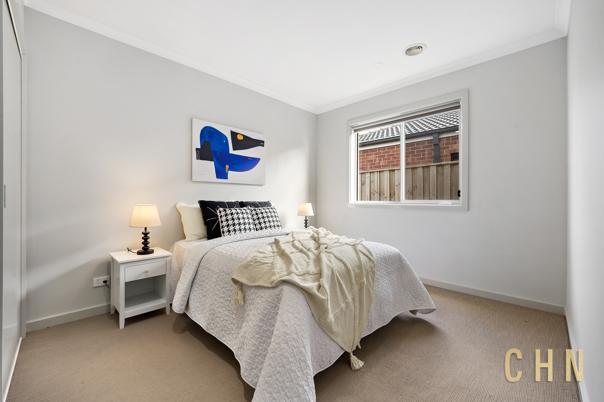 A painted concrete driveway, low-maintenance front garden and covered entry create a welcoming first impression. Inside, high ceilings and downlighting enhance the sense of space, while ducted heating and cooling provide year-round comfort.