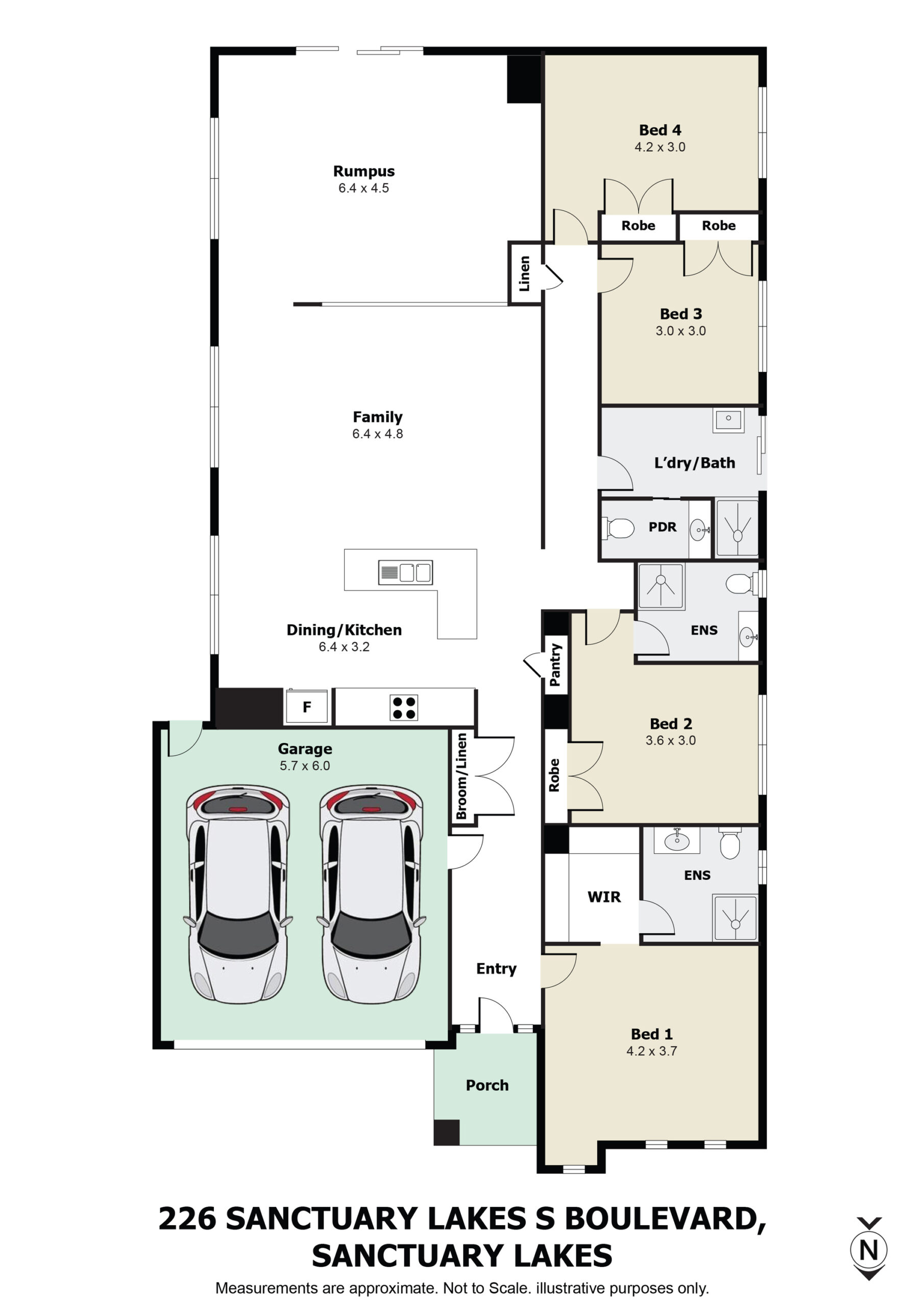 Step inside to discover a light-filled interior enhanced by LED downlights, evaporative cooling, and ducted heating. The home features a thoughtful floorplan with a tiled main living area and floorboard-paved bedrooms. The spacious master suite offers a walk-in robe and a private ensuite, fully tiled from floor to ceiling with an upgraded vanity, mirrored splashback, and walk-in shower. A second master bedroom in the middle of the home includes its own ensuite, perfect for guests or extended family.