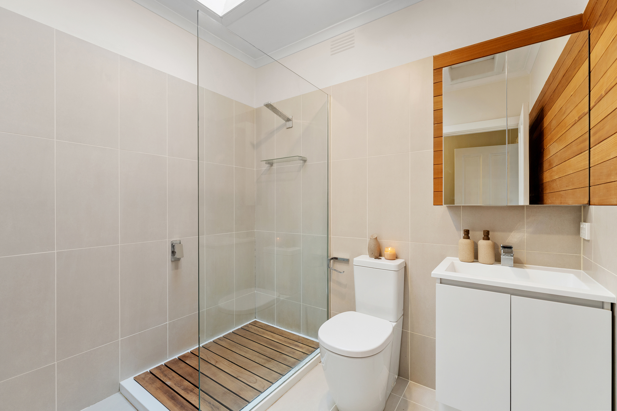 All three bedrooms include built-in robes, with one currently serving as a home office. The main bathroom is finished with grey pietra tiles, a large bathtub, and modern fittings, while the second bathroom adds convenience with a single-panel shower beneath a skylight.