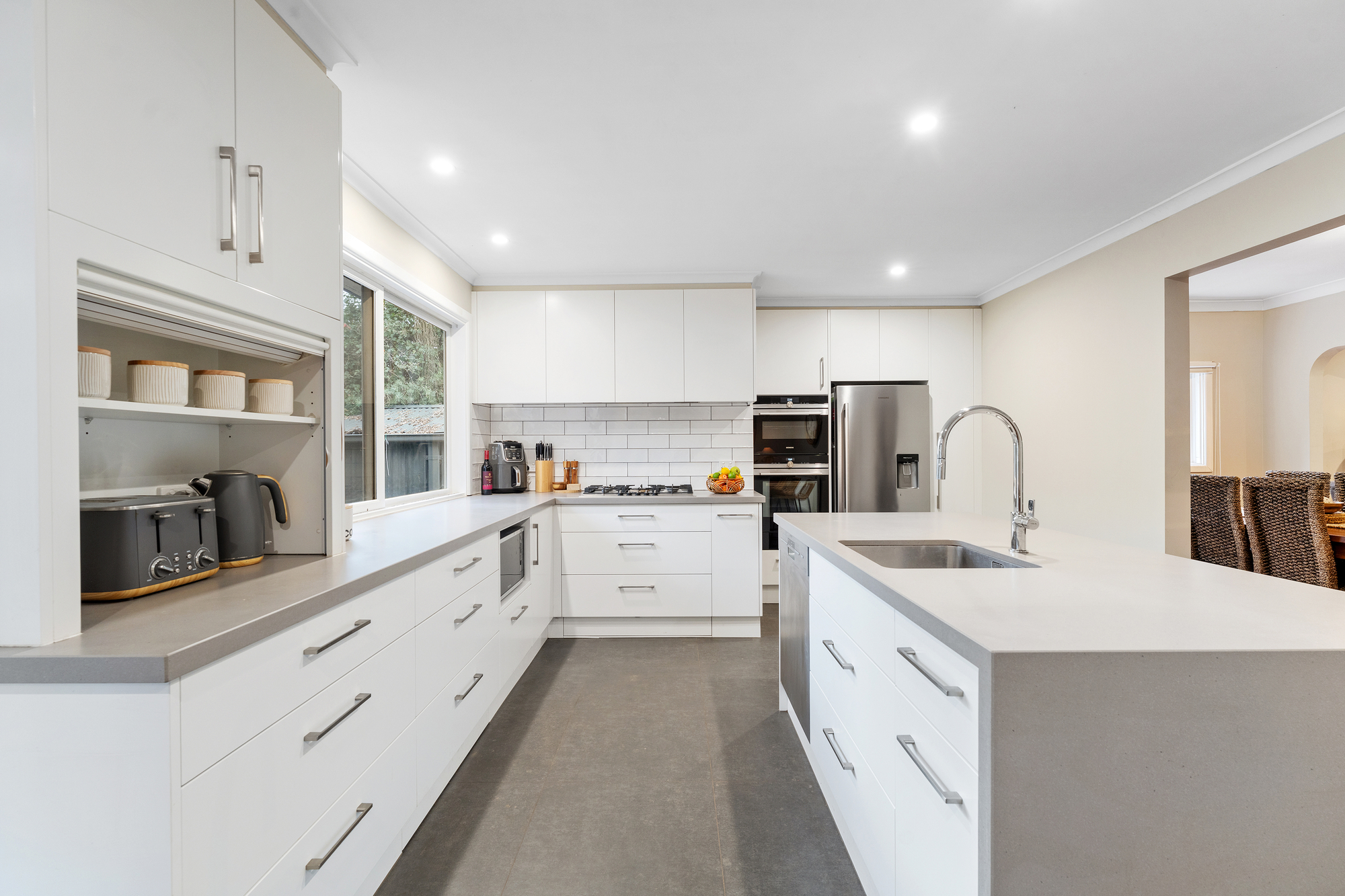 Inside, the spacious living area is complemented by two dining zones, including a welcoming alfresco space that invites gatherings with family and friends. Hydronic heating system and split systems are positioned throughout, ensuring year-round comfort. The kitchen, bathed in natural light, is designed for both function and entertaining, featuring Siemens appliances, a built-in pantry, and an island bench with seating.
