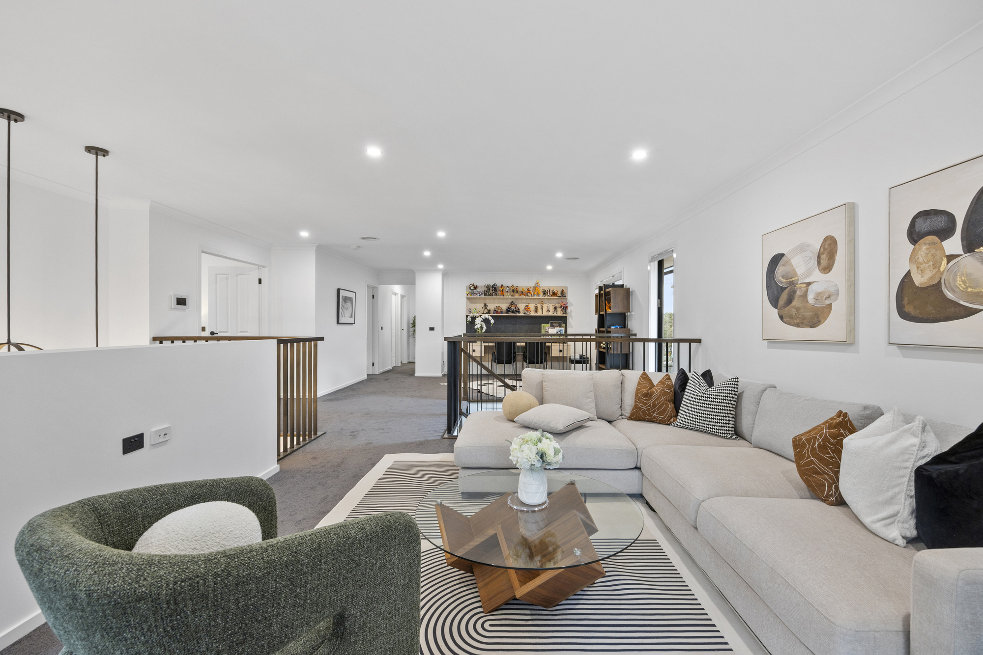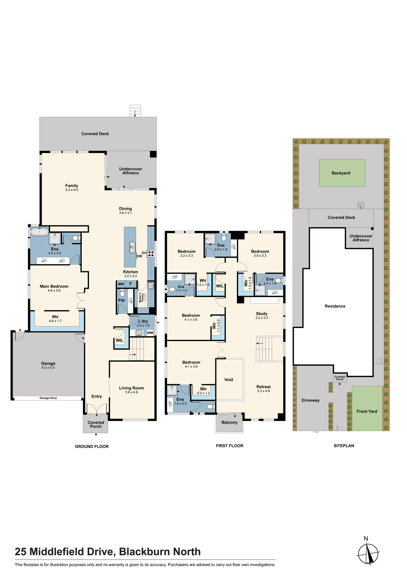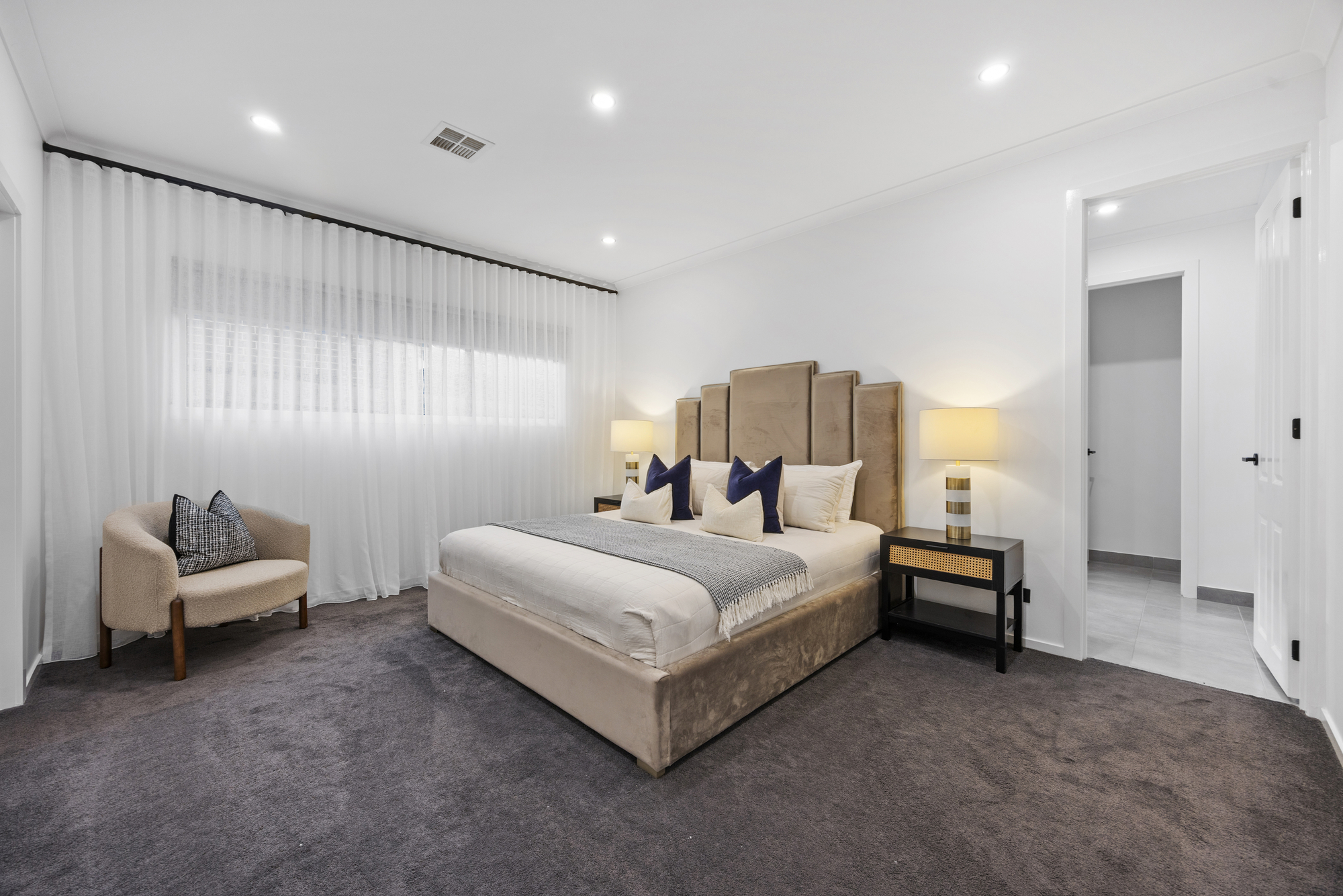The ground-floor master suite is a peaceful retreat, featuring an oversized walk-in robe and a luxe ensuite with dual vanities and a freestanding bath. Upstairs, four additional bedrooms each enjoy their own ensuite and walk-in robe, alongside two versatile living zones ideal for kids, guests or home office use, plus a private balcony.