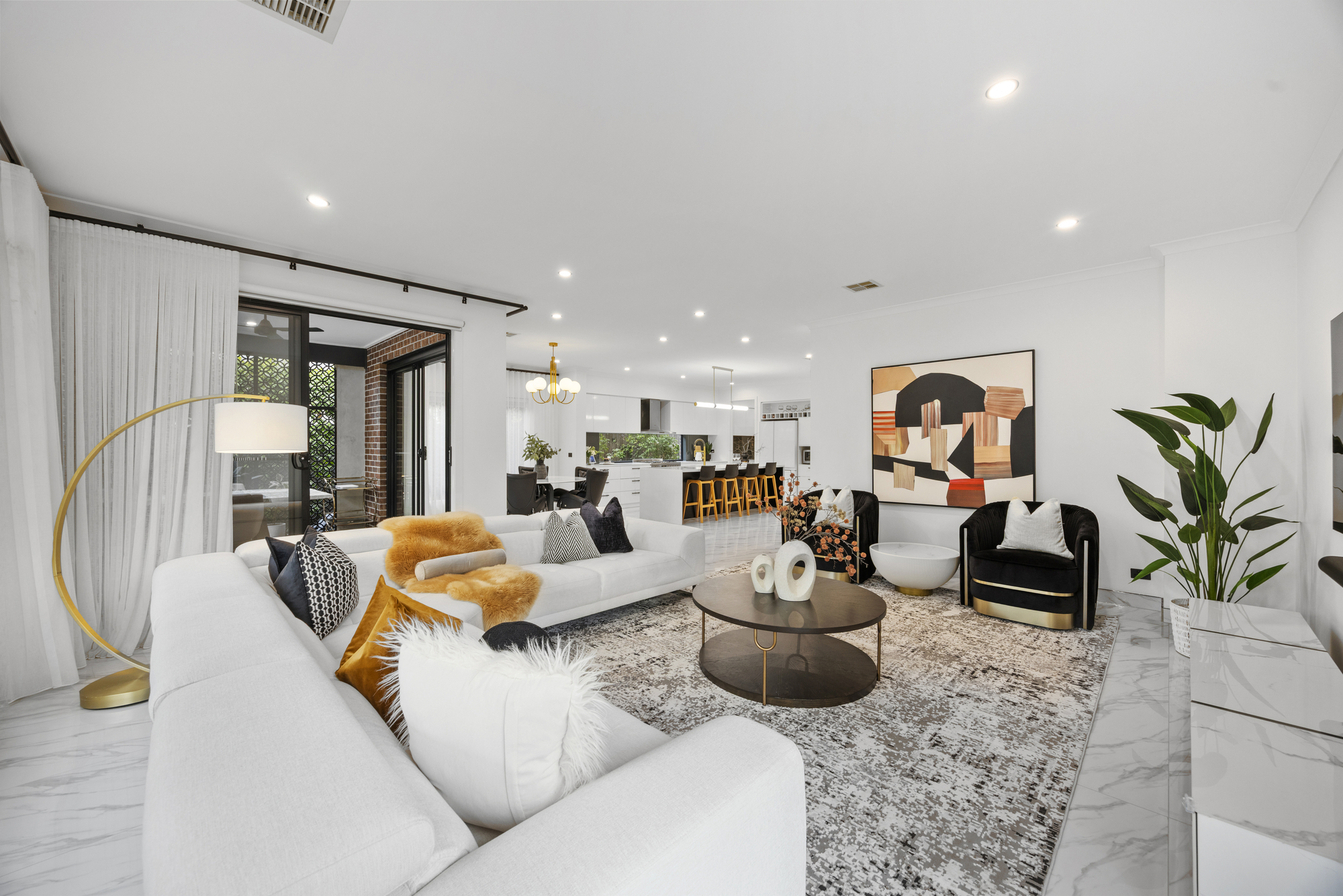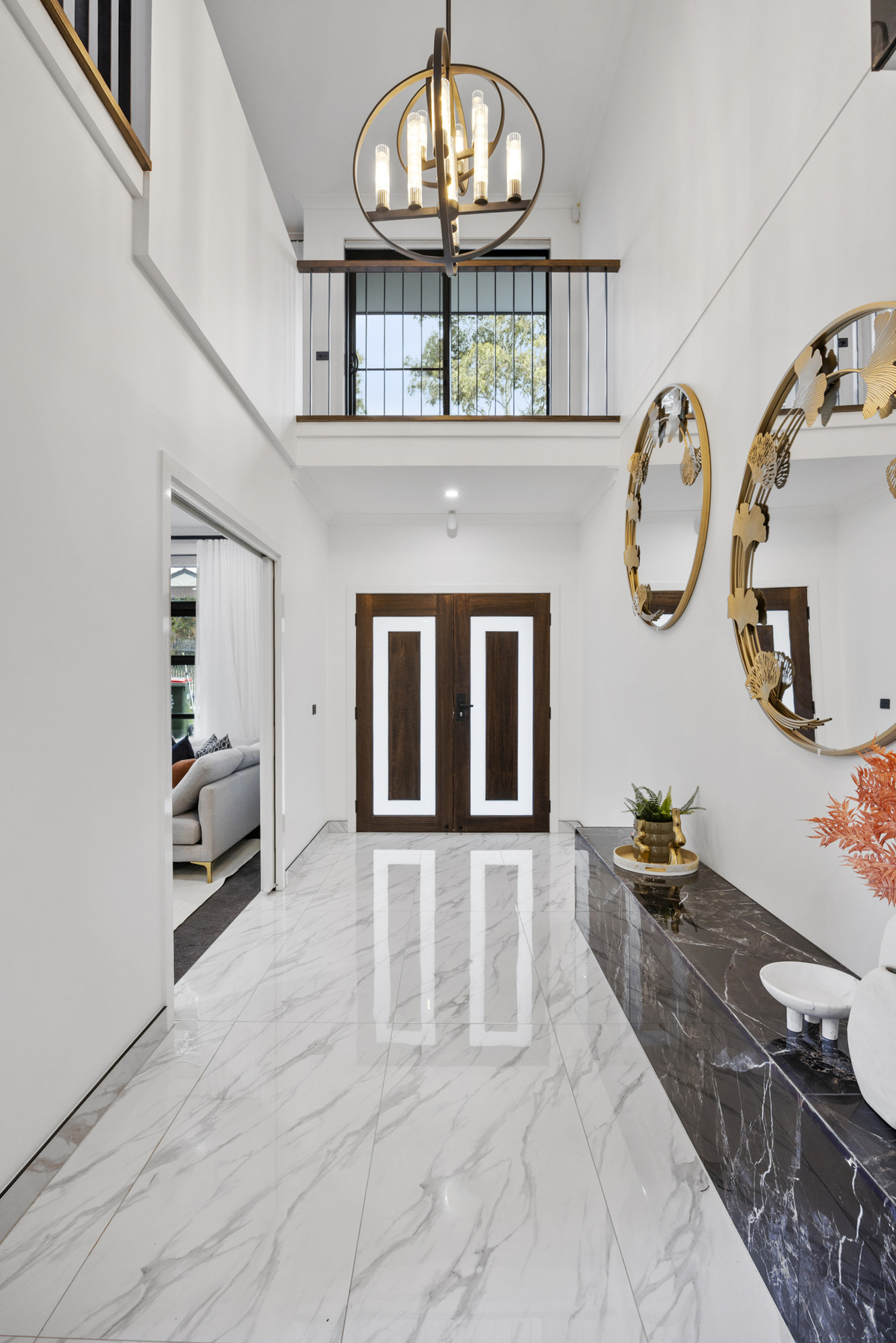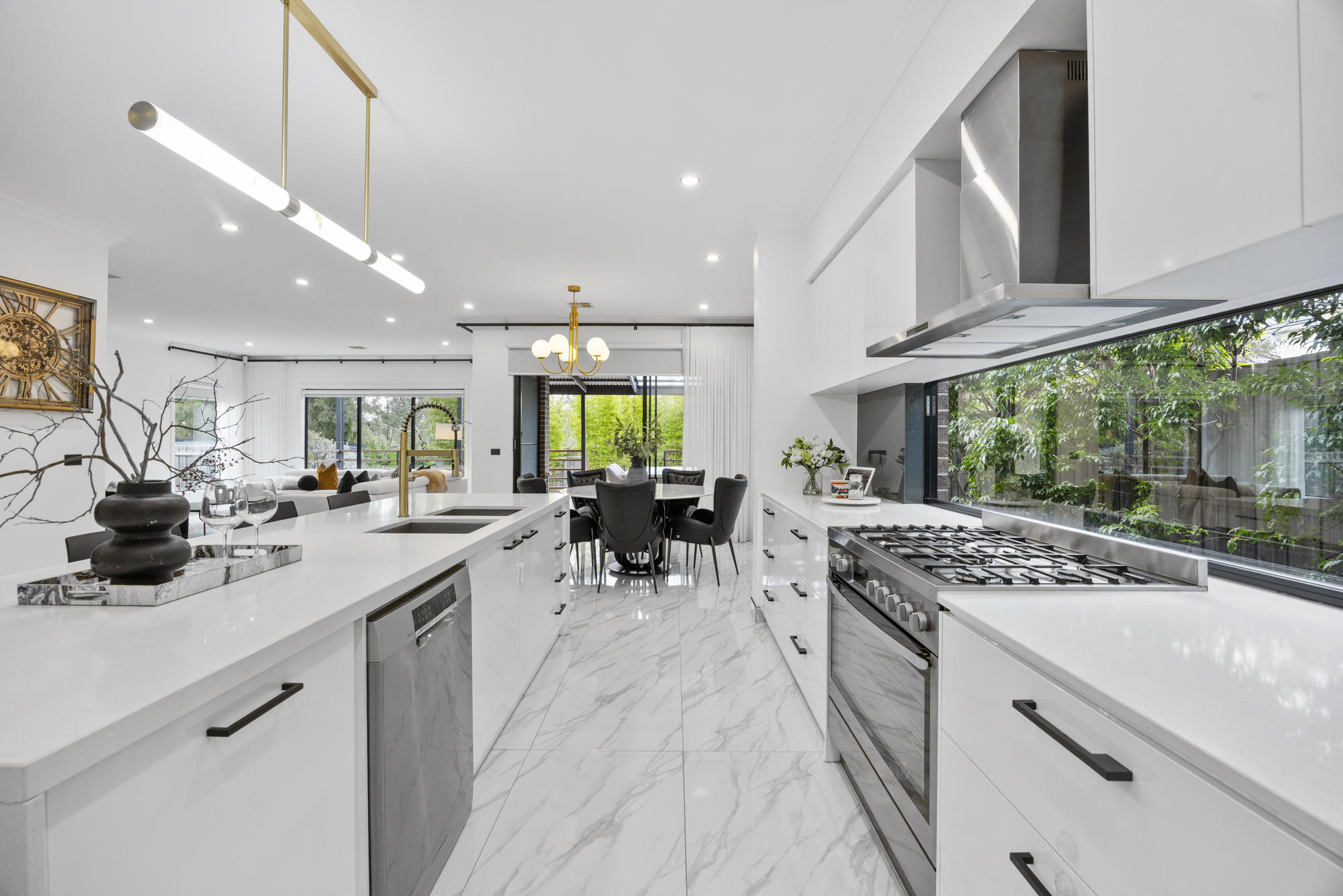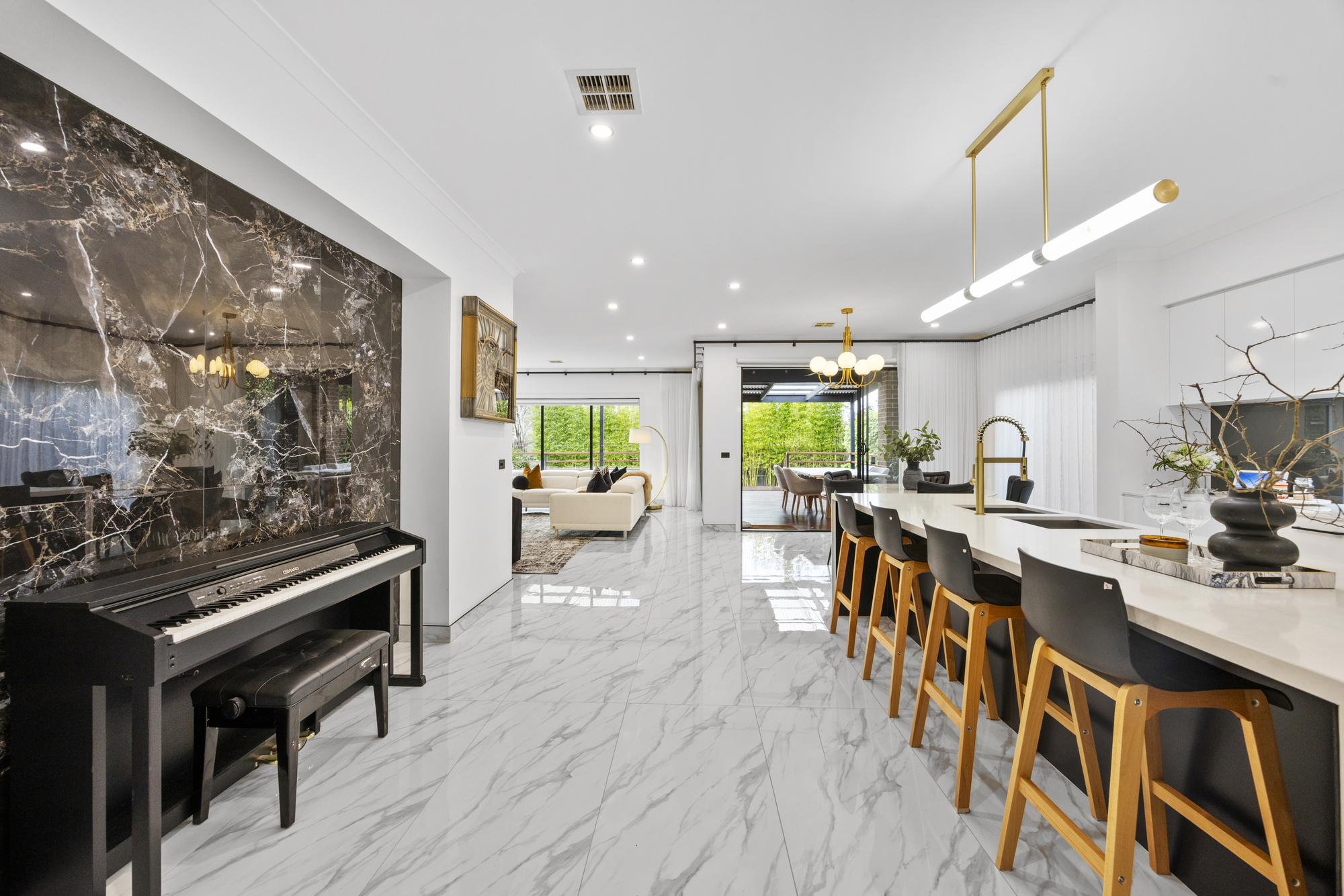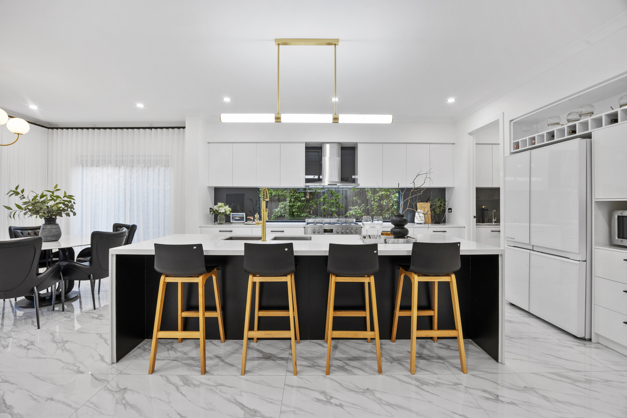 Step through a wide entrance hall framed by high ceilings and sleek designer tiles, leading to a private formal lounge perfect for quiet evenings. At the rear, the expansive open-plan living and dining area is complemented by a showstopping Caesarstone kitchen, complete with a statement island bench, soft-close cabinetry, walk-in pantry, and premium stainless steel appliances.
