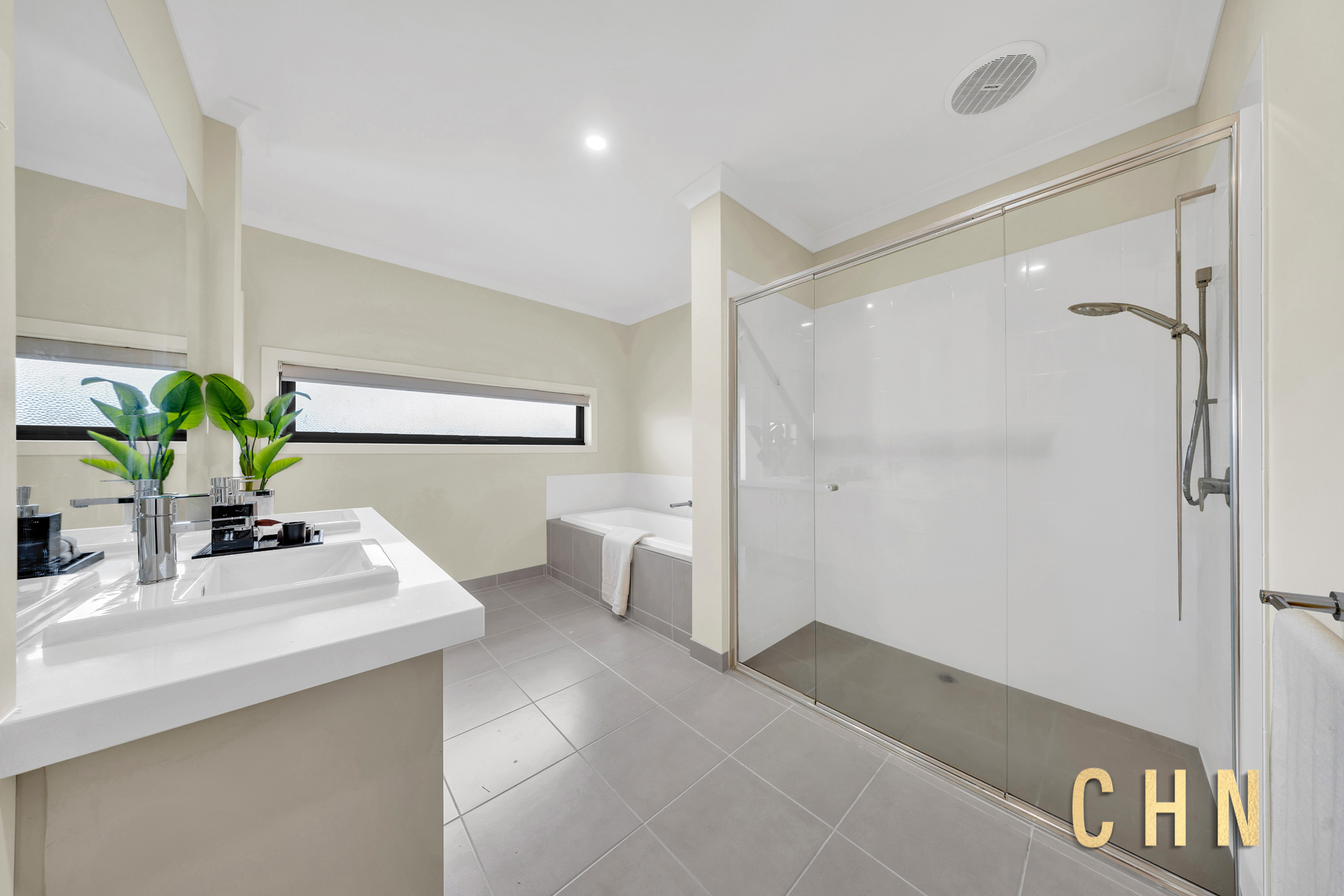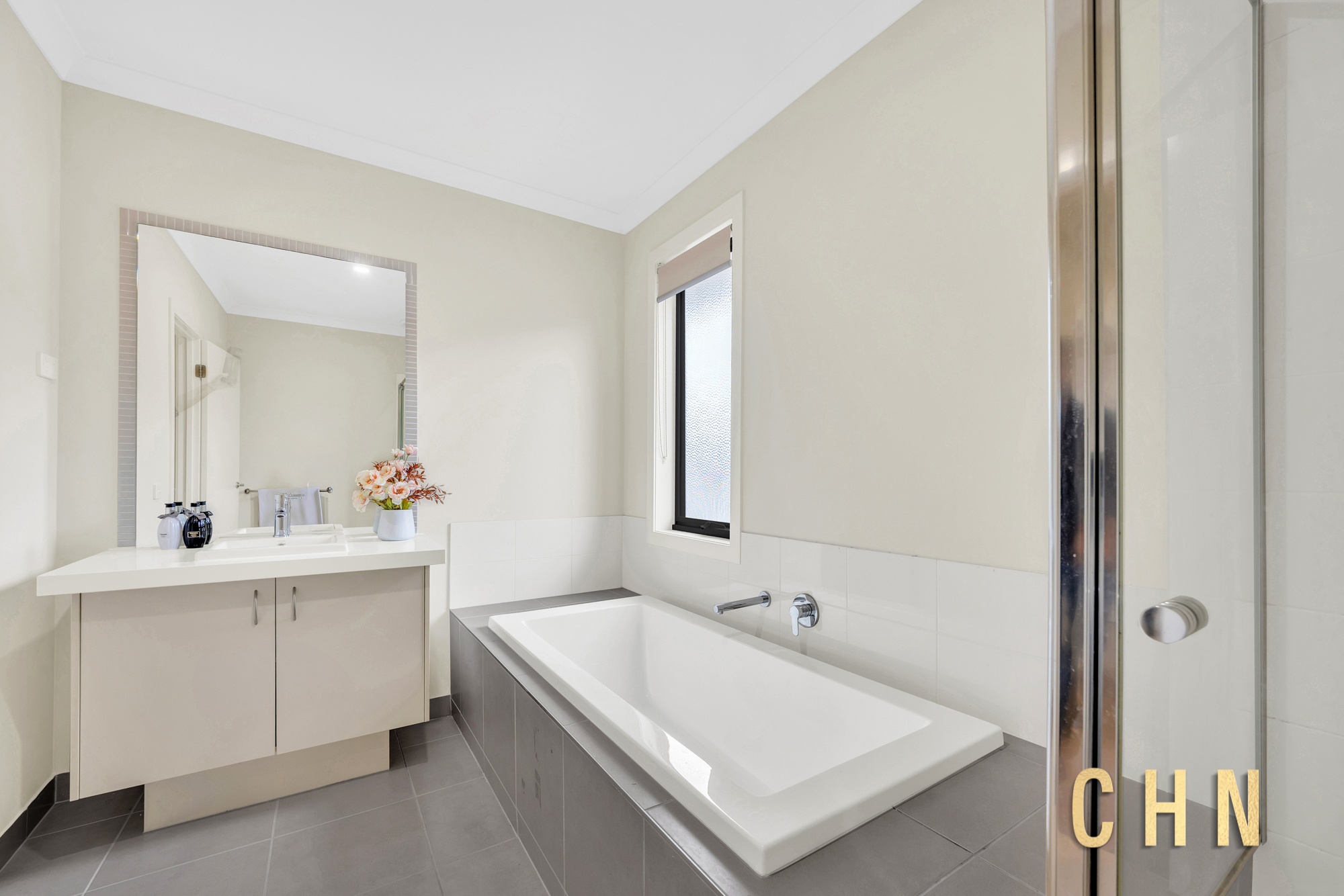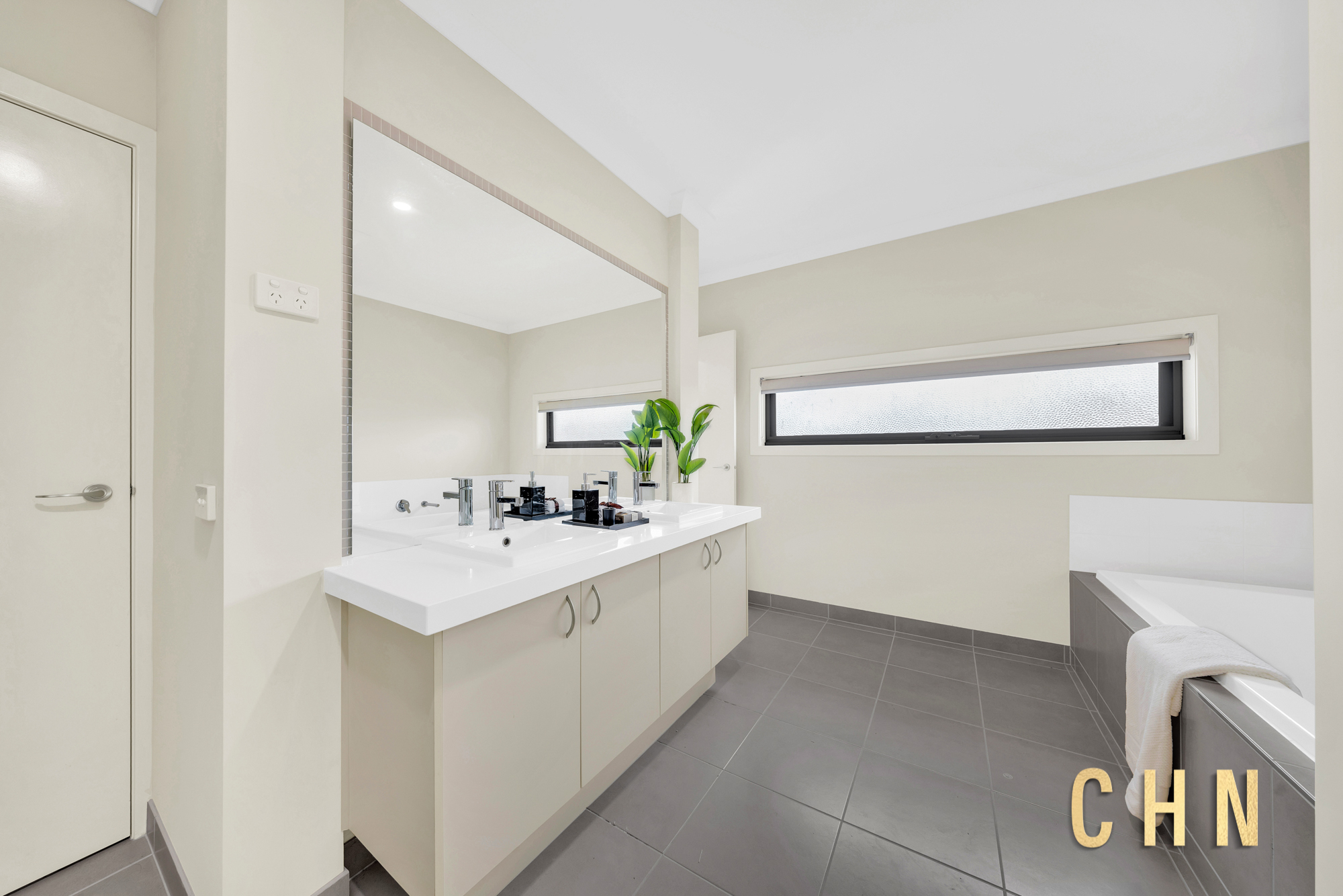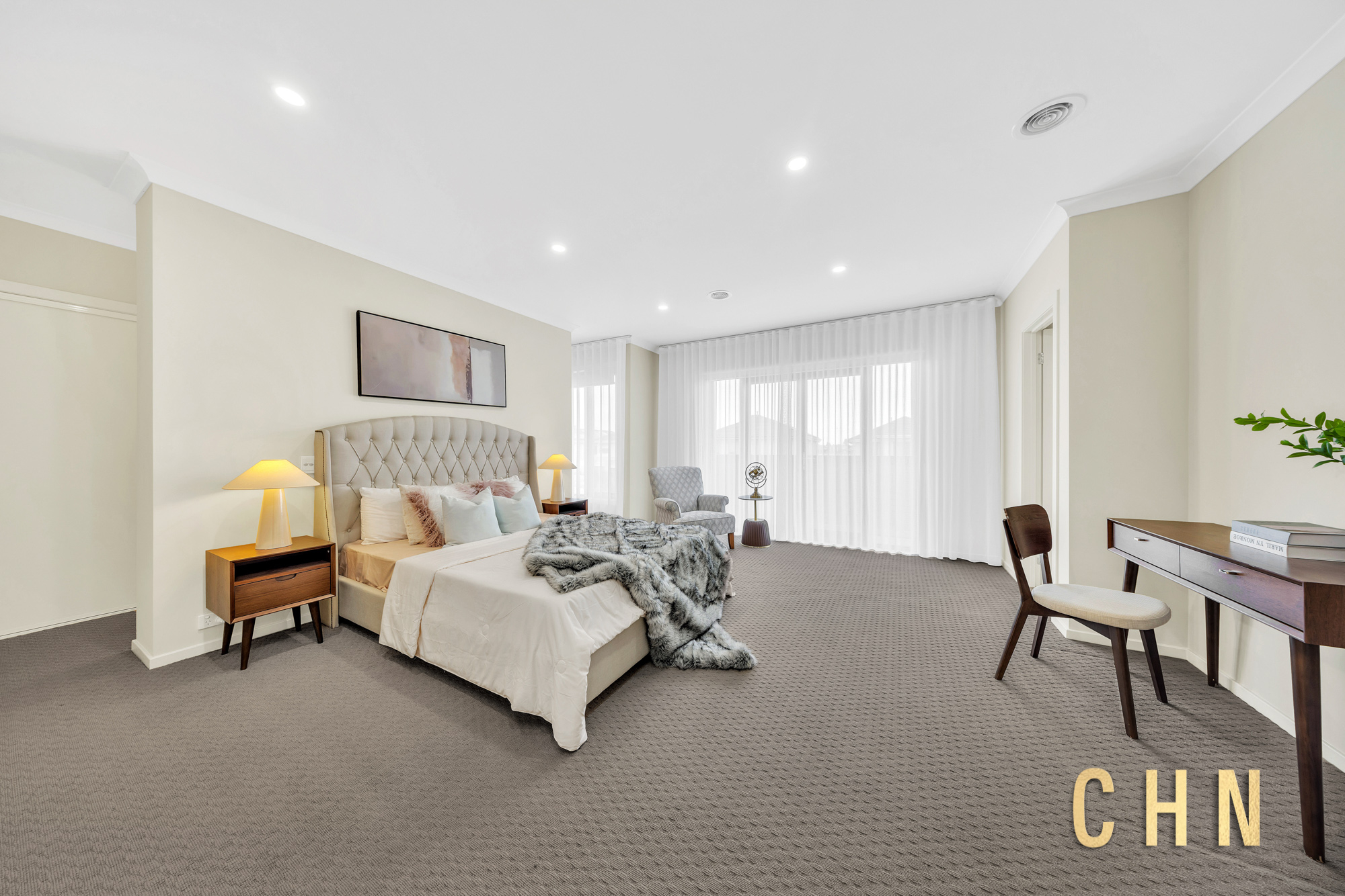 The supersized master bedroom is a luxurious retreat, boasting a large private balcony, concealed walk-through robe with four-panel sliding doors, and a lavish ensuite complete with a stone benchtop double vanity, oversized mirrored splashback, walk-in shower, sparkling bathtub, and enclosed toilet.