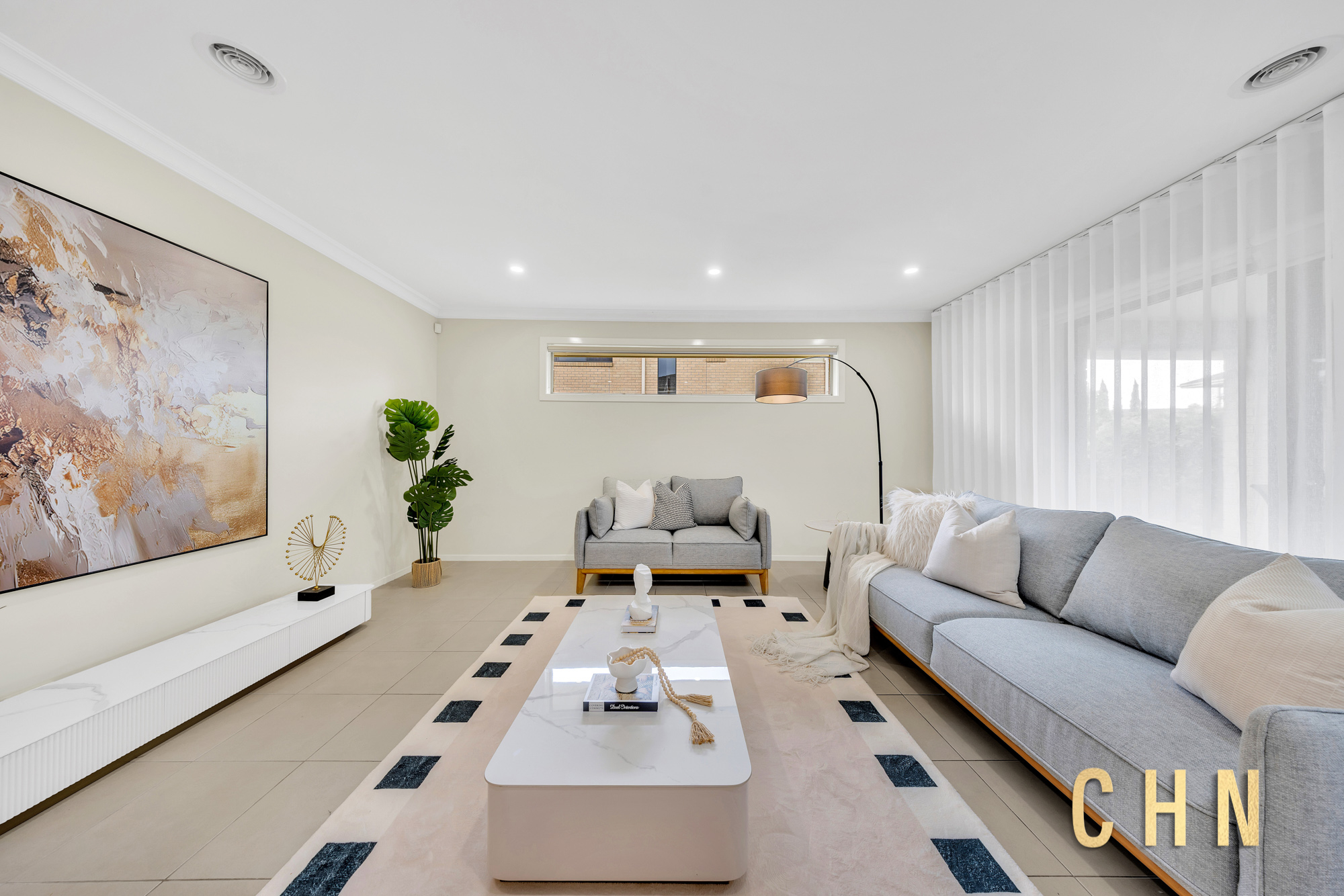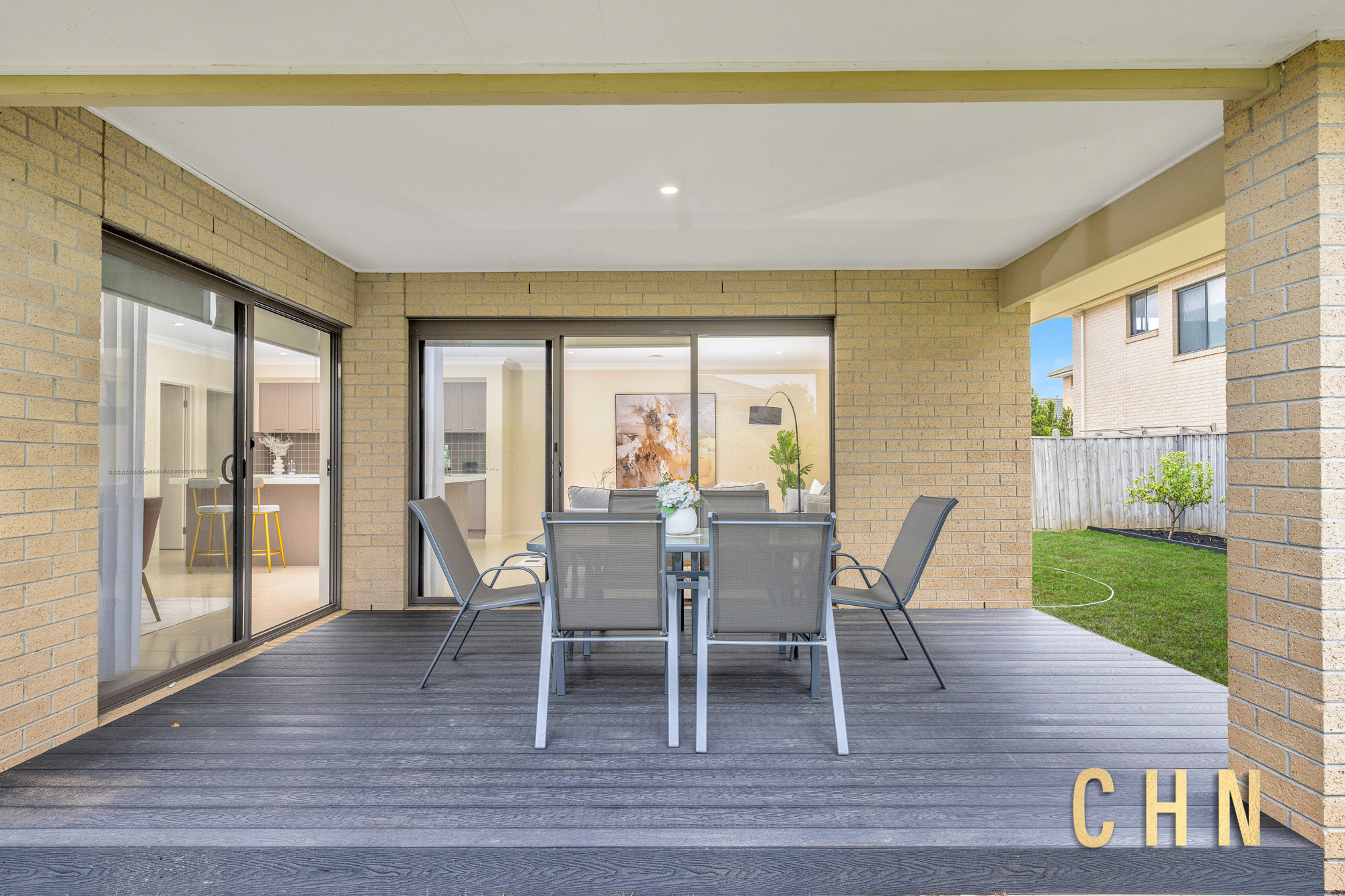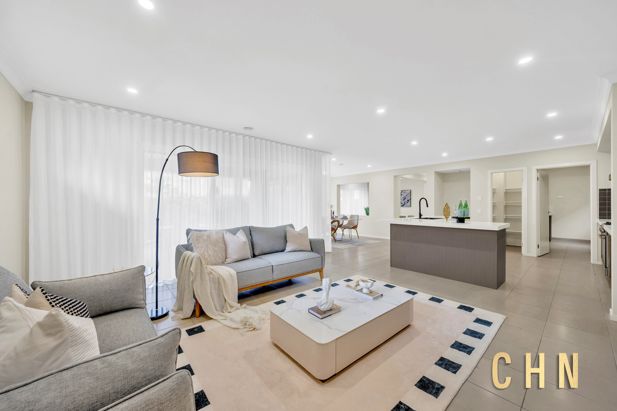 The spacious guest bedroom on the ground floor provides flexibility for multigenerational living or visiting guests. A large central lounge offers an ideal space for relaxation, while the open-plan living and dining areas seamlessly connect to the outdoors.