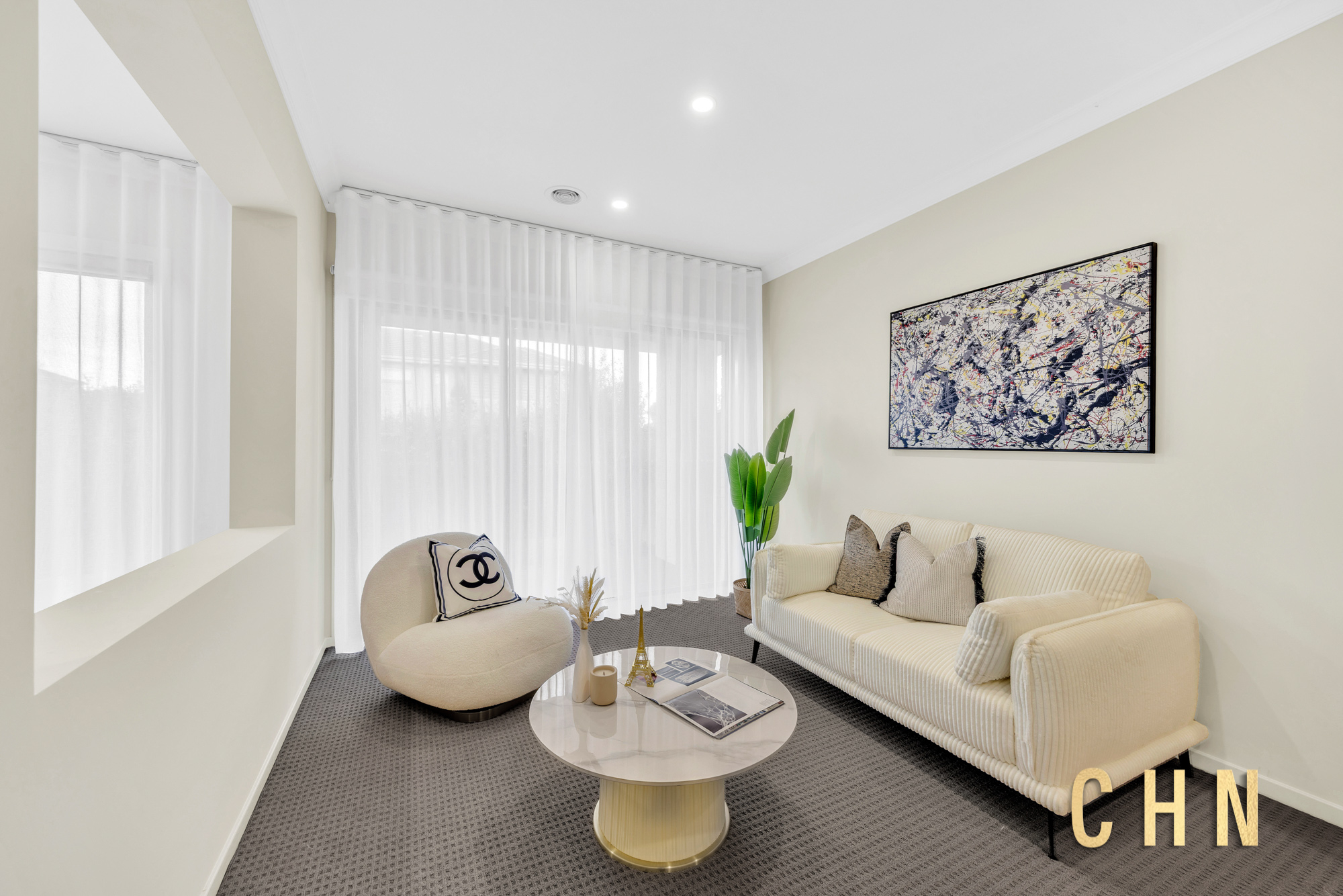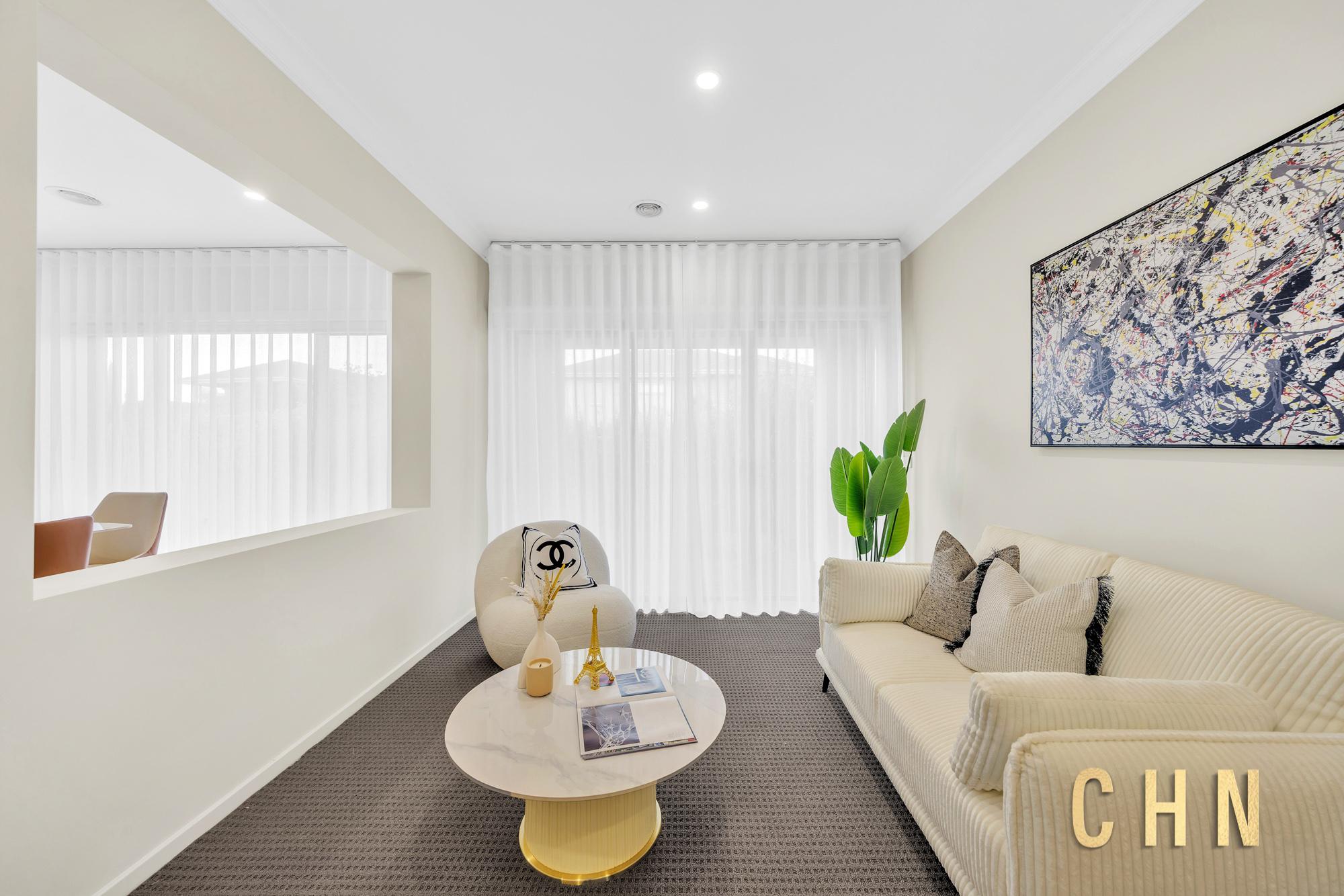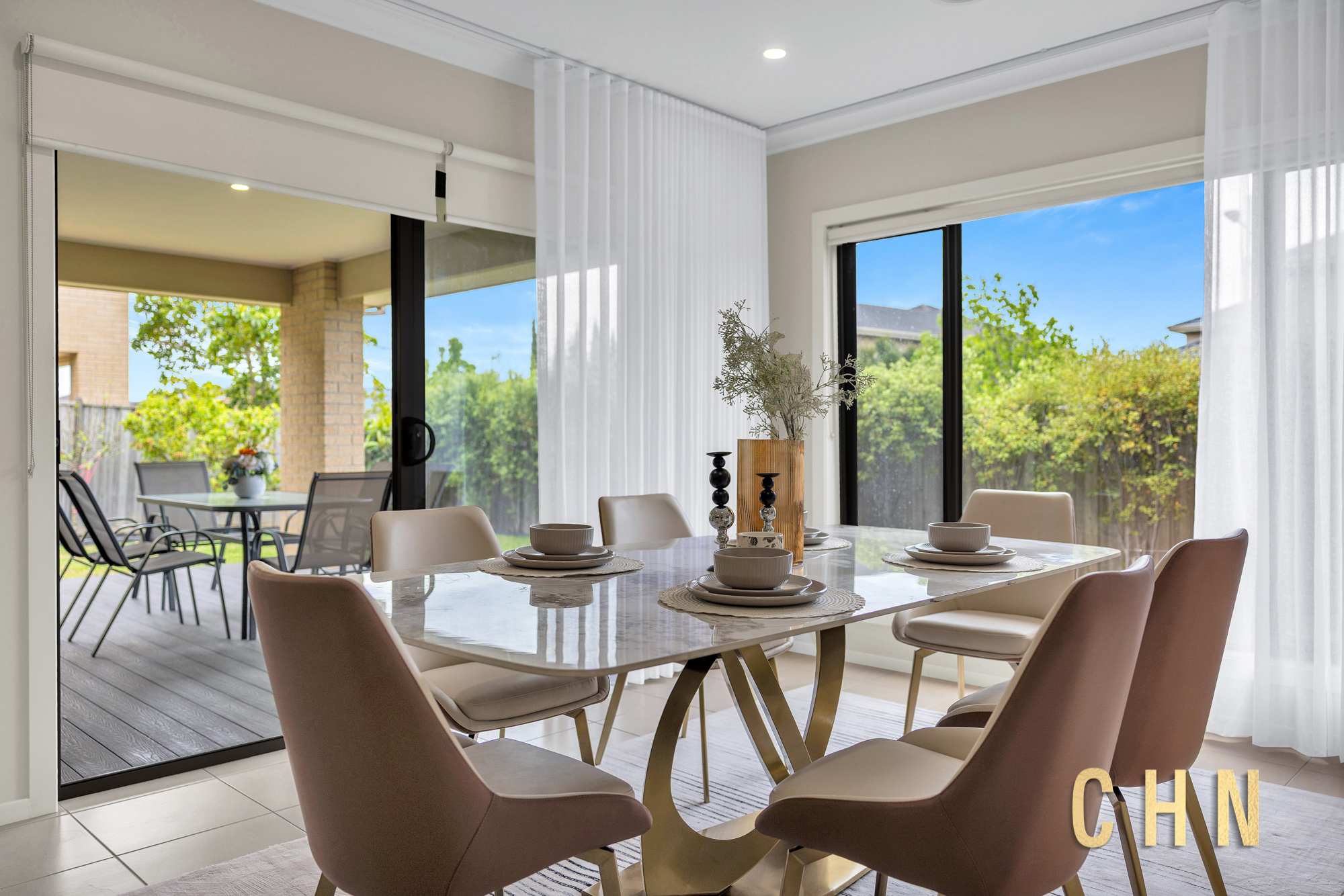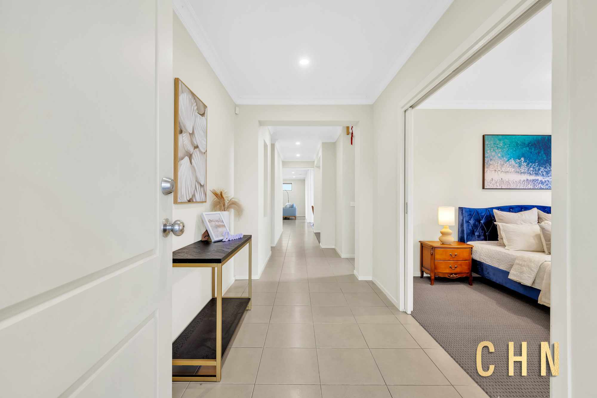 The spacious guest bedroom on the ground floor provides flexibility for multigenerational living or visiting guests. A large central lounge offers an ideal space for relaxation, while the open-plan living and dining areas seamlessly connect to the outdoors.