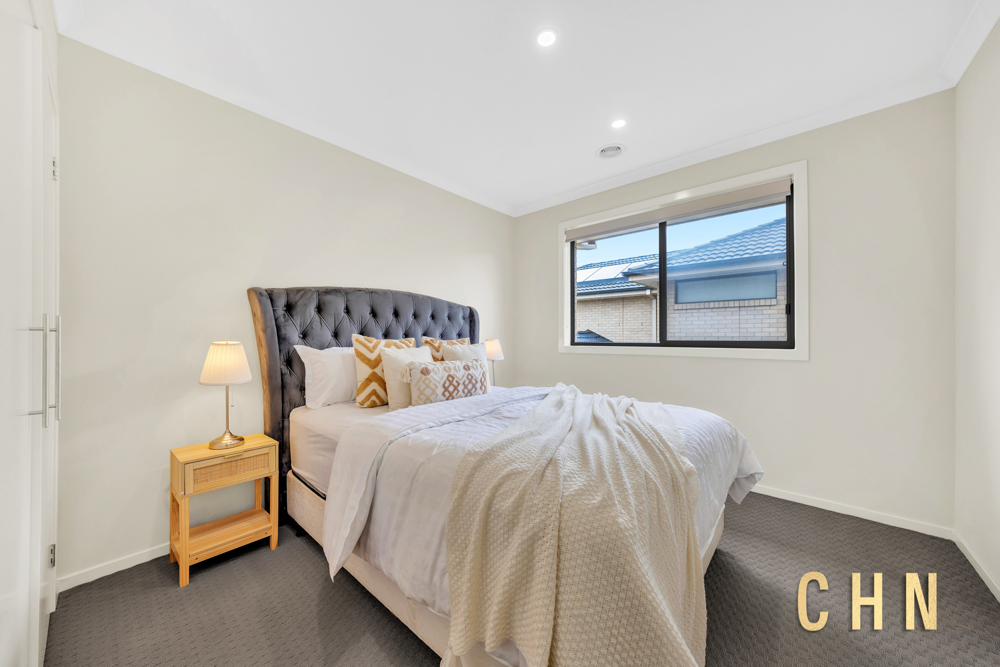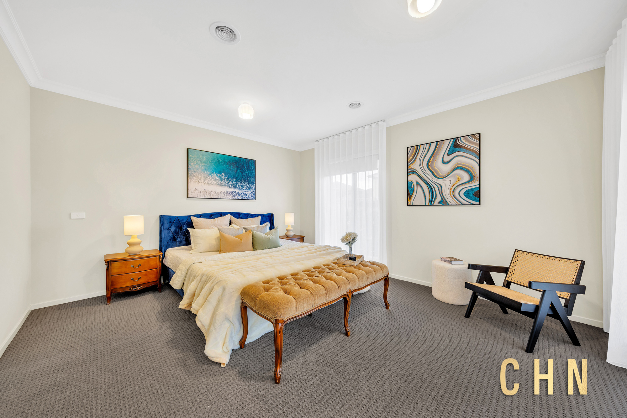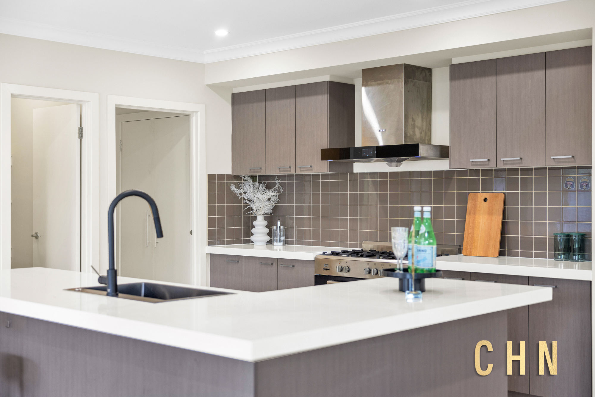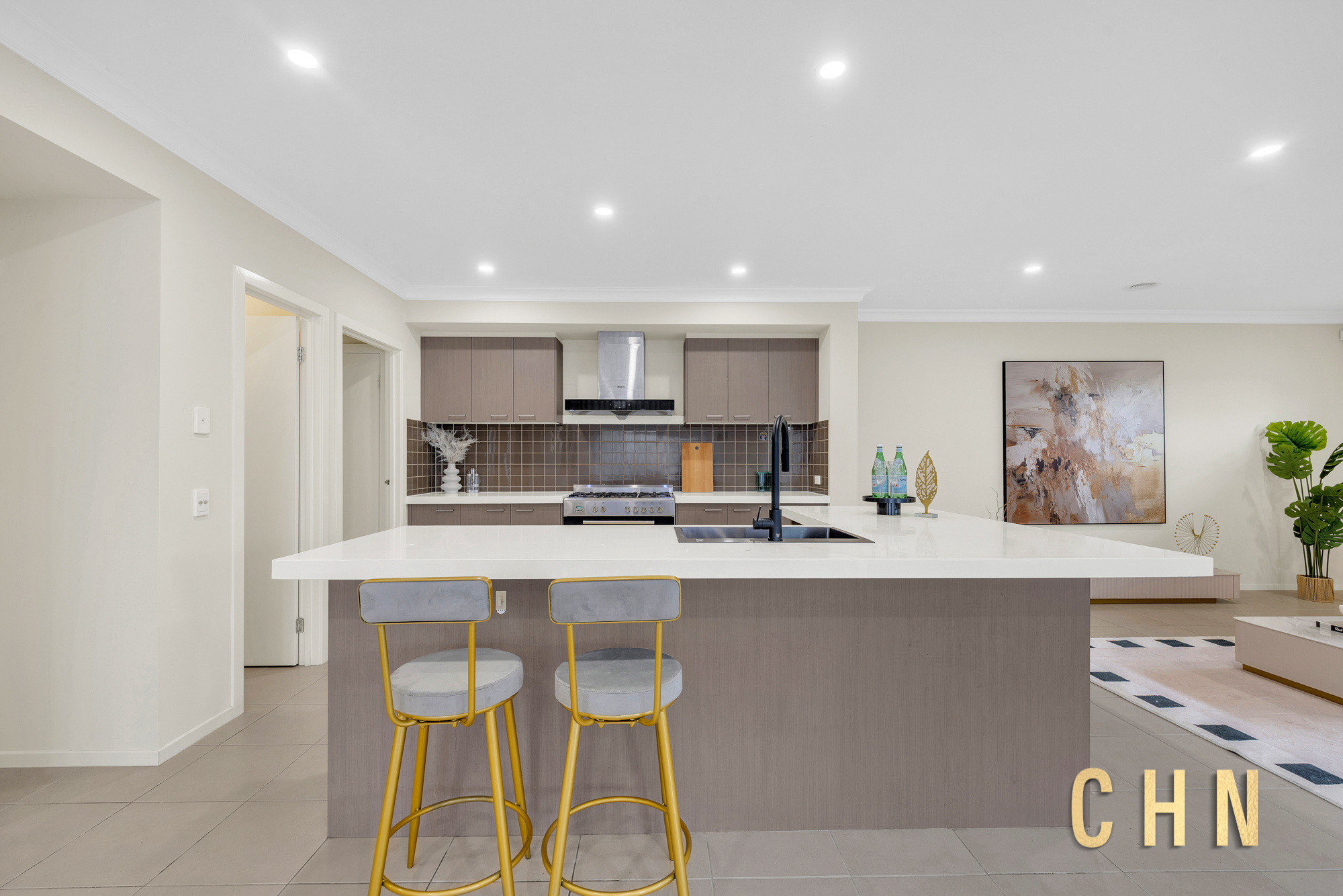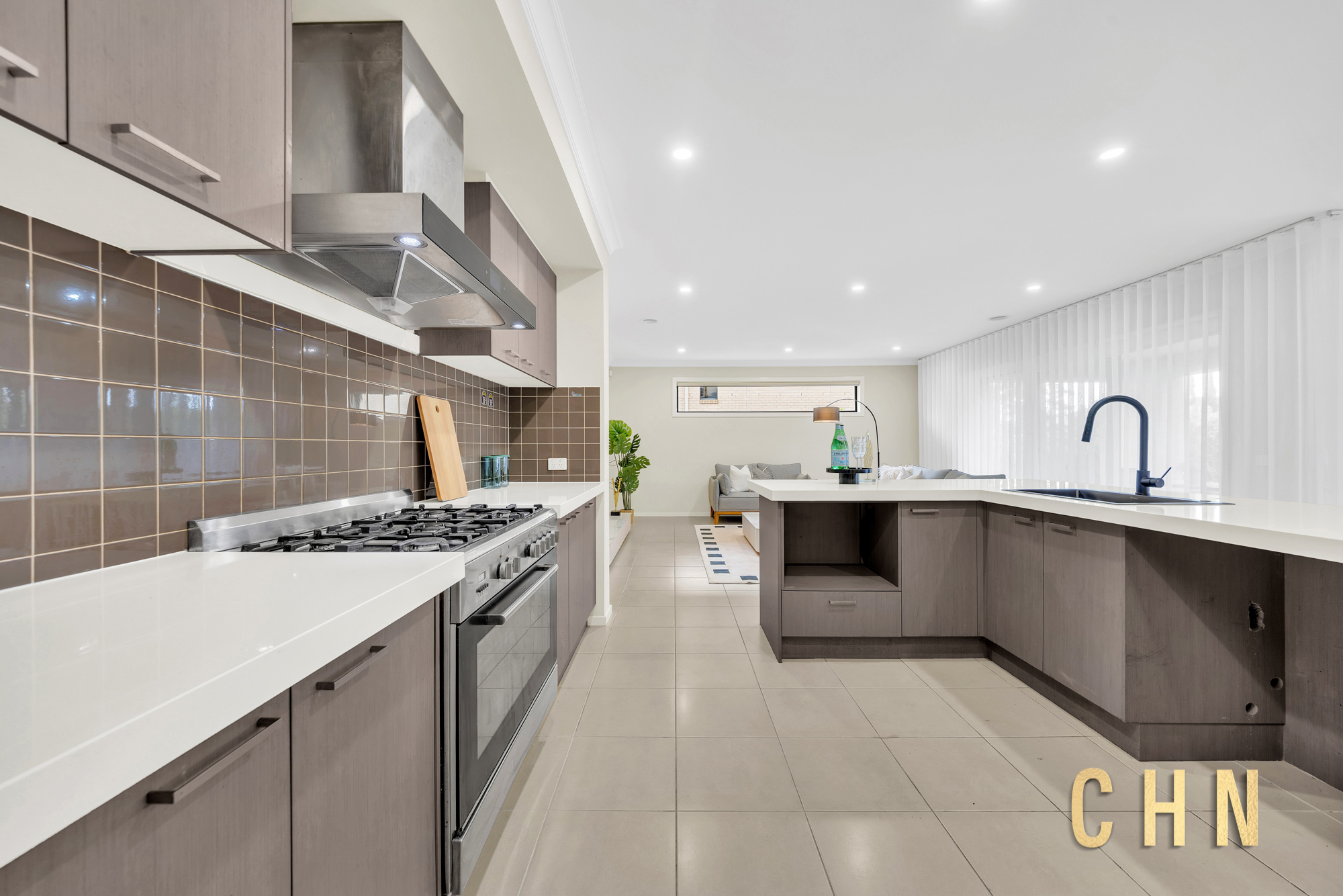 The chef’s dream kitchen is beautifully appointed with a thick stone benchtop L-shaped island, upgraded basin, 900mm freestanding gas appliances, tiled splashback, ample top and bottom cabinetry, and a generous walk-in pantry — perfect for those who love to cook and entertain. A full-size laundry with built-in broom and linen cabinets provides easy access to the backyard.