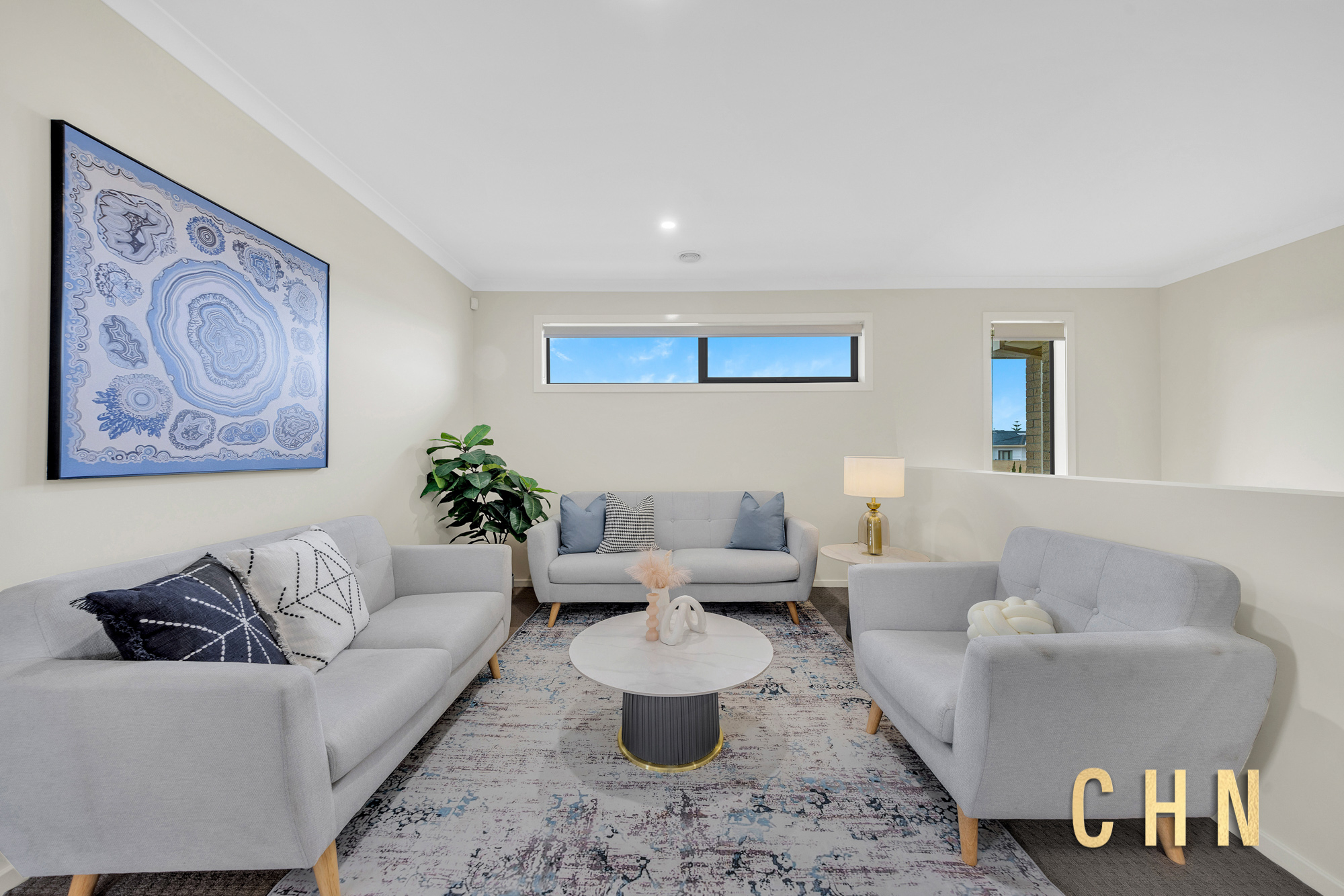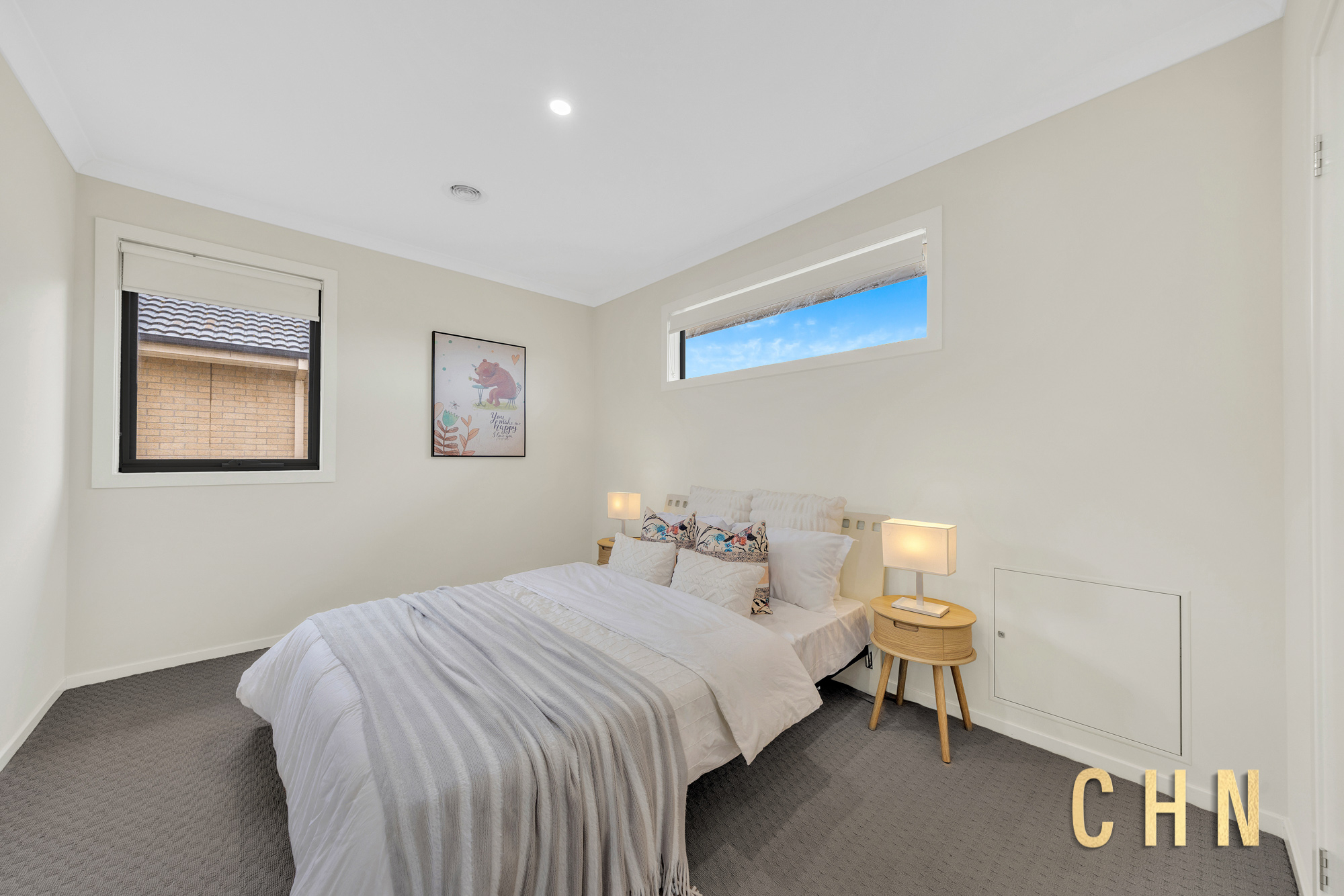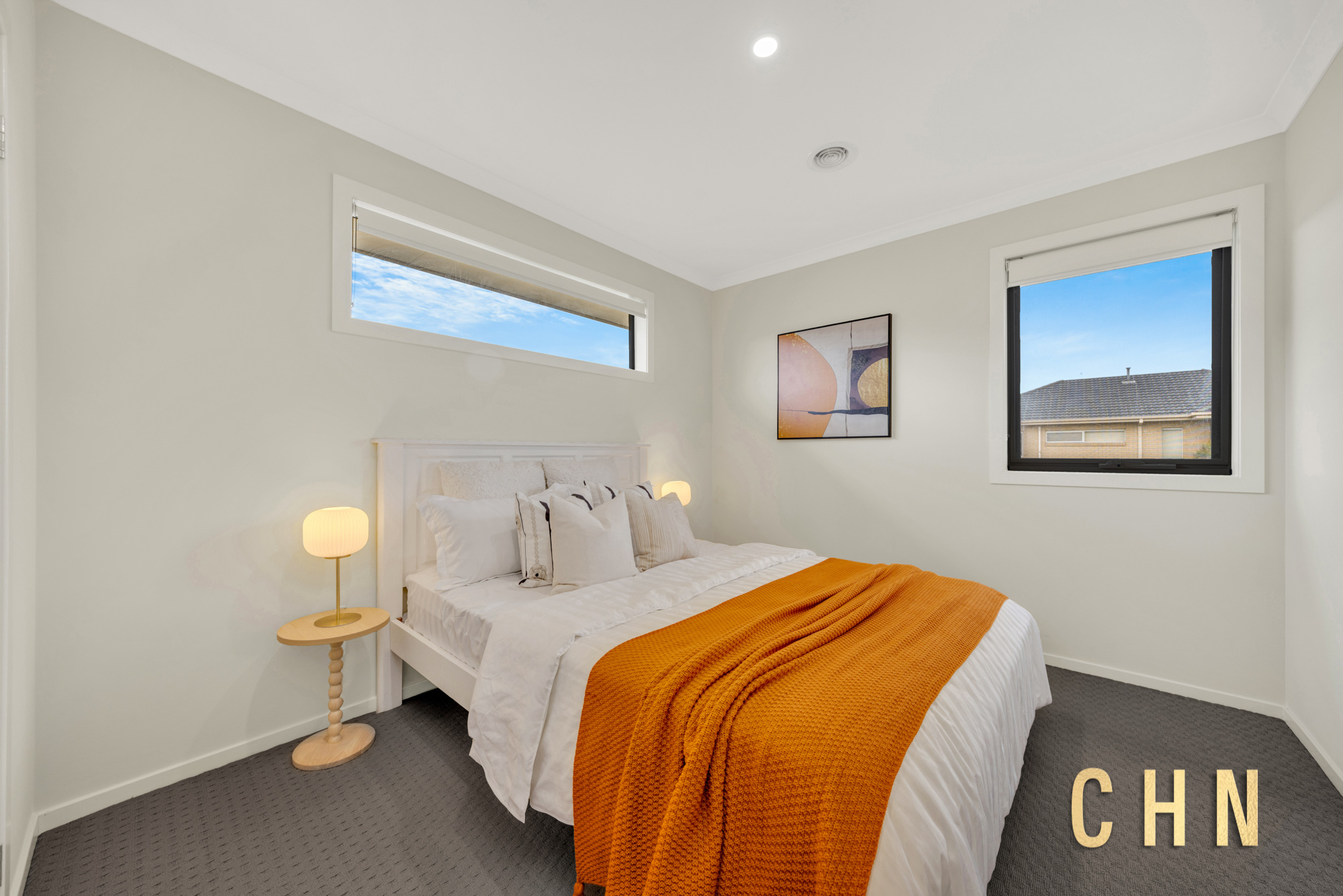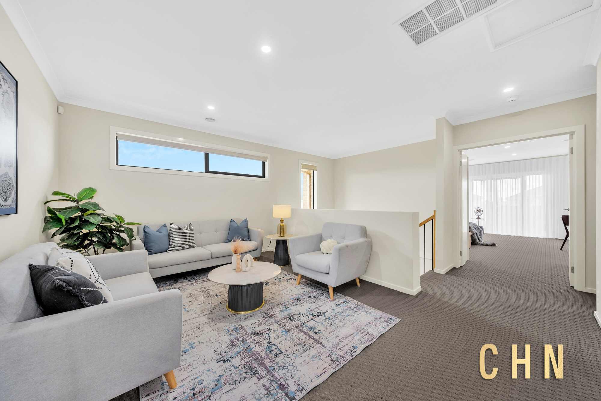 Upstairs, comfort continues with high ceilings, soft carpeting, and a bright family retreat area. The generous-sized bedrooms are equipped with built-in robes and plenty of natural light, serviced by a stylish central bathroom featuring a sparkling bathtub, walk-in shower, and stone benchtop vanity with mirrored splashback.
