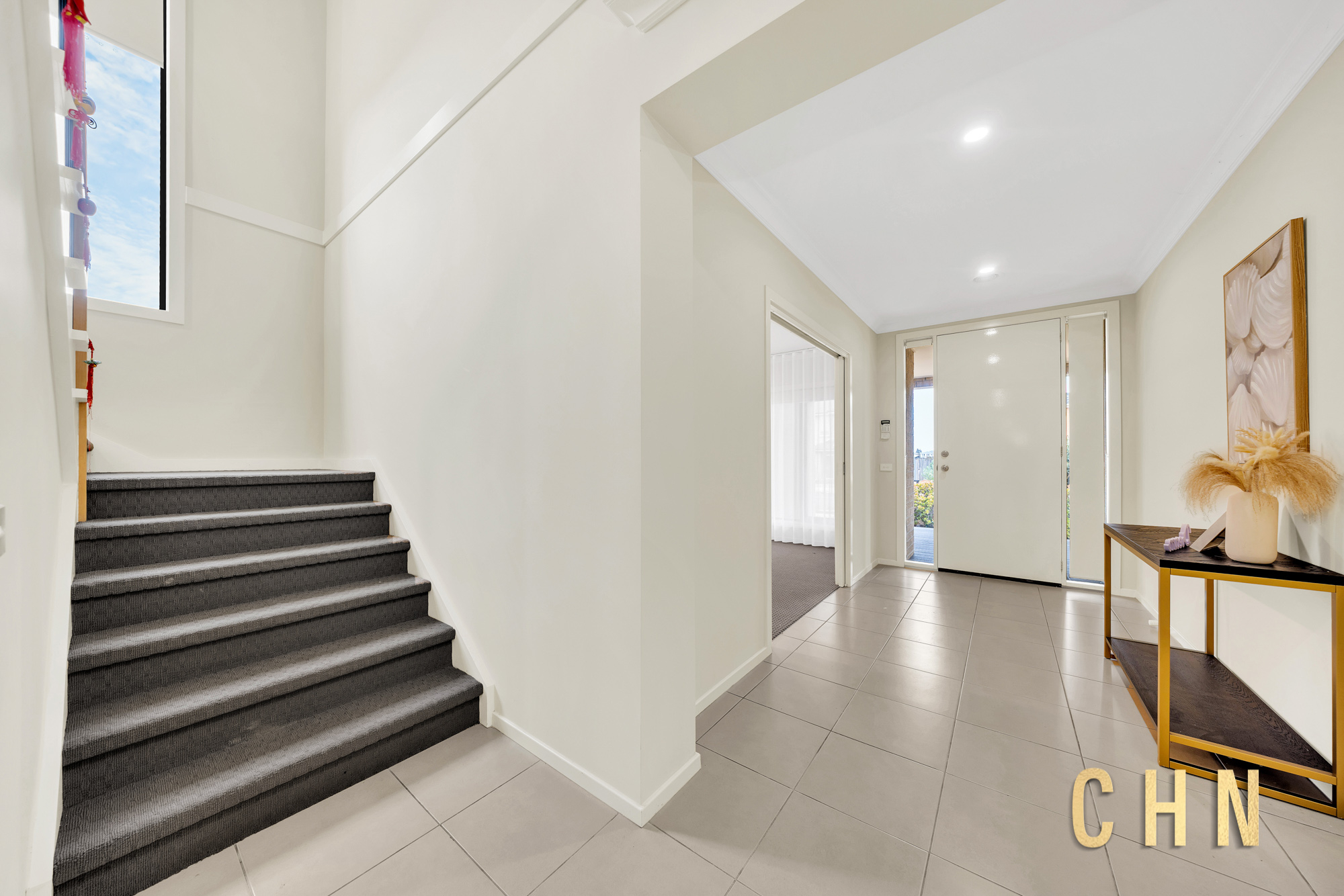 The property welcomes you with a low-maintenance landscaped front garden, a roofed front porch with elevated decking, and an upgraded tall front door. Step inside to discover high ceilings throughout the ground floor, LED downlights, and an inviting atmosphere that flows across the multiple light-filled living zones.