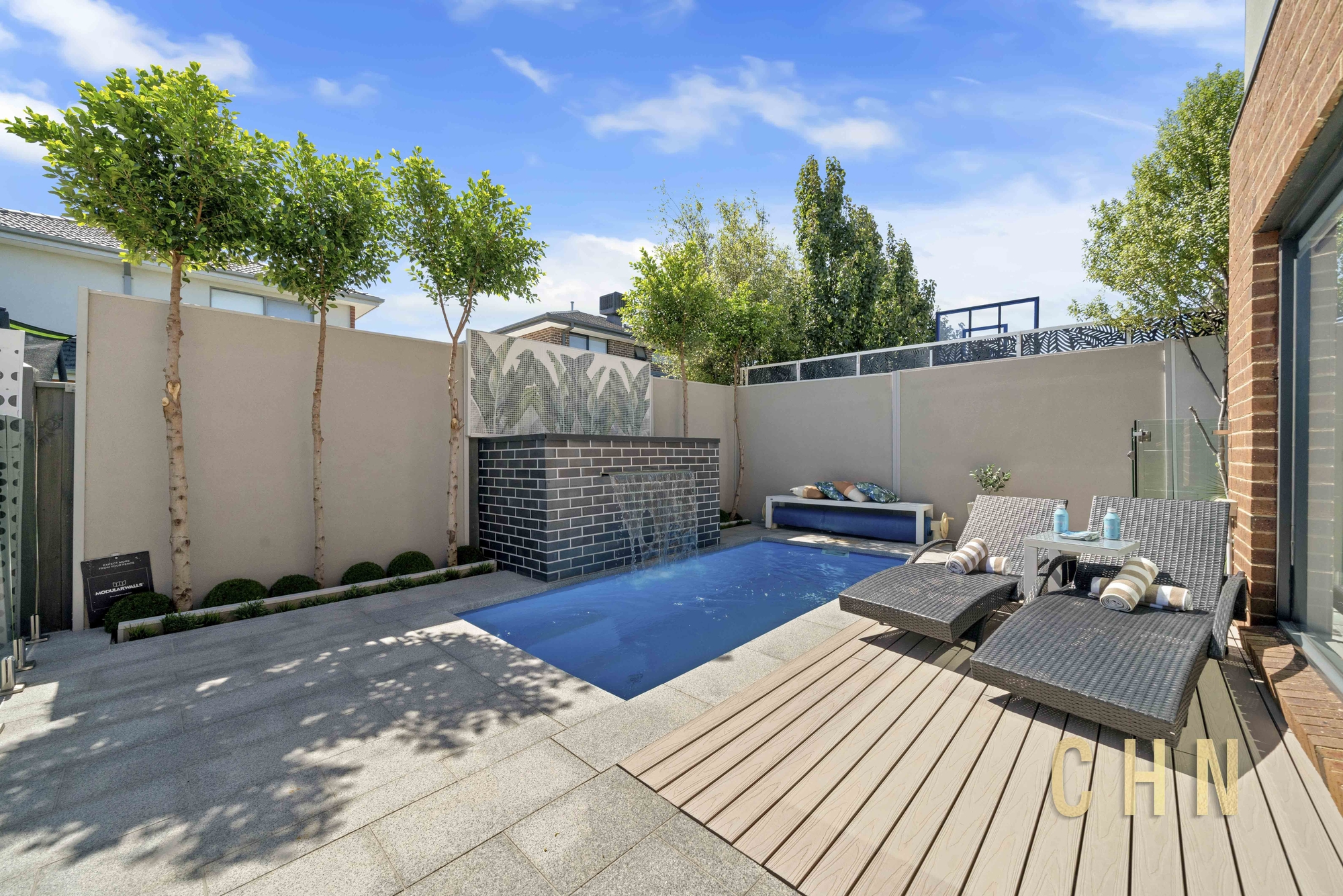 First impressions: Low-maintenance elegance greets you with artificial turf, a Zen-inspired water feature, and a sheltered porch leading to expansive decking.